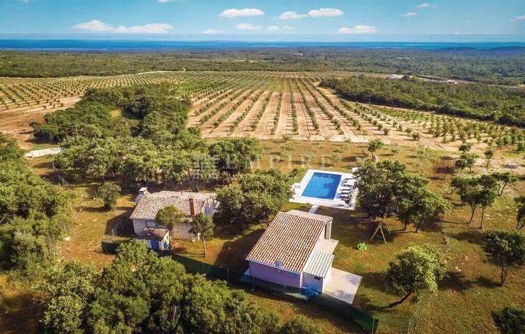 Spacious and idyllic estate surrounded by olive trees, stone, land, and untouched nature, spanning 21,163 m². The property includes two single-story houses with a total living area of 117 m². Both houses have an open-concept living room with a kitchen and dining area, a bedroom, a bathroom, and a covered terrace. The houses are airy and comfortable, creating a fantastic oasis in a world completely different from what we’re used to. A 58 m² pool with a sunbathing area offers uninterrupted peace, with the only sounds being bird chirping and the rustling of branches in the wind. Due to its secluded and peaceful location, this is an ideal opportunity for a quiet family life, relaxation, or as an investment for tourist rental purposes.