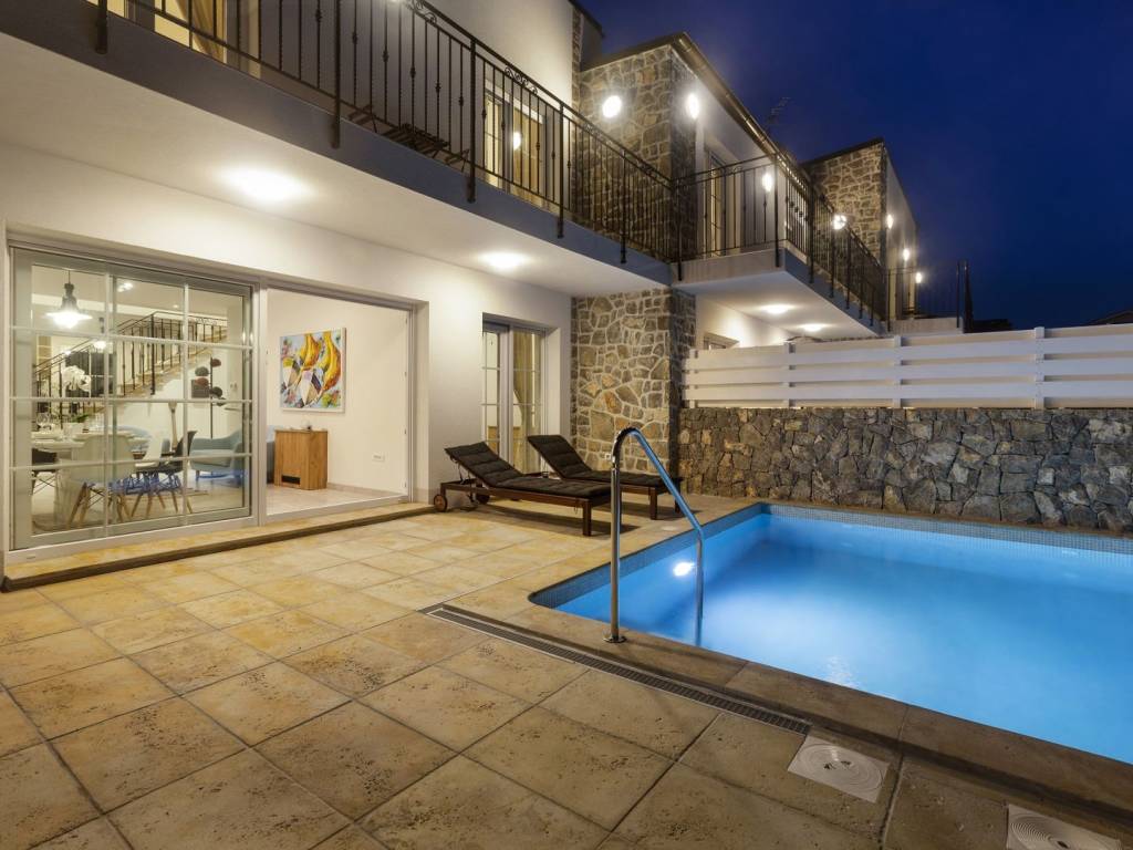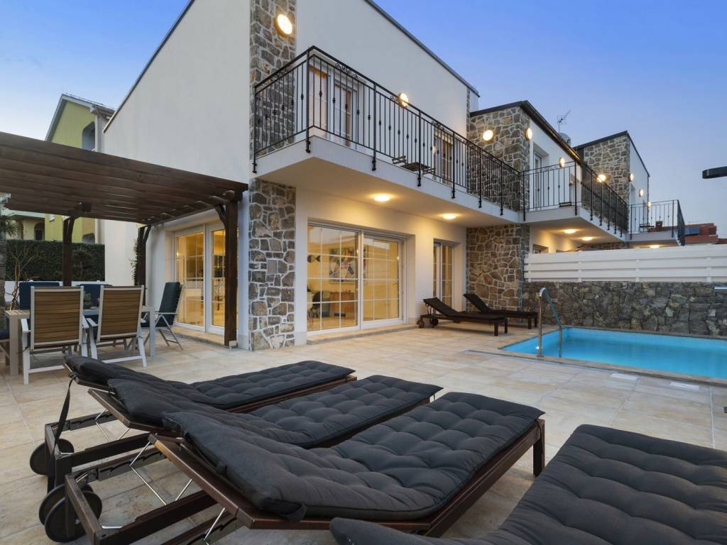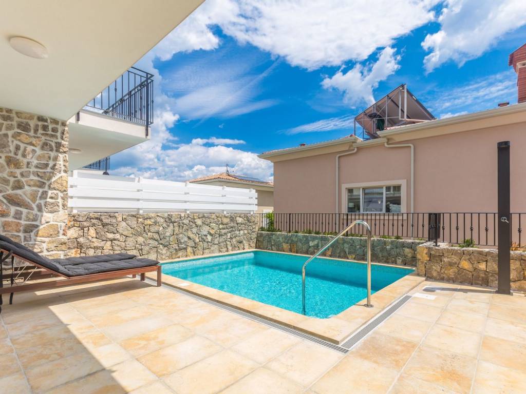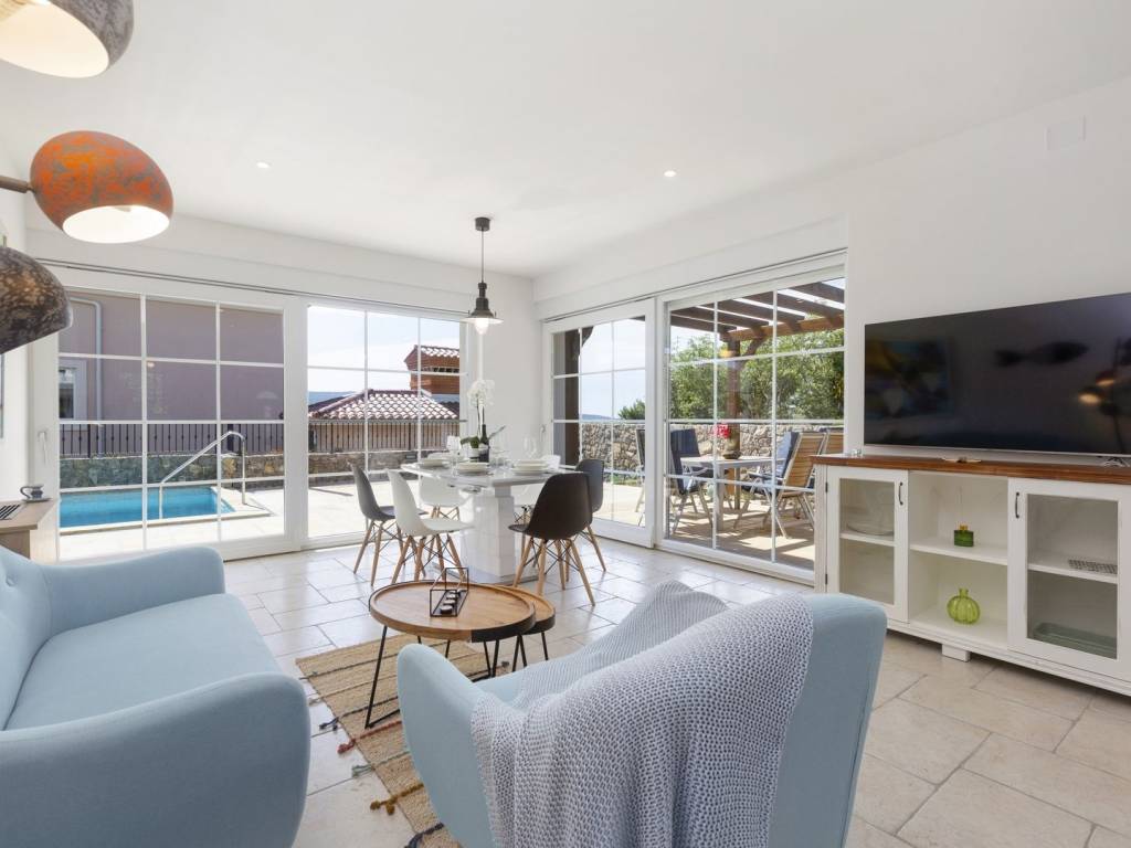 KRK - Modern villa with pool, garden and sea view Modern two-storey villa with pool, garden and sea view for sale. The entrance area leads to the living room with an open dining room. On the lower floor there is a hallway, kitchen, bathroom and bedroom. The living room opens onto a spacious terrace with a heated swimming pool and sun deck. On the upper floor, which is reached by internal stairs, there are two bedrooms with separate bathrooms and access to the terrace with a beautiful view of the sea. The engine room of the pool is large enough to serve as a storage room. The villa has underfloor heating with a heat pump, and is also fully air-conditioned. Two parking spaces belong to the villa, which are located in the fenced yard. The house is suitable both for a year-round stay and as an investment for tourist rental. The new owner can take over the well-established tourist rental business. The building is part of a concept of 3 villas in a row.