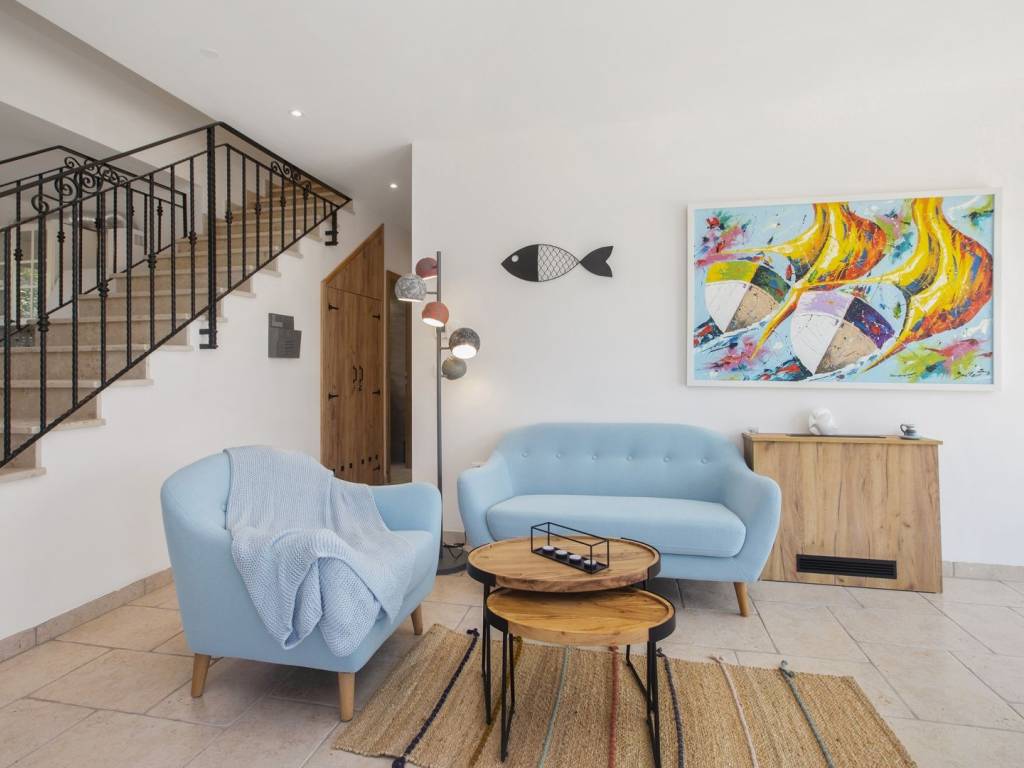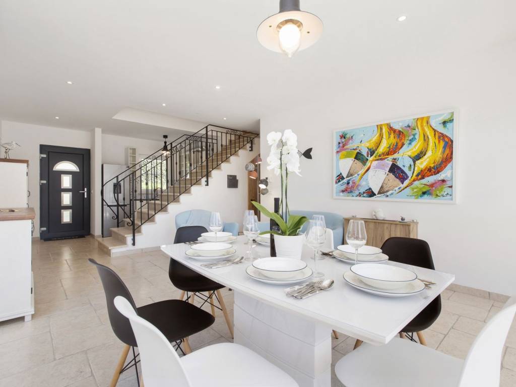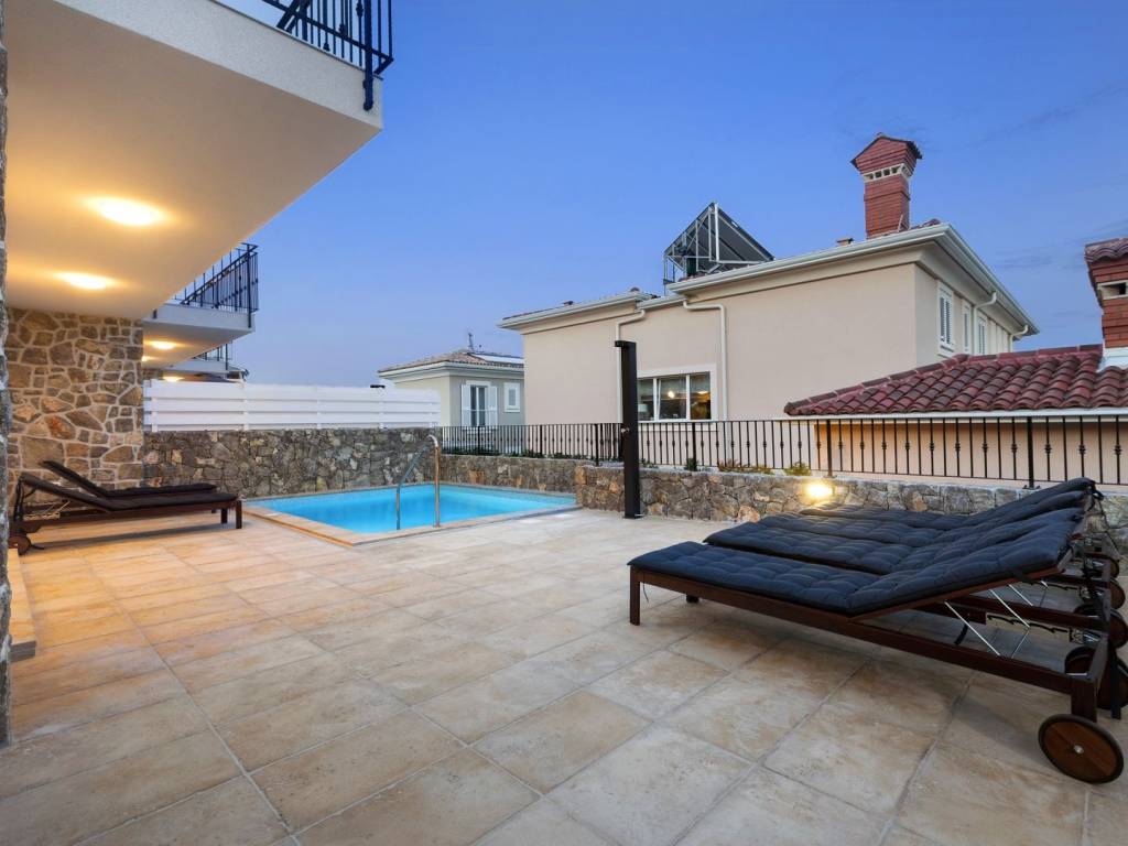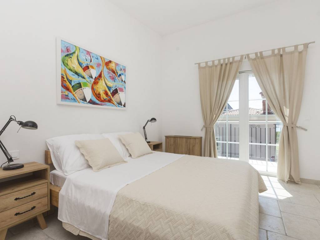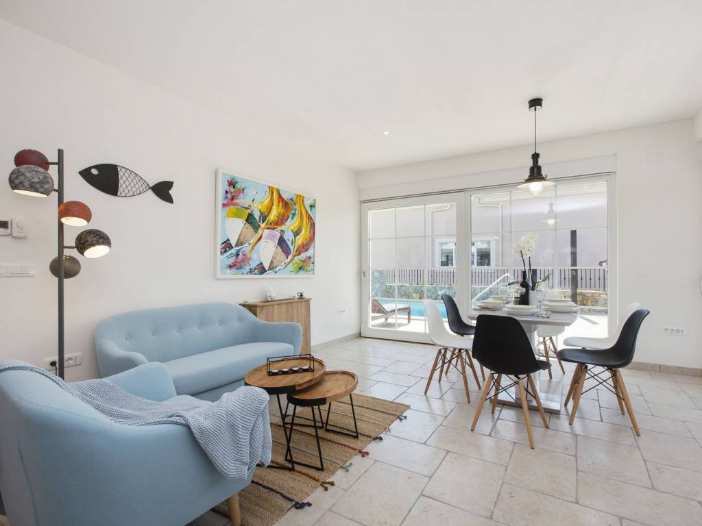 KRK - Modern villa with pool, garden and sea view Modern two-storey villa with pool, garden and sea view for sale. The entrance area leads to the living room with an open dining room. On the lower floor there is a hallway, kitchen, bathroom and bedroom. The living room opens onto a spacious terrace with a heated swimming pool and sun deck. On the upper floor, which is reached by internal stairs, there are two bedrooms with separate bathrooms and access to the terrace with a beautiful view of the sea. The engine room of the pool is large enough to serve as a storage room. The villa has underfloor heating with a heat pump, and is also fully air-conditioned. Two parking spaces belong to the villa, which are located in the fenced yard. The house is suitable both for a year-round stay and as an investment for tourist rental. The new owner can take over the well-established tourist rental business. The building is part of a concept of 3 villas in a row.