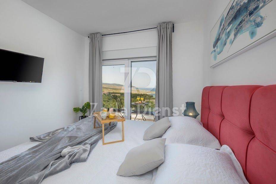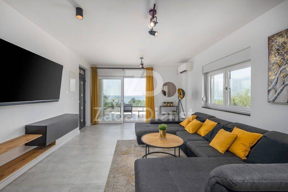 On the ground floor of each apartment there is a modernly decorated kitchen, with all the necessary amenities. The center of the kitchen is dominated by an attractive kitchen island and right next to it is a dining table for six seats. This villa also has an outdoor dining area that has 12 seats and is certainly the right place to enjoy culinary specialties outdoors. The spacious living room leads directly to the outdoor terrace that has access to the pool.