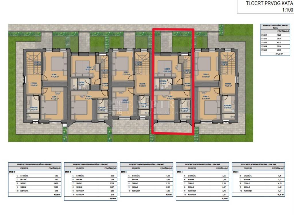 All the houses are multi-story, with the ground floor being the most spacious, featuring two or three exits to the garden. Three houses are two stories high, while two smaller middle houses have only one floor above the ground floor. The living space varies from 83 m² to 155 m², and the garden area ranges from 50 m² to 175 m², depending on the house. Three larger units have a third bedroom on the second floor, with a large roofed balcony as a special luxury addition.