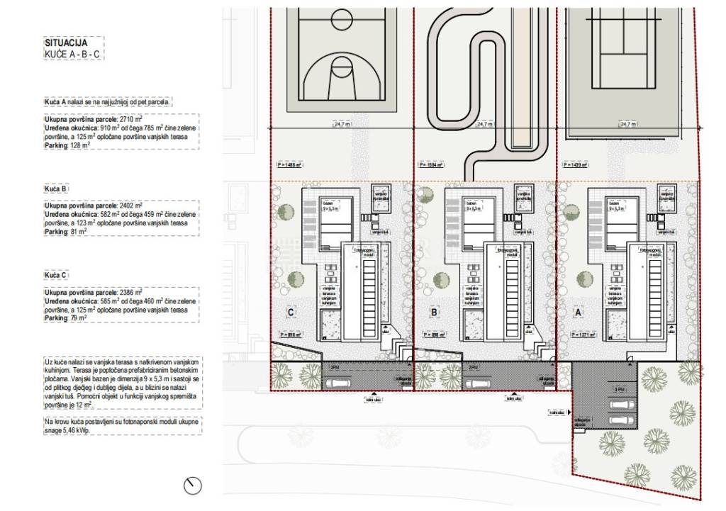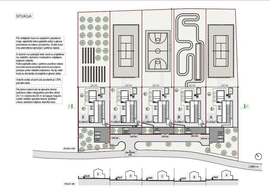 The northern yard of each villa (24.7 m wide and 60 m long) offers space for the creation of sports courts, playgrounds, or gardens according to the owner's preferences.