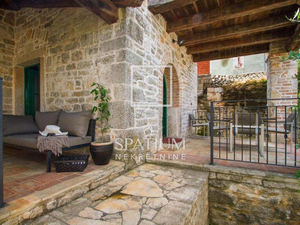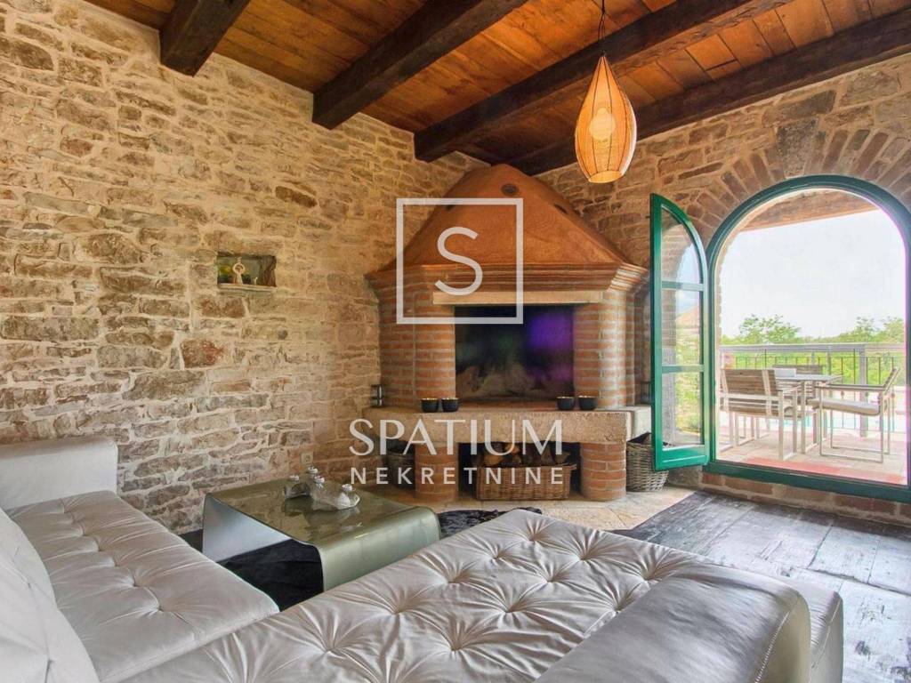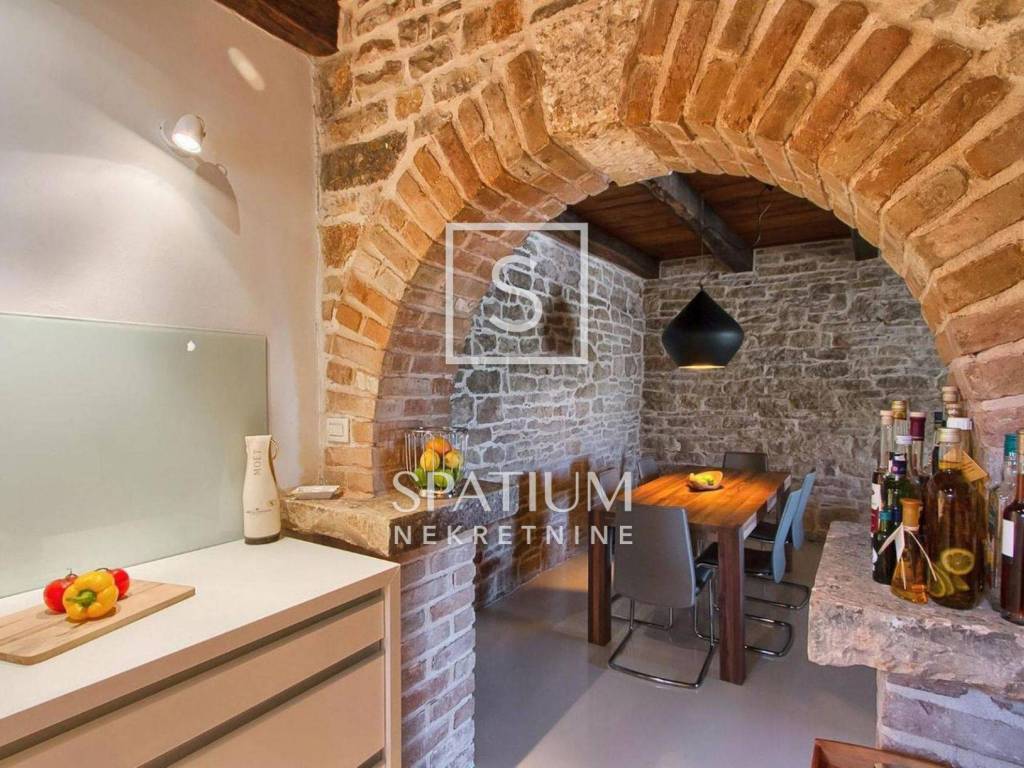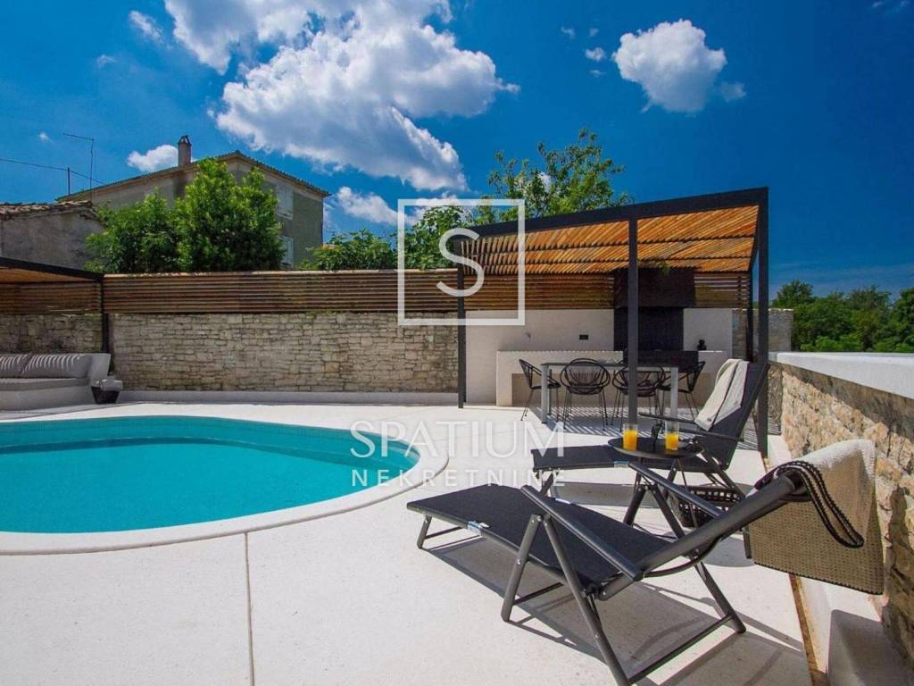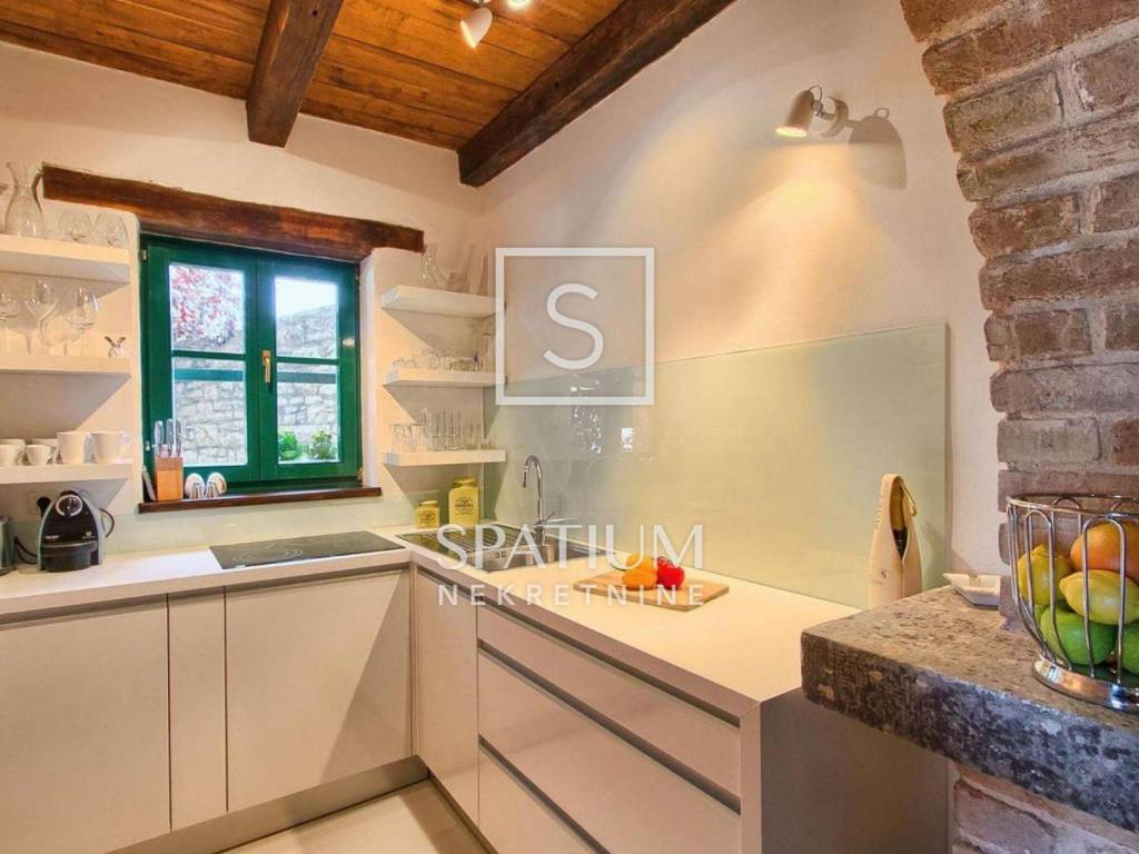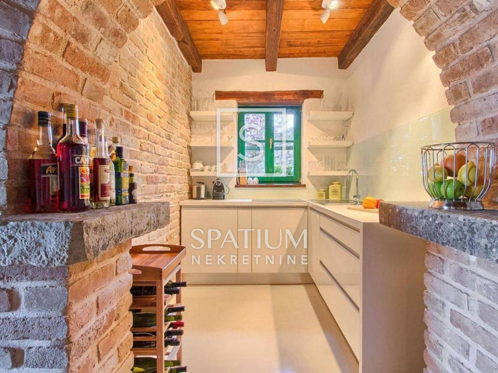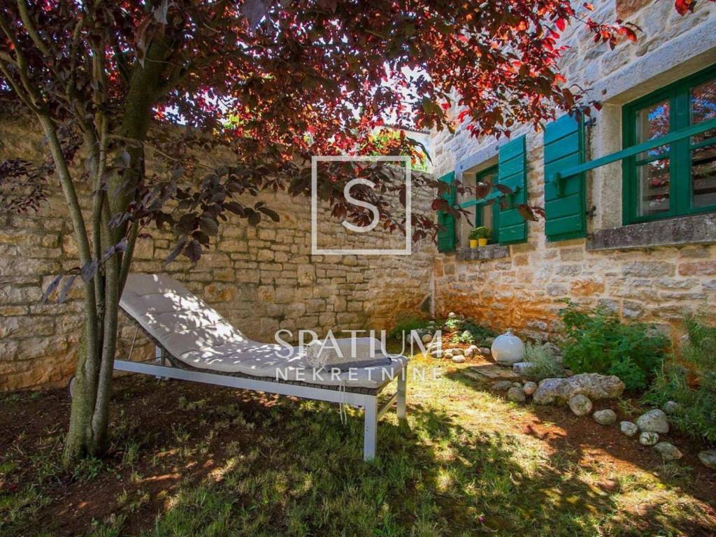 TINJAN, SURROUNDINGS, we are pleased to present a stone villa of 120 m², carefully reconstructed with great attention to detail. Combining modern design with traditional Istrian lifestyle, the villa exudes warmth and authenticity. Special care was given to the use of original materials – most of the walls are clad with old stone, while the interior reflects refinement and comfort. The ground floor consists of a fully equipped kitchen, dining room, spacious living room with fireplace, and a guest toilet. The upper floor offers two bedrooms with double beds, one of which has a terrace with panoramic views, as well as a luxuriously equipped bathroom. The 382 m² garden fully highlights the Mediterranean character of the villa – a well-maintained lawn, an old olive tree, and carefully designed details create an idyllic ambiance. The villa features private parking for two cars and is fully fenced, while the outdoor pool, clad in high-quality Italian tiles, is complemented by a summer kitchen with barbecue, terrace, outdoor shower, and a comfortable lounge area for relaxation.