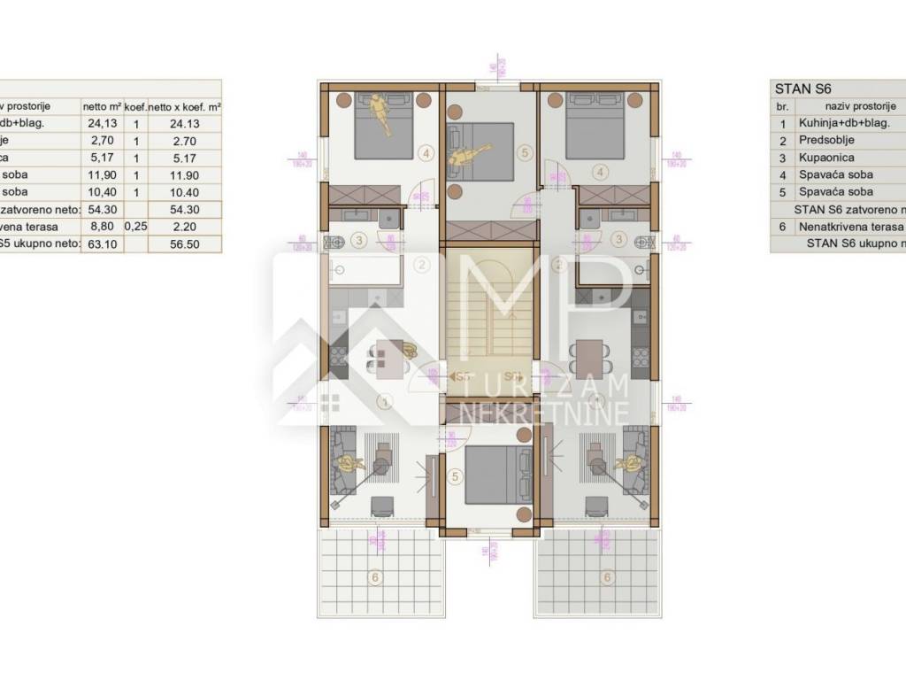 For sale is apartment S5 on the 2nd floor, with a total area of 56.50 m². It consists of a kitchen with living and dining area, hallway, two bedrooms, a bathroom, and an uncovered terrace. The apartment includes one parking space.