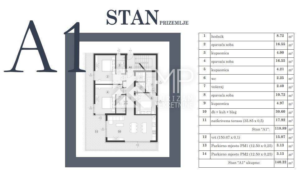 The property in question is located on the ground floor of building A, marked "A1", with a total area of ​​118.89 m2, and consists of: hallway, living room + kitchen + dining room, 3 bedrooms, each with its own bathroom, laundry room, additional toilet and covered terrace.