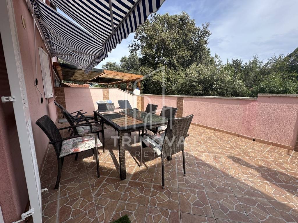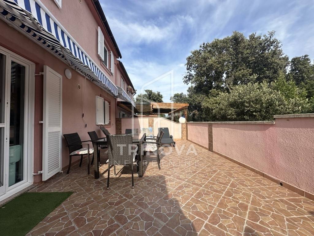 The ground floor apartment has an area of 50 m² and consists of a kitchen with dining and living area, bathroom, hallway, and two bedrooms. It provides access to two spacious terraces. The first-floor apartment, accessed via external stairs, has an area of 57 m². It includes a kitchen with dining and living area, a loggia, two bedrooms, a hallway, and a bathroom.