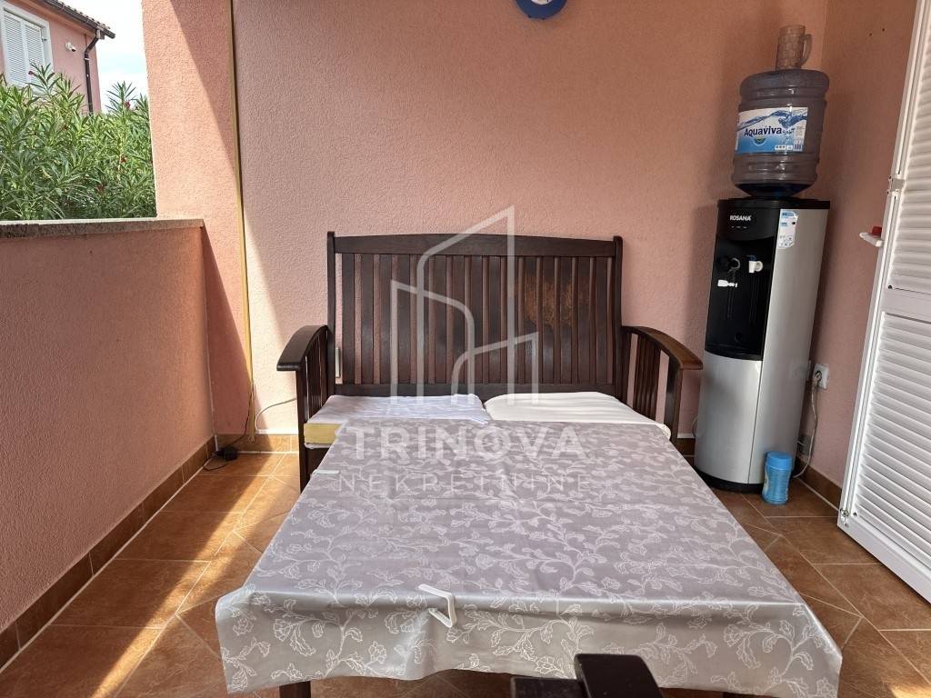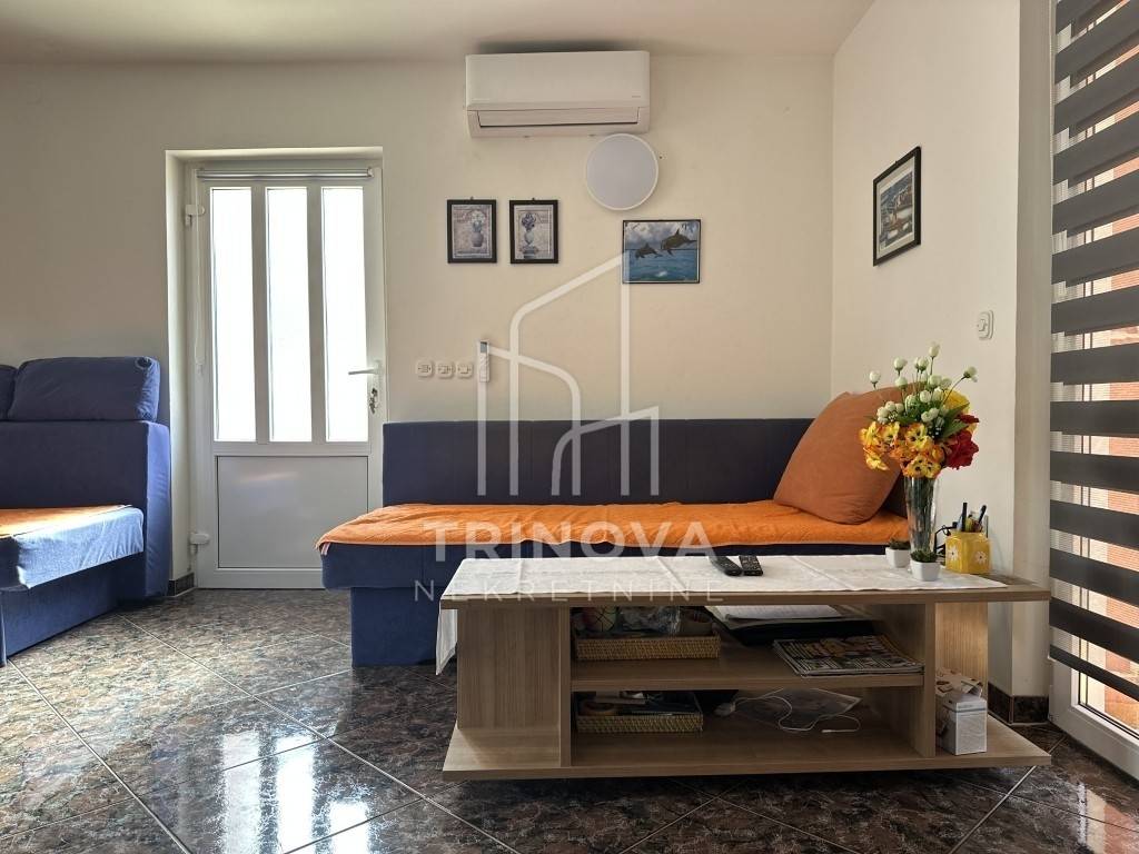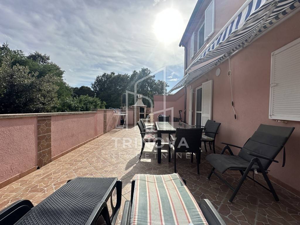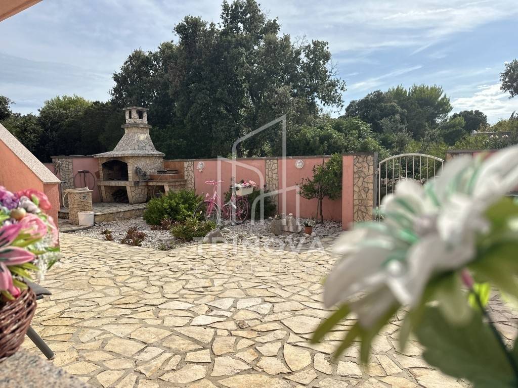The facade is finished, and the windows are PVC with insect screens. Each apartment is equipped with an air conditioning unit in the living room. The house was built in 2014, is well-maintained, and in good condition. It is being sold fully furnished. The property is connected to a septic tank, and on Silba, water is collected in cisterns. This half of the house has its own cistern, separated from the other half, with a capacity of 55 m³, which is more than sufficient during the summer months. The yard is landscaped, partially paved, and includes a barbecue and outdoor shower.
