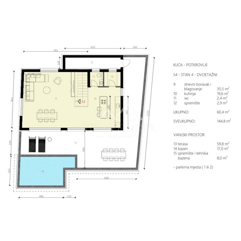 Luxury duplex apartment with infinity pool and spectacular view of the Adriatic - Mandre, island of Pag 3 bedrooms - large terrace - swimming pool 17 m² - top quality new construction A unique duplex apartment is for sale in Mandre, island of Pag, located in a modern and exclusive new building. The property is designed for those looking for top comfort, luxury and a breathtaking panoramic view. With a private infinity pool of 17 m² and a spacious terrace of 59.8 m², the apartment offers absolutely everything for enjoyment at the highest level - whether you are looking for a home for yourself, a luxury holiday home or a high-end rental investment. Basic characteristics: Duplex apartment - optimal layout for maximum functionality and privacy Total of 3 bedrooms Infinity pool of 17 m² - with open sea view Large terrace - 59.8 m² - ideal for sunbathing, socializing, dinners with a view Storage room + technical room for the pool - total of 8 m² One of the most beautiful views on the Adriatic 2 parking spaces Apartment area: Sleeping area Entrance/staircase 7.8 m2 Hallway/storage room 11.8 m2 Bathroom 6.3 m2 Bedroom 11.6 m2 Bedroom 12.0 m2 Master bedroom 20.0 m2 Bathroom 6.0 m2 Staircase 8.9 m2 Total 84.4 m2 Attic Living room and dining room 35.5 m2 Kitchen 19.6 m2 Toilet 2.4 m2 Storage room 2.9 m2 Total 60.4 m2 Total 144.8 m2 Outdoor space Terrace 59.8 m2 Swimming pool 17m2 Storage room and pool equipment 8m2 Additional equipment and specifications: Underfloor heating throughout the apartment Air conditioning in all rooms Aluminum glass walls - elegant look and lots of natural light Triple glazing and automatic blinds - top insulation and comfort Thermal insulation (10 cm polystyrene) High-class ceramic tiles throughout the apartment Fully furnished bathrooms Location: The apartment is located in Mandre - a prestigious location on the island of Pag known for its clear sea, well-maintained beaches and peaceful atmosphere. All amenities (beach, shops, restaurants) are within walking distance, and the view extends towards the open sea and the islands of the Zadar archipelago.