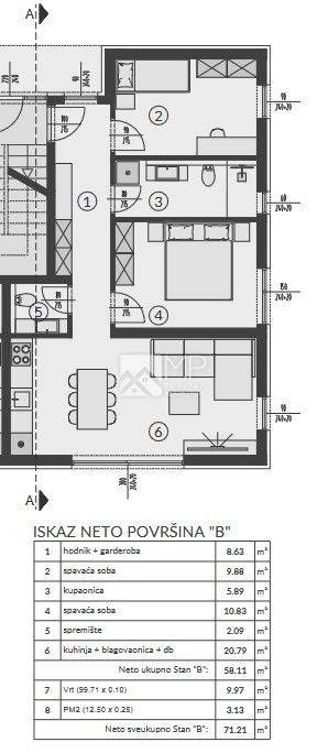 The apartment marked “B”, located on the ground floor of the building, extends over 71.21 m² and includes: