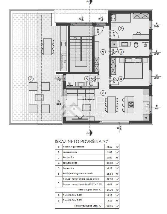 In a quiet part of Medulin – Biškupije, in a dead-end street that guarantees privacy and peace, a beautiful apartment is offered in a new modern building.