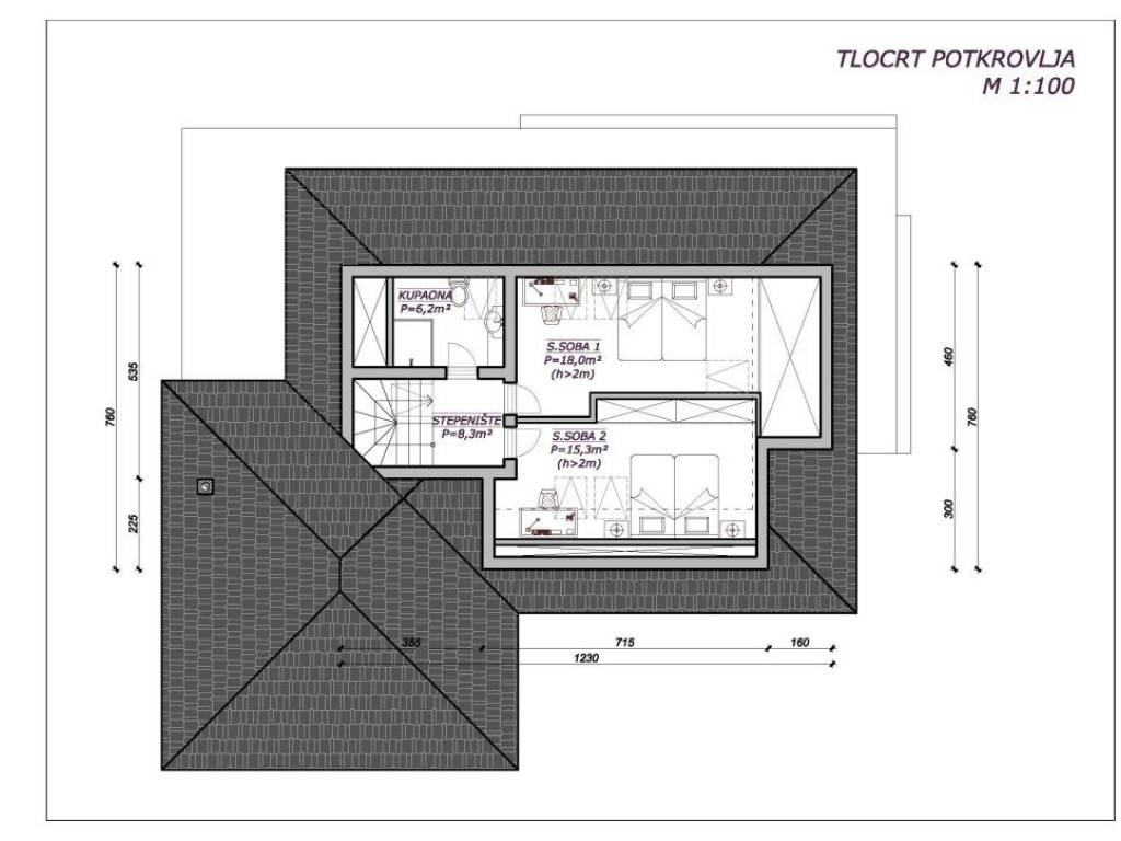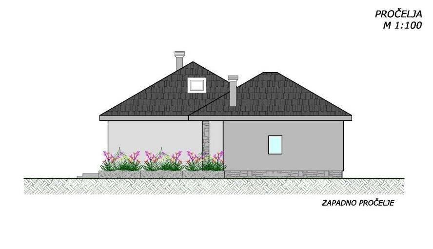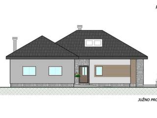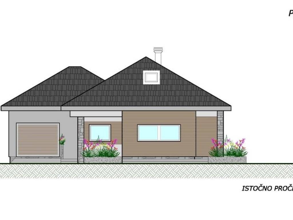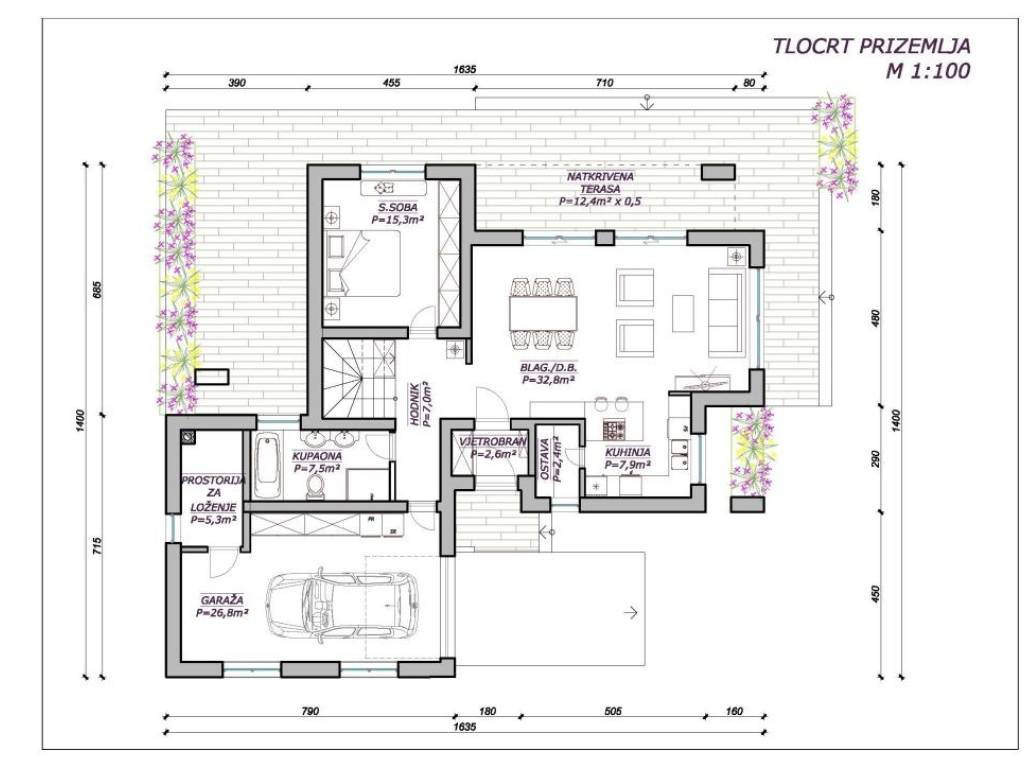 prizemlje: natkrivena terasa, kuhinja s blagovanom i dnevnim boravkom, kupaona, soba, kotlovnica, garaža