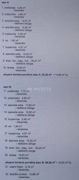Apartment A is located on the ground floor and has a total living area of 93.32 m². It consists of an entrance hall, hallway, 2 bathrooms, an additional toilet, 3 bedrooms, a living room with a kitchen and dining area in an open space concept, and a terrace with access to the pool area.