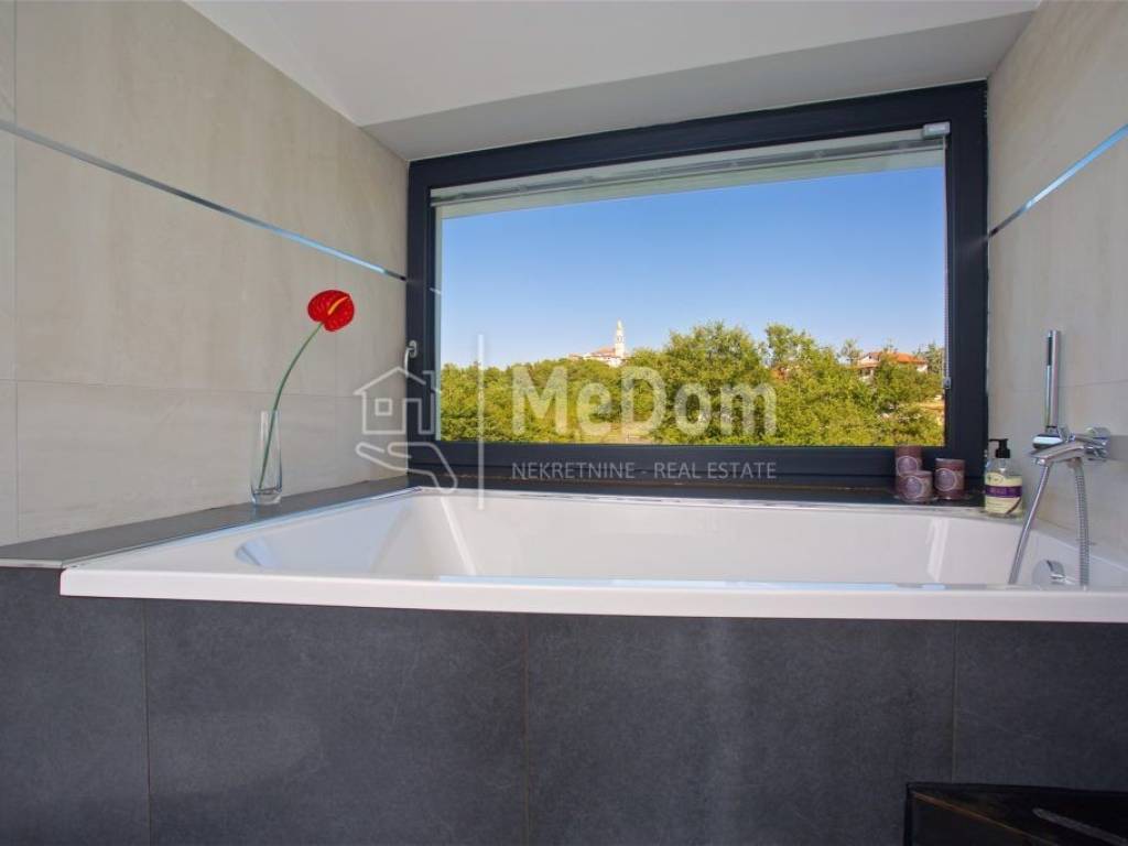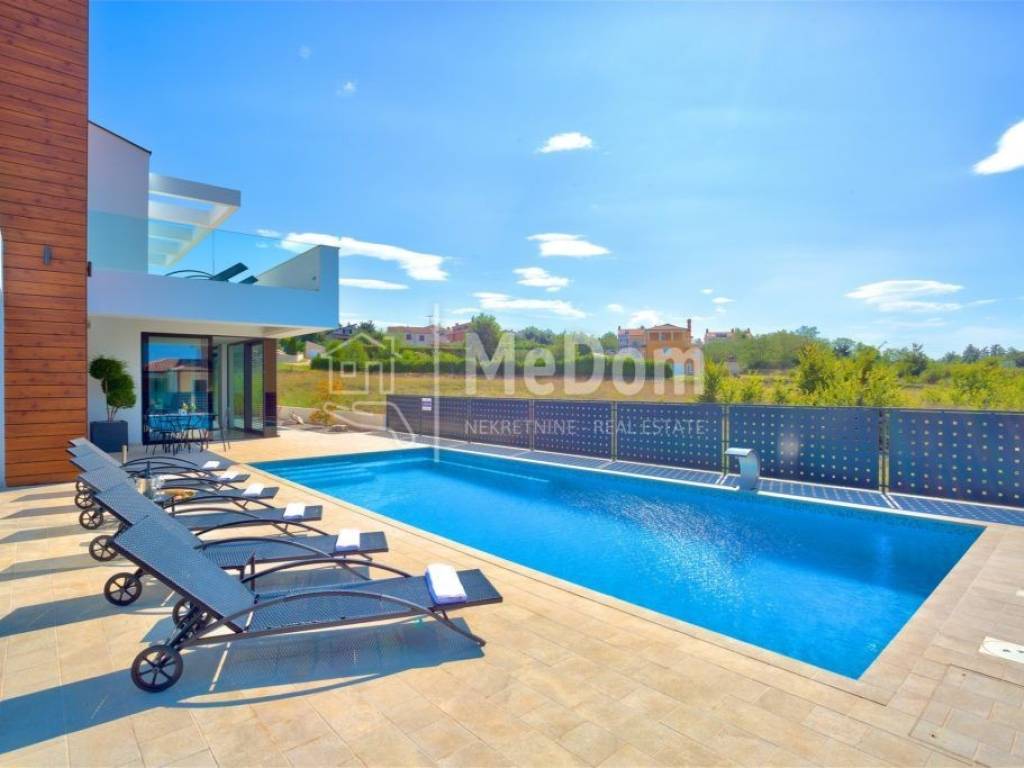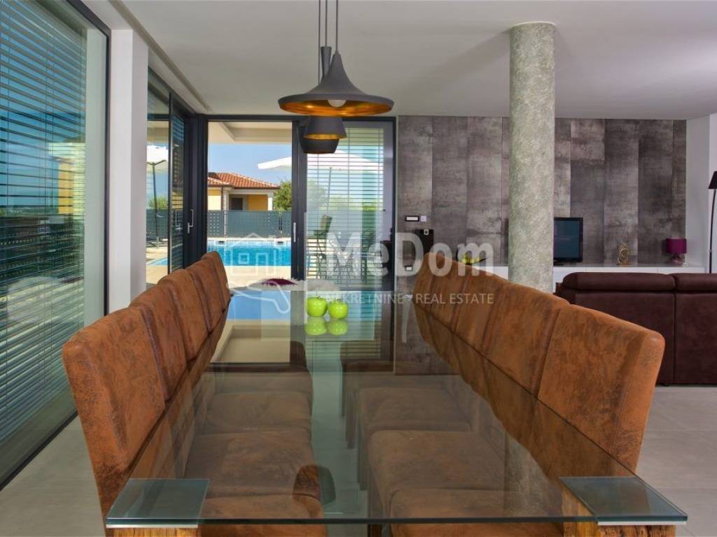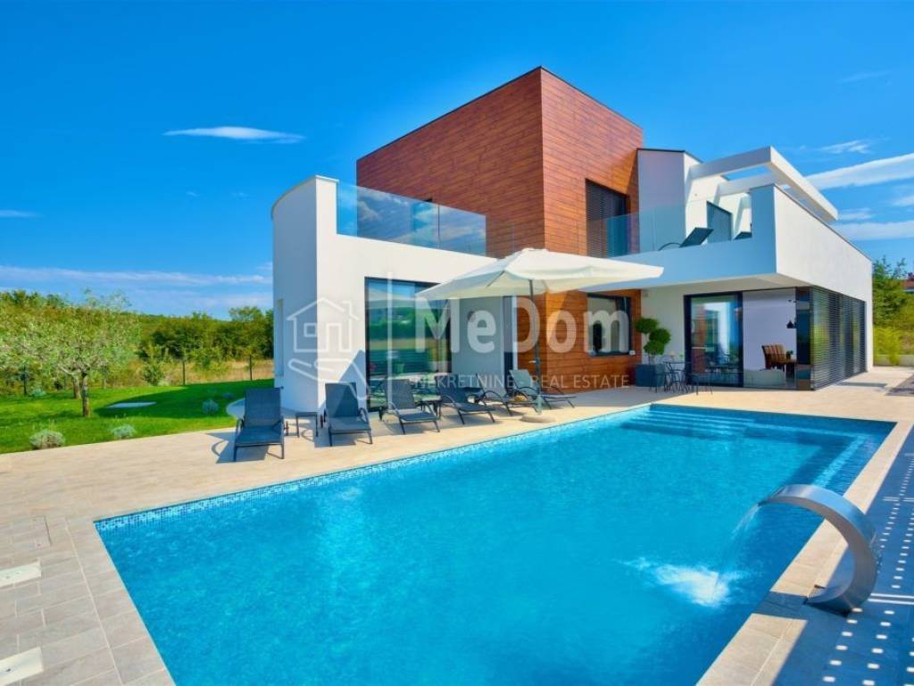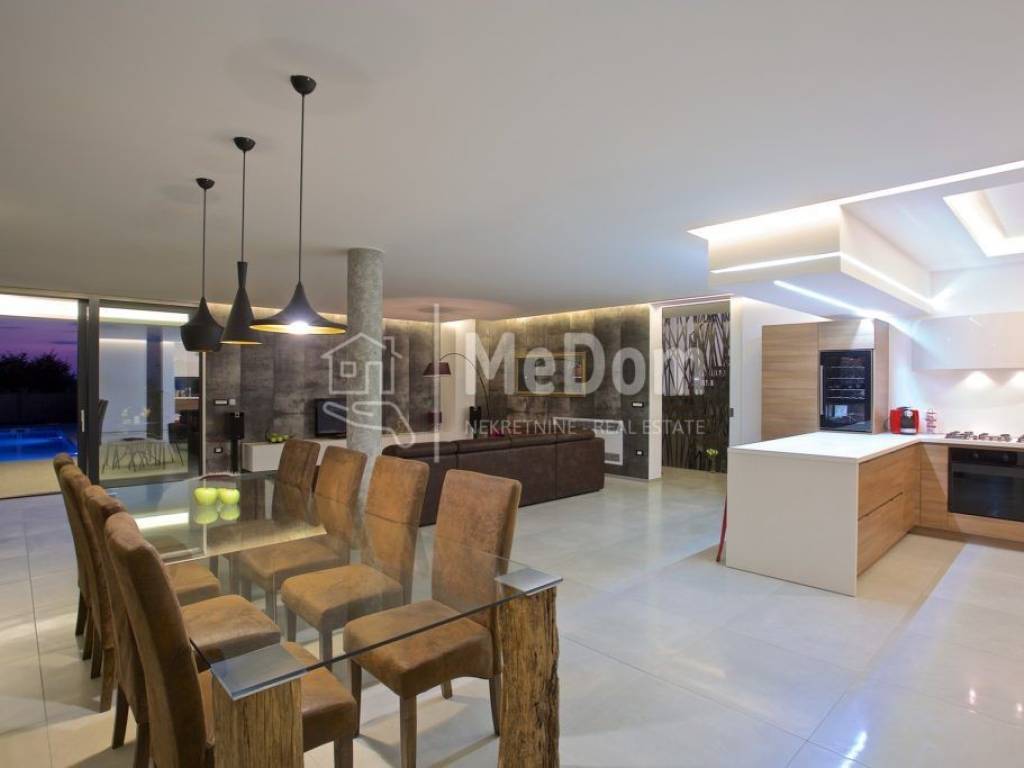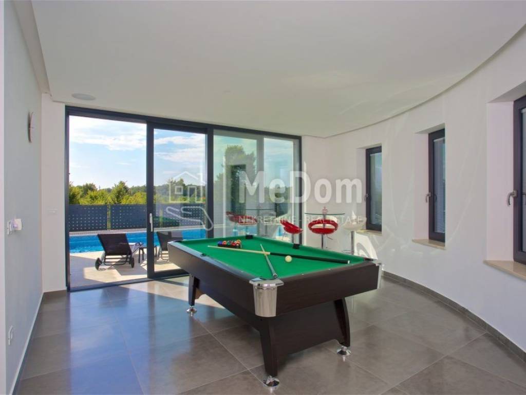 The MeDom agency is mediating the sale of a beautiful luxury villa on the west coast of Istria, in Višnjan, near Poreč. The villa has a living area of ​​370m2. On the ground floor is a designer living room with a dining room, kitchen, one bedroom, bathroom, and toilet. The living room opens onto a beautifully decorated terrace and swimming pool. There is also an outdoor fireplace on the terrace with a decorated area for socializing. The villa's first floor has three bedrooms and two bathrooms. The rooms have access to a large shared balcony with a beautiful view of the surrounding landscape and the sea. Two bedrooms have an integrated wardrobe space. In the rustically decorated basement is another kitchen with a fireplace, a large dining table, a billiard table, a bathroom, and a bedroom. The villa also has a jacuzzi and a sauna. High-quality materials were used in the construction of the villa. The villa has underfloor heating, air conditioning, an alarm, video surveillance, electric shutters, and green area irrigation. The villa is being sold fully furnished and equipped. The villa has an excellent established business for tourist rentals and is interesting both as an investment and as a house for luxurious family life. All necessary amenities for life and entertainment are located near the villa.