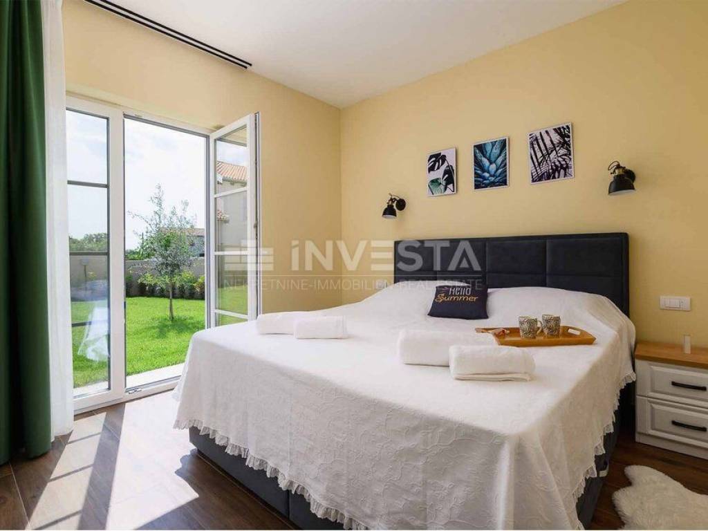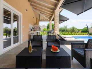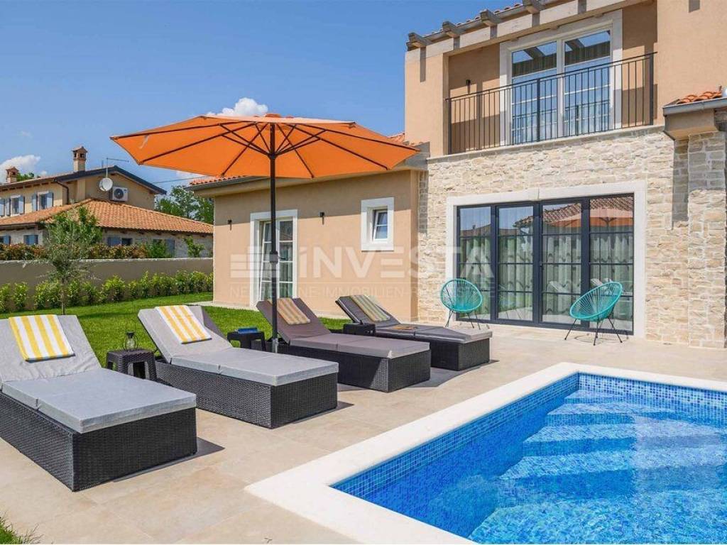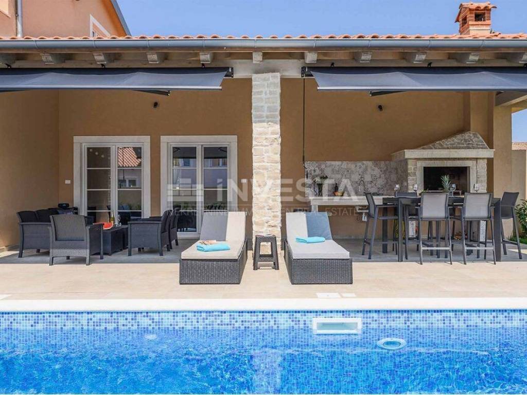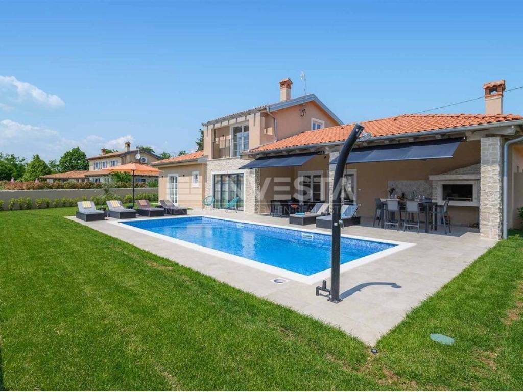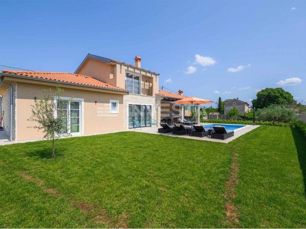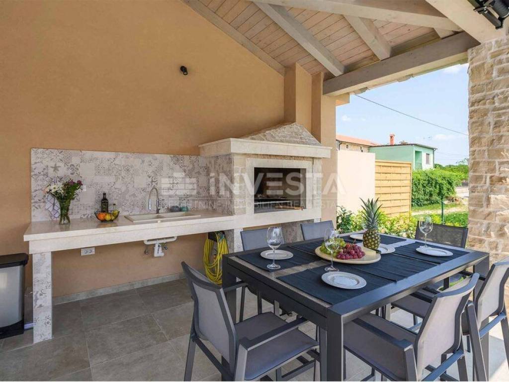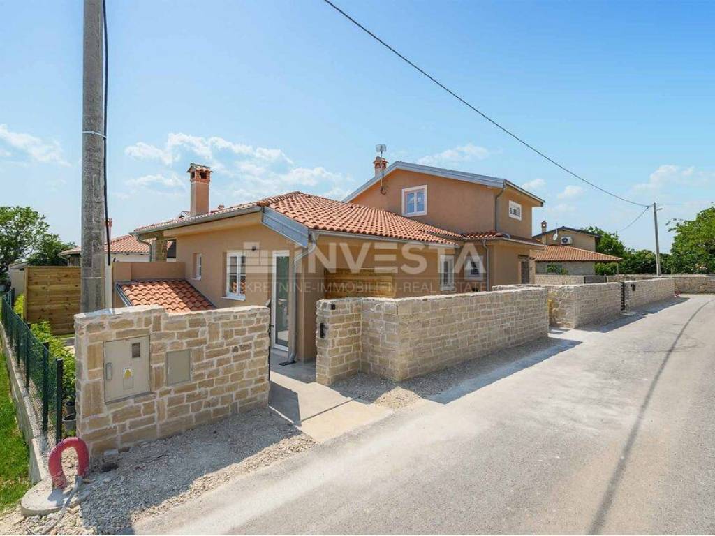 In a small place near Kanfanar, there is a villa built in the Mediterranean style with a surface area of 186 m², situated on a plot of 718 m².