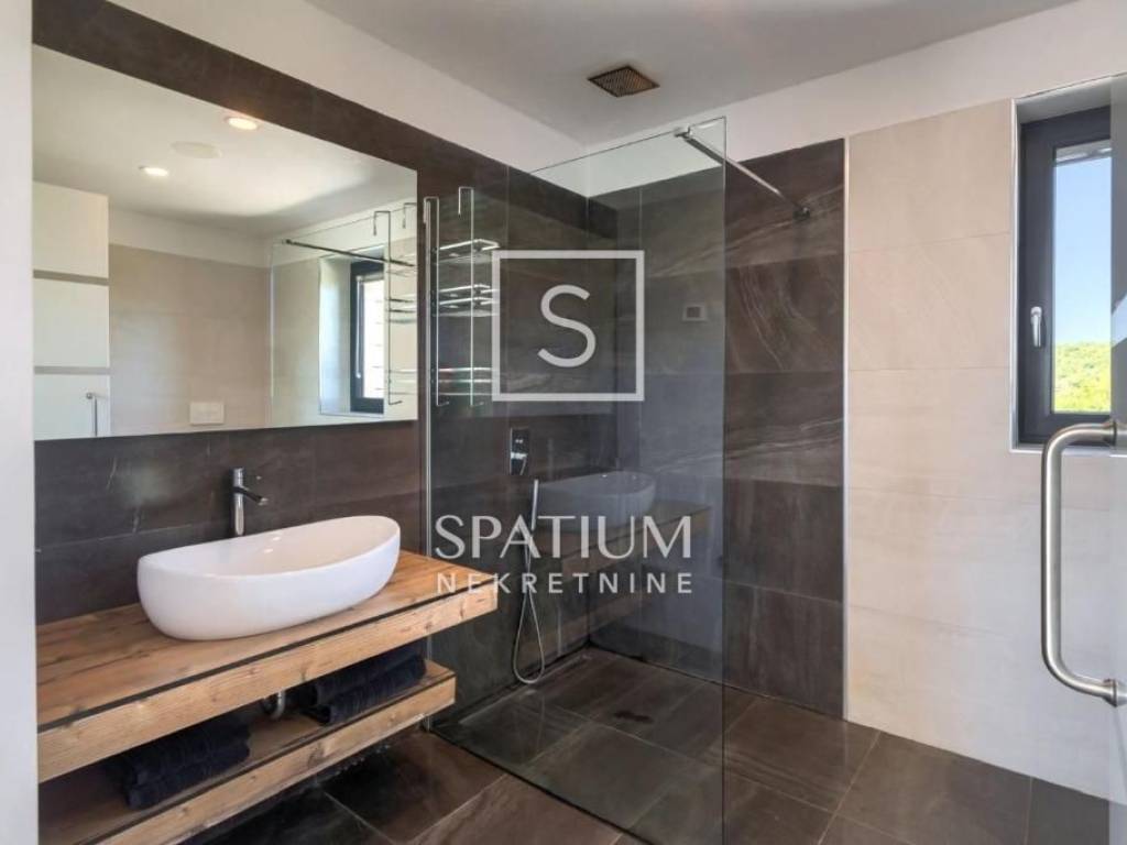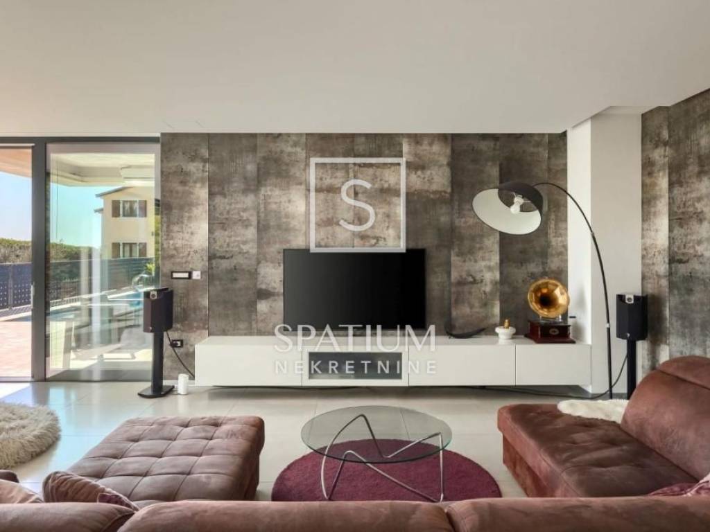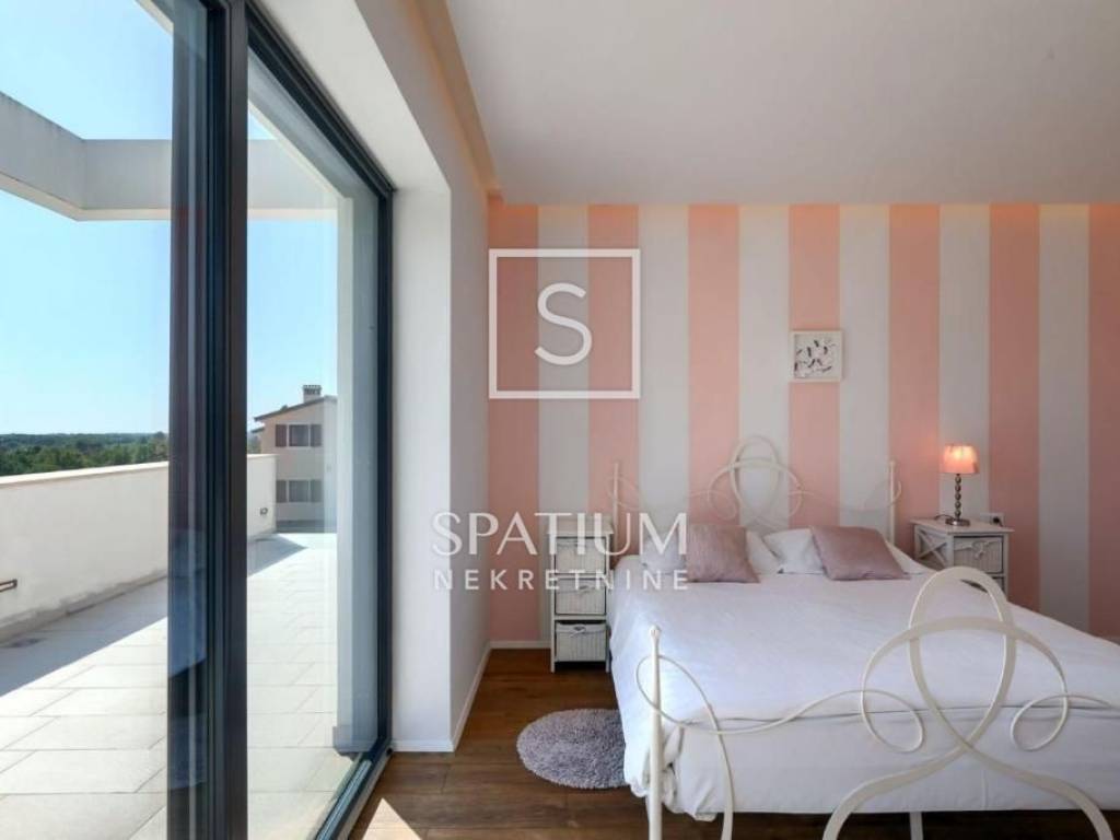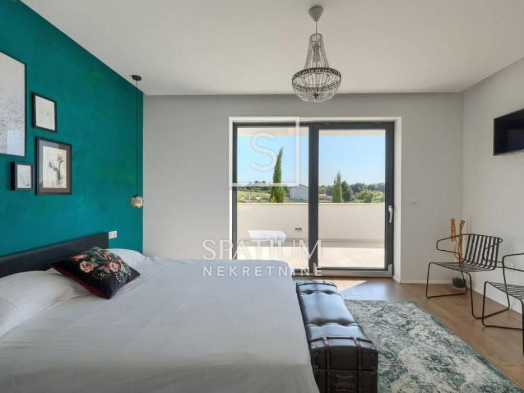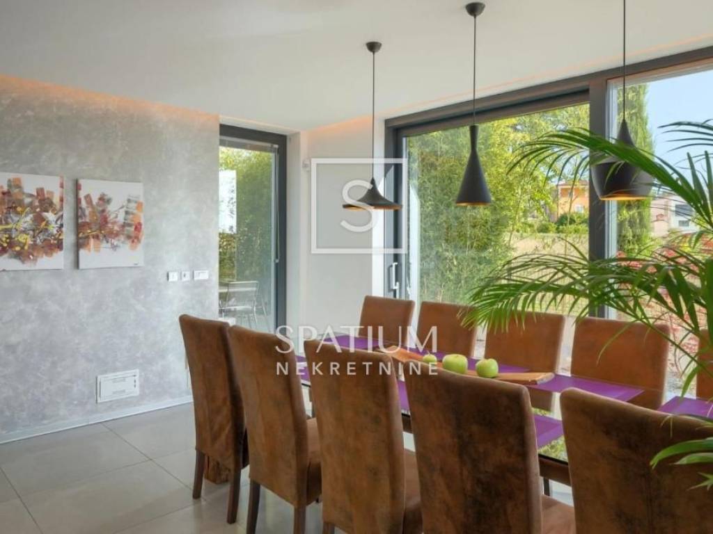 POREČ, we were offered a luxury villa of 370m2. On the ground floor there is a spacious living room with dining room and kitchen, one bedroom, bathroom, guest toilet. From the living room with large glass walls there is access to a beautifully decorated sundeck and a pool of 38 m2. On the other side, there is an outdoor fireplace with a dining table for gatherings in a pleasant and intimate part of the garden. On the first floor, there are three bedrooms with access to a large common balcony with a beautiful view of the surrounding landscape and the sea, two bedrooms have integrated wardrobe space, and one has its own bathroom. There is also another large bathroom. In the rustically decorated basement there is a kitchen with a fireplace and a large dining table, a pool table, a bathroom and a bedroom. The property is sold fully furnished and equipped. Underfloor heating, air conditioning, alarm, video surveillance, electric blinds, garden irrigation. The landscaped garden is completely fenced and offers privacy. Due to its beautiful location, the property has a well-established tourist rental business and is ideal as an investment but also as a house for a luxurious family life.