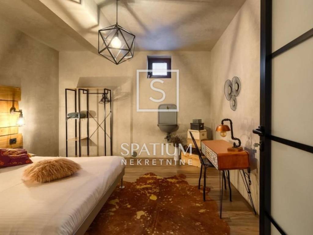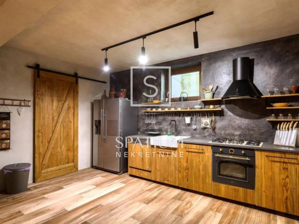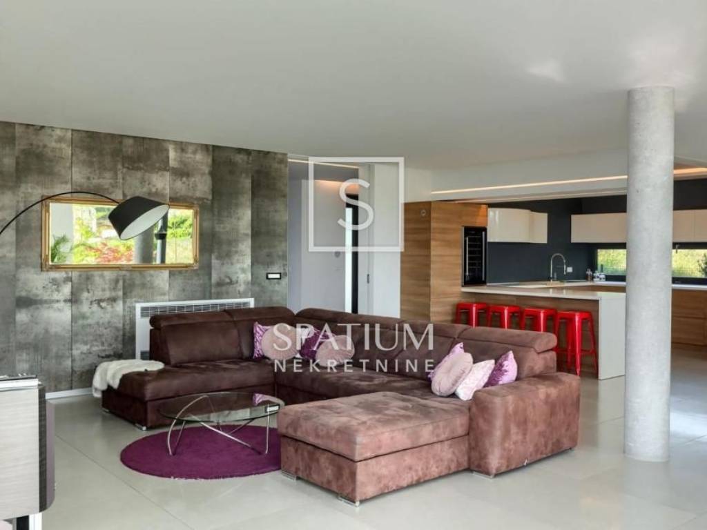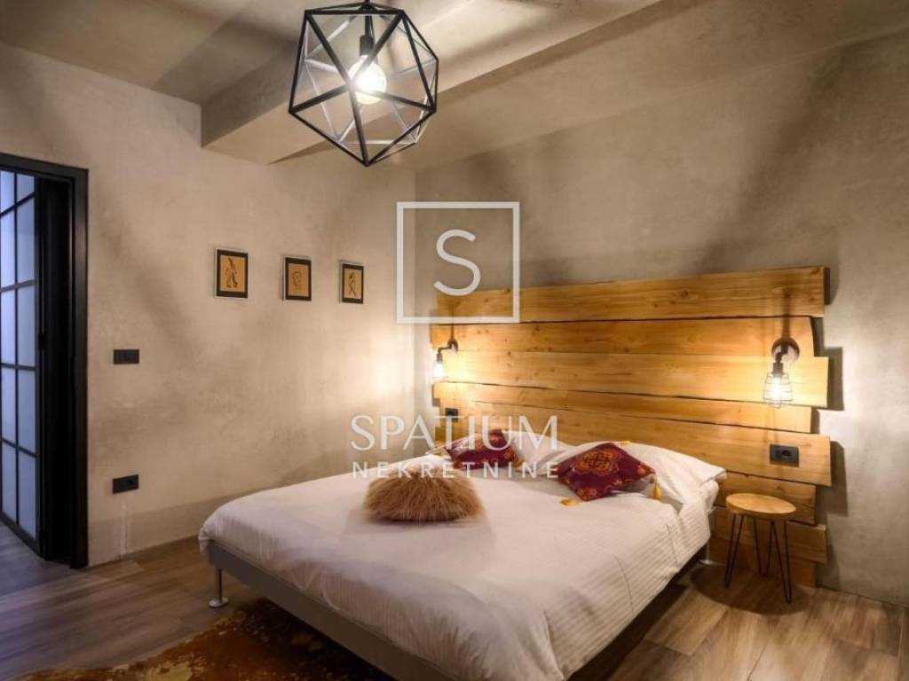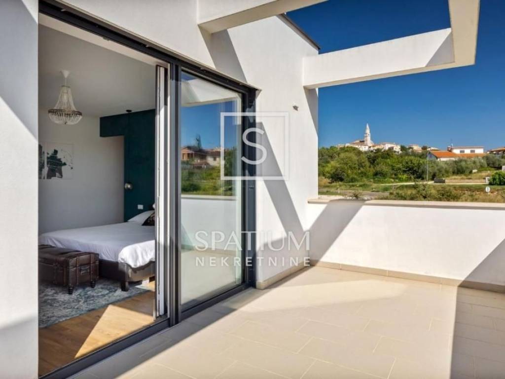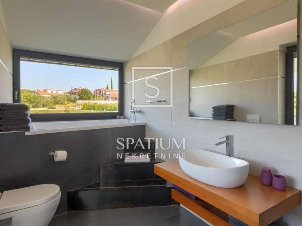 POREČ, we were offered a luxury villa of 370m2. On the ground floor there is a spacious living room with dining room and kitchen, one bedroom, bathroom, guest toilet. From the living room with large glass walls there is access to a beautifully decorated sundeck and a pool of 38 m2. On the other side, there is an outdoor fireplace with a dining table for gatherings in a pleasant and intimate part of the garden. On the first floor, there are three bedrooms with access to a large common balcony with a beautiful view of the surrounding landscape and the sea, two bedrooms have integrated wardrobe space, and one has its own bathroom. There is also another large bathroom. In the rustically decorated basement there is a kitchen with a fireplace and a large dining table, a pool table, a bathroom and a bedroom. The property is sold fully furnished and equipped. Underfloor heating, air conditioning, alarm, video surveillance, electric blinds, garden irrigation. The landscaped garden is completely fenced and offers privacy. Due to its beautiful location, the property has a well-established tourist rental business and is ideal as an investment but also as a house for a luxurious family life.