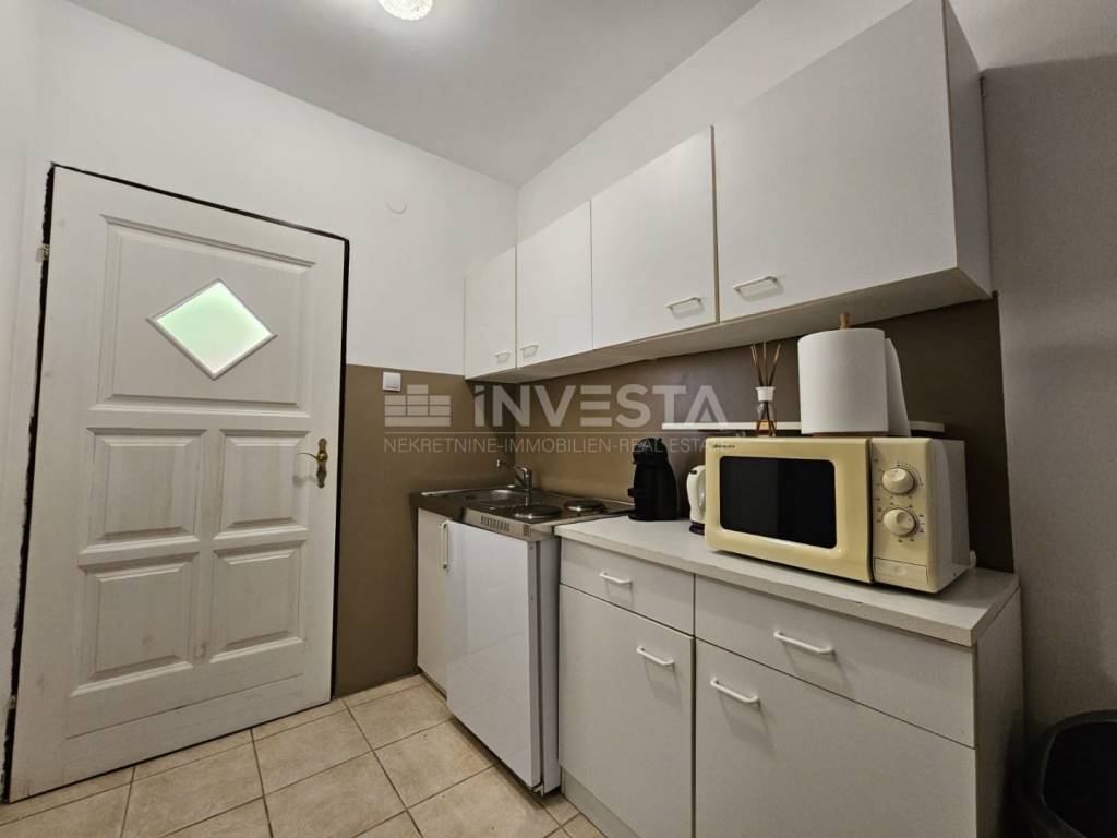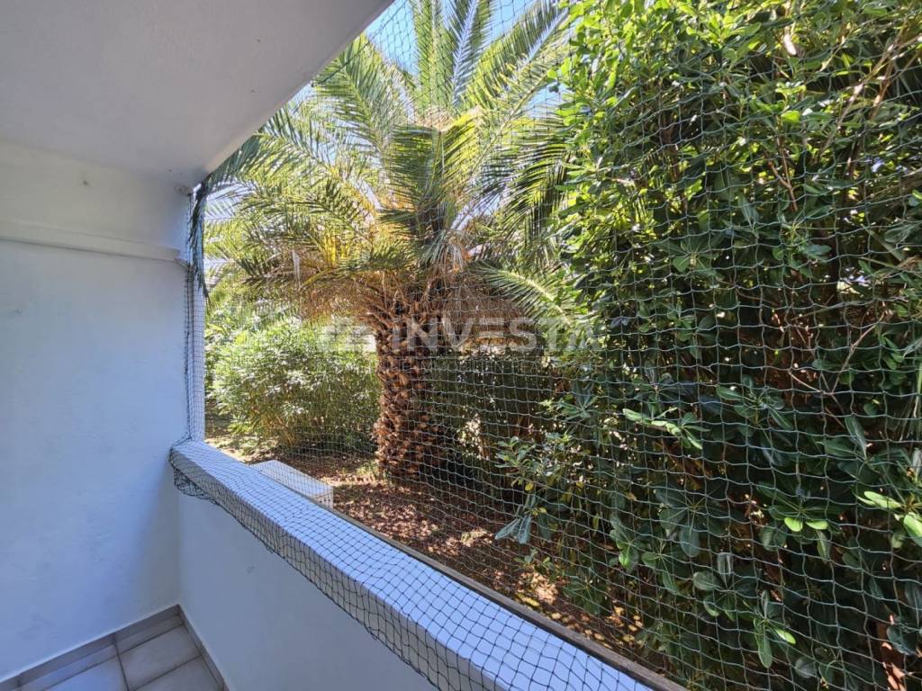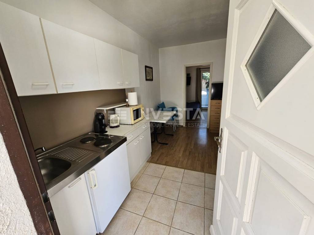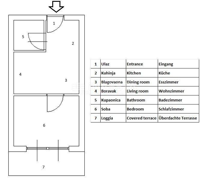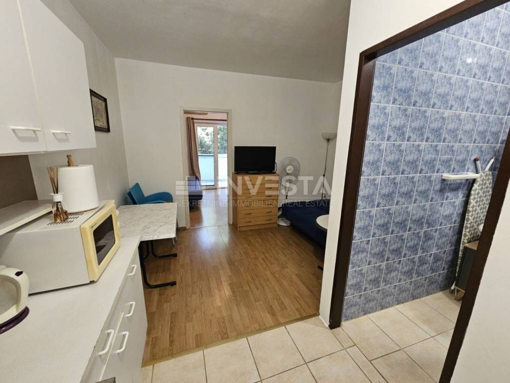 The total area of the apartment is 28.53 m² and it consists of an entrance hallway, bathroom, open-plan living room with kitchen and dining area, and a separate bedroom. From the bedroom, there is access to a covered terrace (loggia) of approximately 6 m², surrounded by greenery, ideal for relaxing in the shade and enjoying privacy, as there are no buildings directly in front.