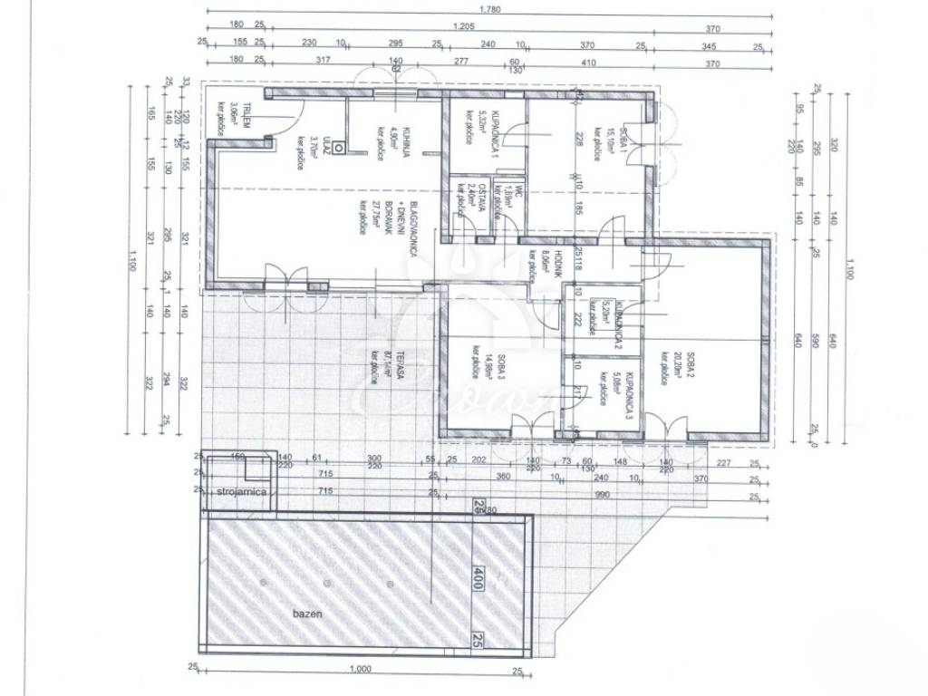 The villa consists of three spacious bedrooms (20 m², 15 m², and 15 m²), each with its own bathroom, plus an additional guest toilet. The open-concept living room connects with the modern kitchen and dining area, which has direct access to a covered terrace and a sun deck with a private 40 m² swimming pool. Large glass walls provide plenty of natural light and a harmonious flow between indoor and outdoor spaces.