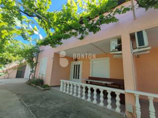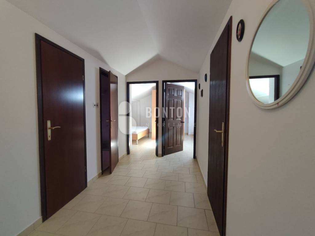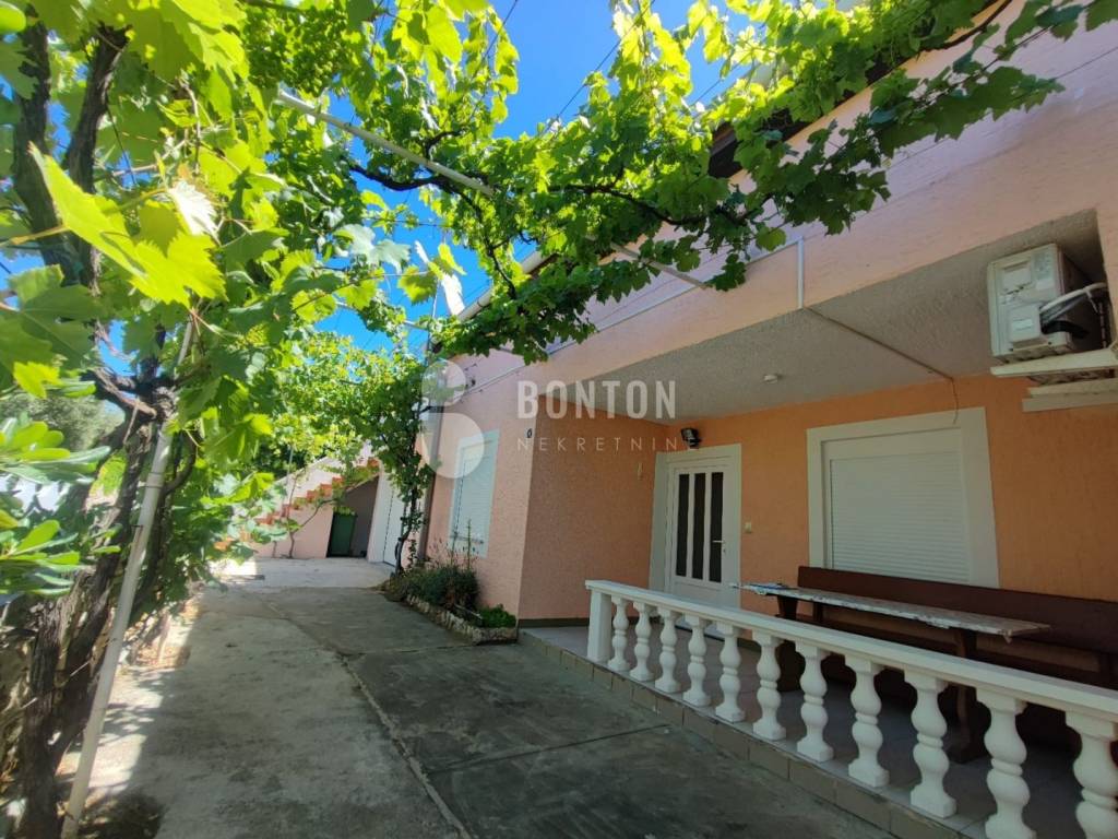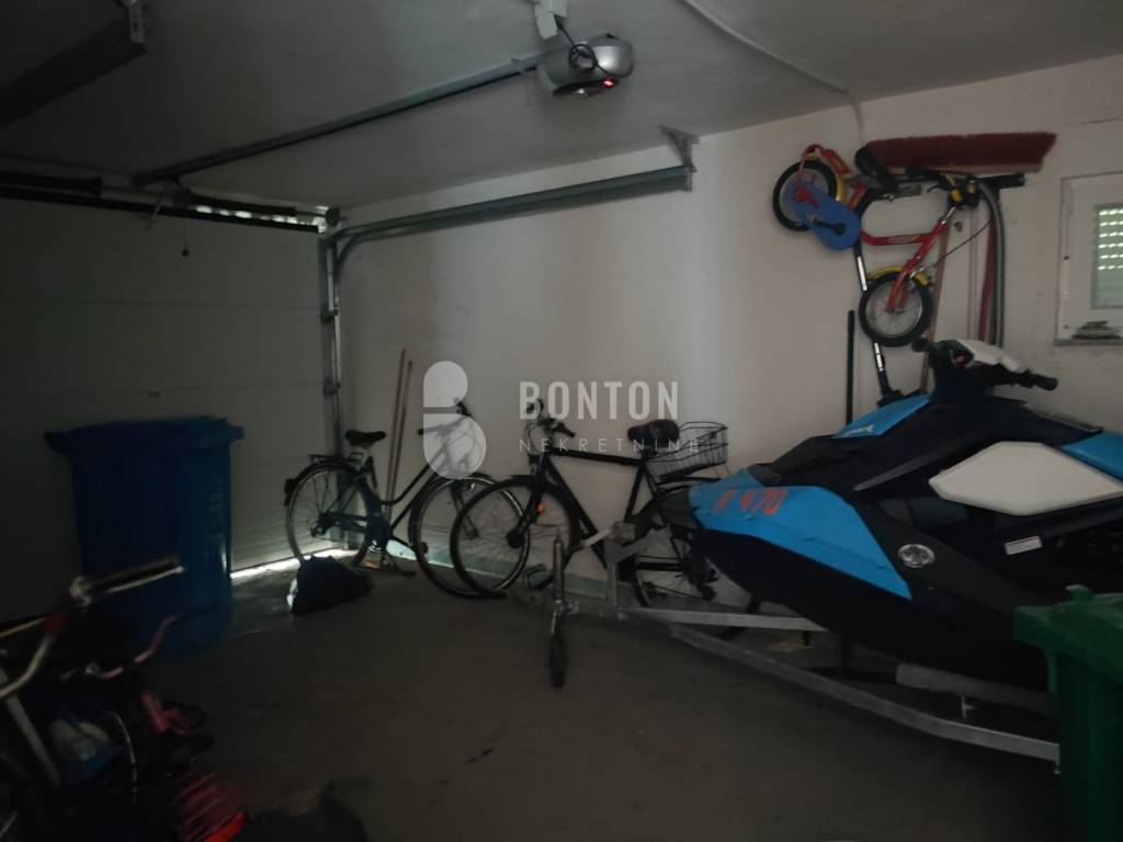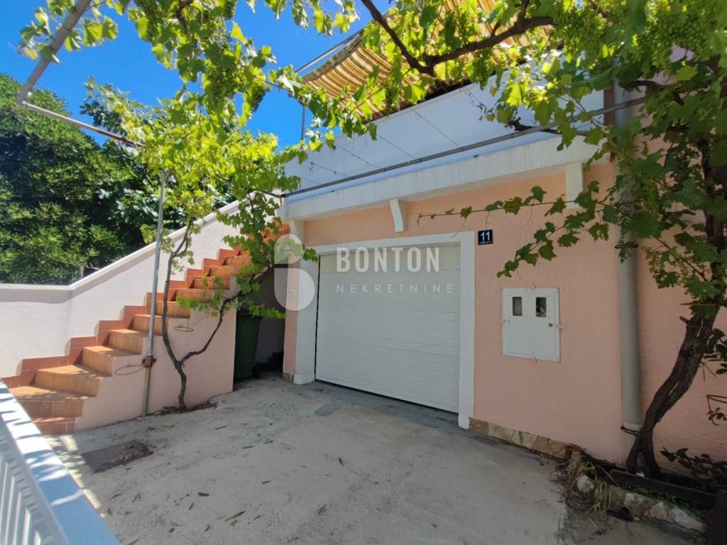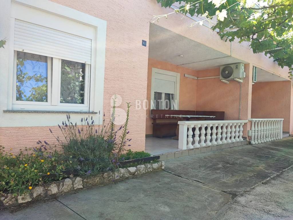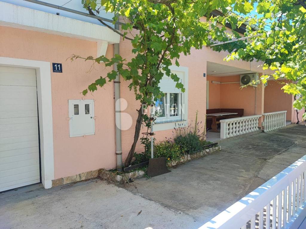 NEW ON OFFER We have a beautiful house with two apartments that include a closed garage with automatic door lift, located in the southern part of Vir Prezid. The distance from the beach is 200m. With two apartments, this house provides flexibility and privacy for multiple families or guests. Each apartment has a separate entrance and its own terrace, ensuring comfort and privacy for each tenant. The closed garage is especially useful for protecting vehicles from adverse conditions, provides additional storage space and ensures privacy because the living area is also entered through the garage itself. The house was started in 1985 and completed in 1995. On the ground floor there is a two-room apartment 72m2, two bedrooms with a bathroom, a kitchen and a dining room. The floors are tiled with ceramic and laminate. The kitchen is new. The joinery has been completely changed with a garage door and a fence. On the ground floor there is 1 air conditioner and a chimney that provides heating during the colder days.