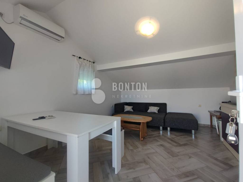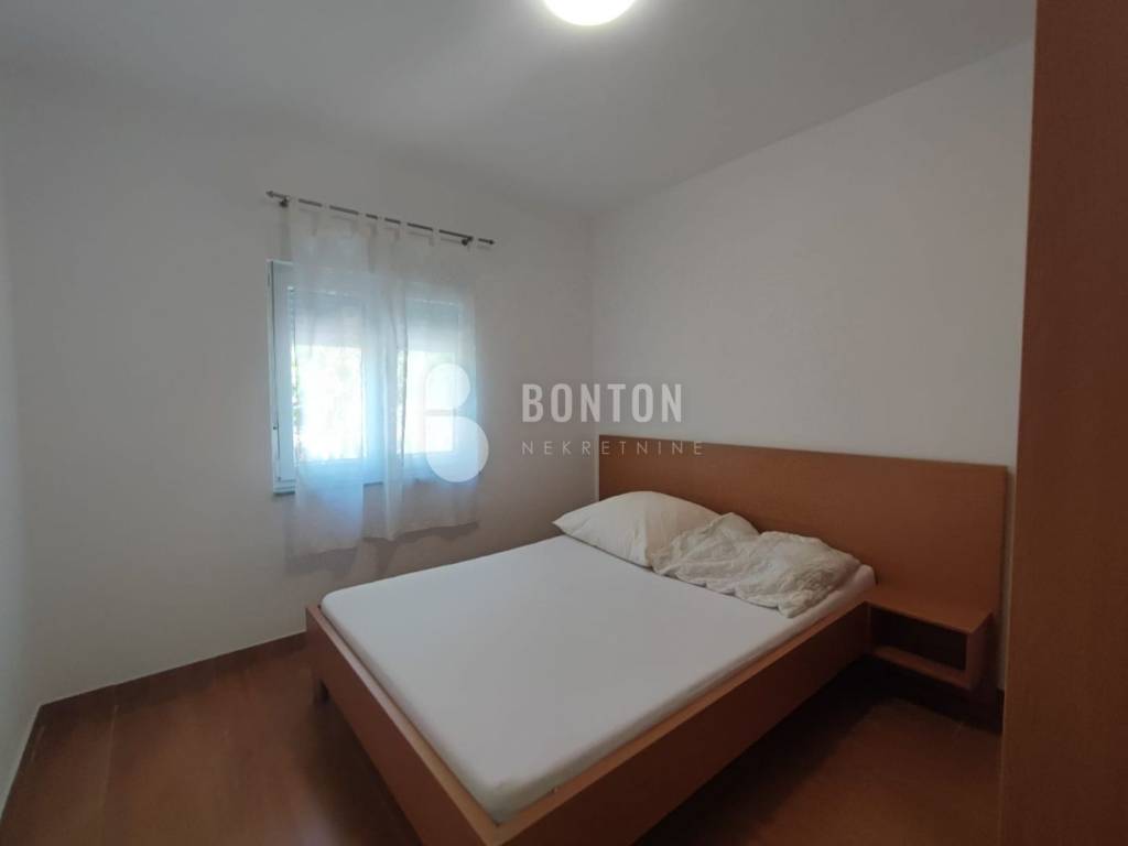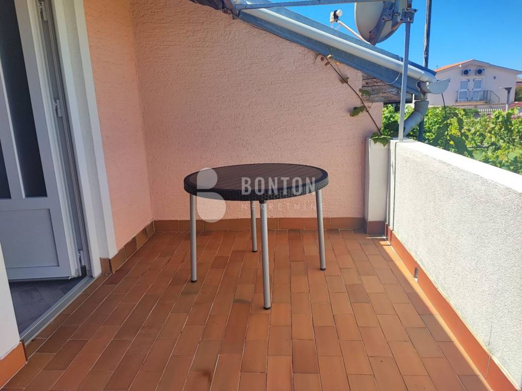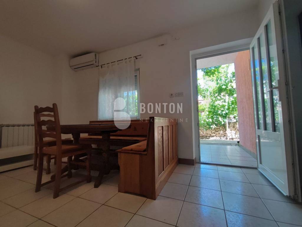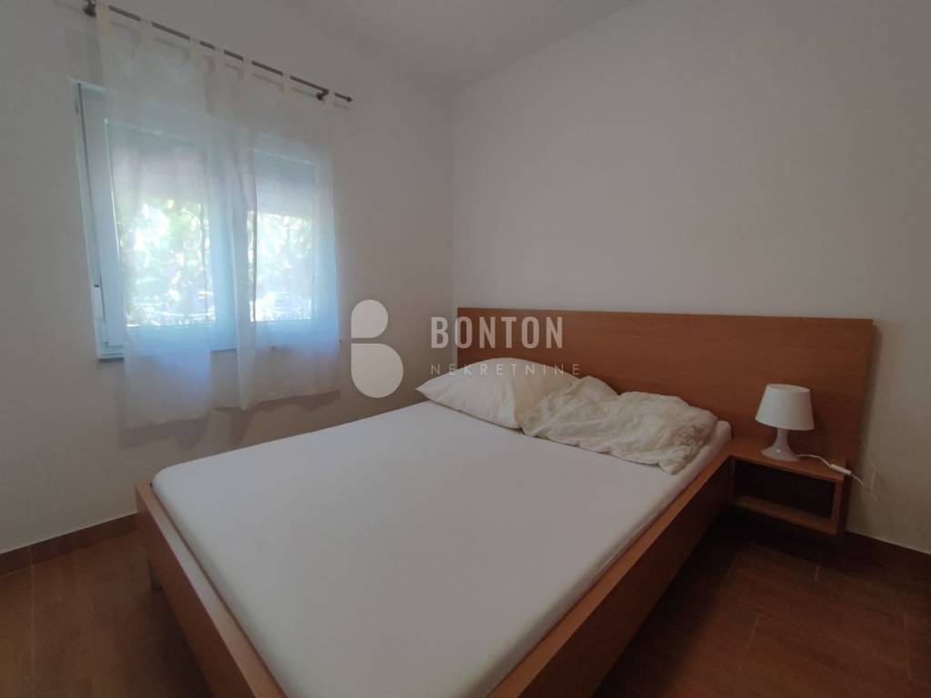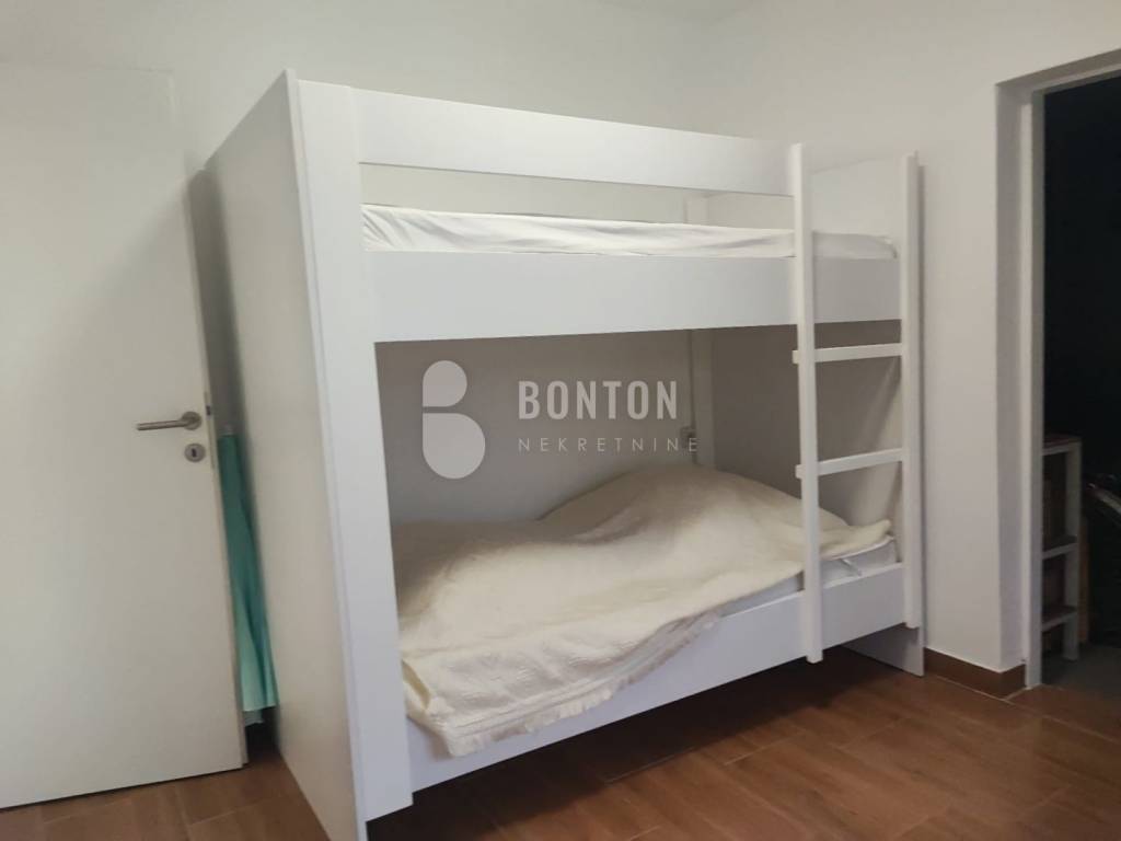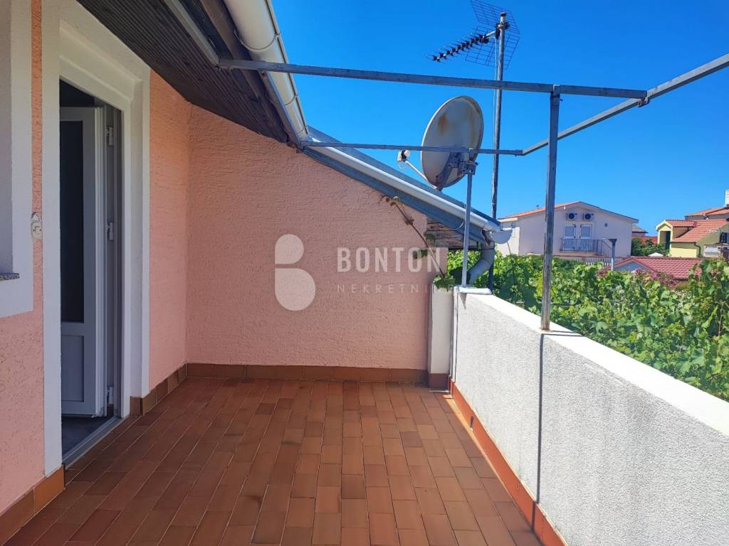 NEW ON OFFER We have a beautiful house with two apartments that include a closed garage with automatic door lift, located in the southern part of Vir Prezid. The distance from the beach is 200m. With two apartments, this house provides flexibility and privacy for multiple families or guests. Each apartment has a separate entrance and its own terrace, ensuring comfort and privacy for each tenant. The closed garage is especially useful for protecting vehicles from adverse conditions, provides additional storage space and ensures privacy because the living area is also entered through the garage itself. The house was started in 1985 and completed in 1995. On the ground floor there is a two-room apartment 72m2, two bedrooms with a bathroom, a kitchen and a dining room. The floors are tiled with ceramic and laminate. The kitchen is new. The joinery has been completely changed with a garage door and a fence. On the ground floor there is 1 air conditioner and a chimney that provides heating during the colder days.