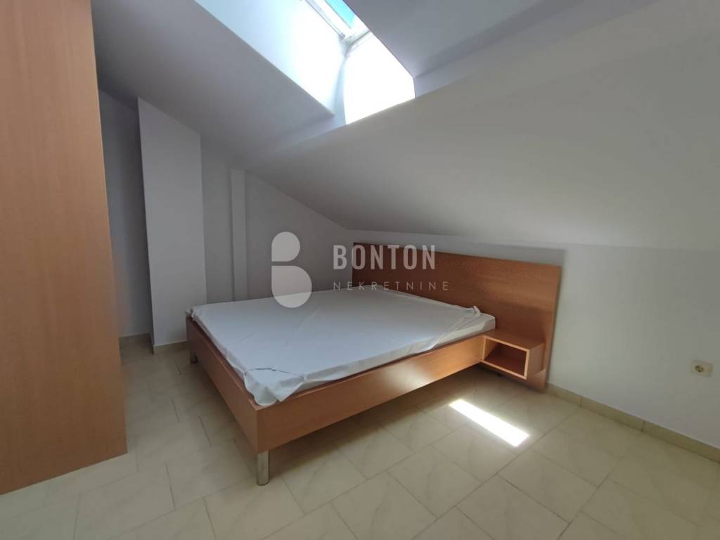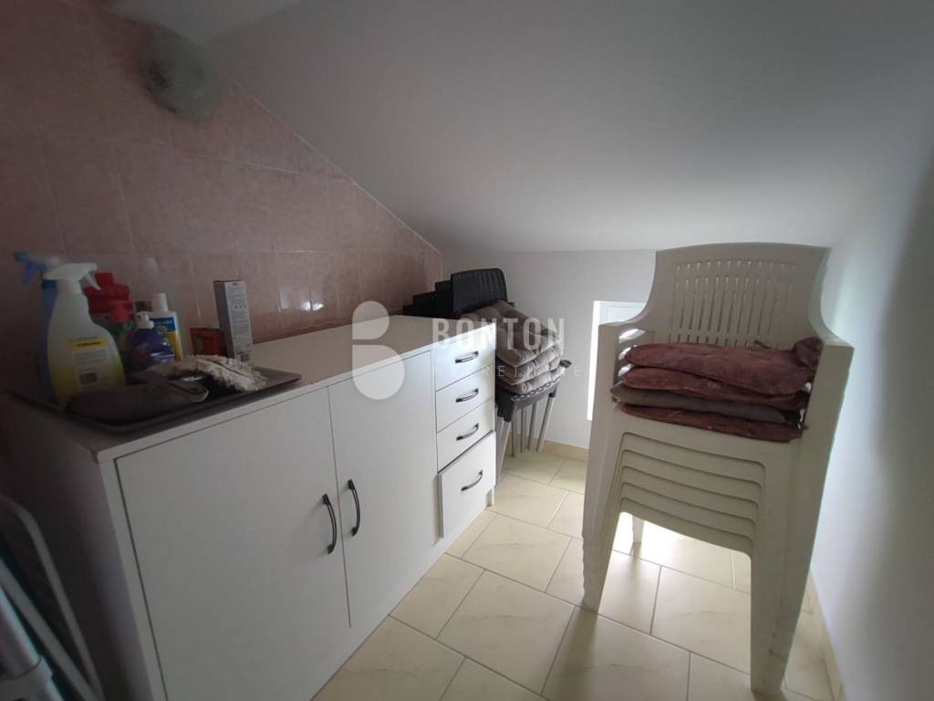 On the 1st floor we climb the external stairs, the size of the residential part is 59 m2 + Terrace. ON the first floor there is a covered and uncovered terrace, all together 12m2. Kitchen with dining room, living room and hallway. In the kitchen there is - 1 air conditioner. The kitchen is new and unused. ON the first floor the ceilings are curved because we are in the attic. The walls of the rooms after 1 meter are slanted. The light in the rooms comes from the roof windows. On the first floor there are 3 bedrooms. Two with double beds and one children's room. On the opposite side there is a bathroom and a storage room.
