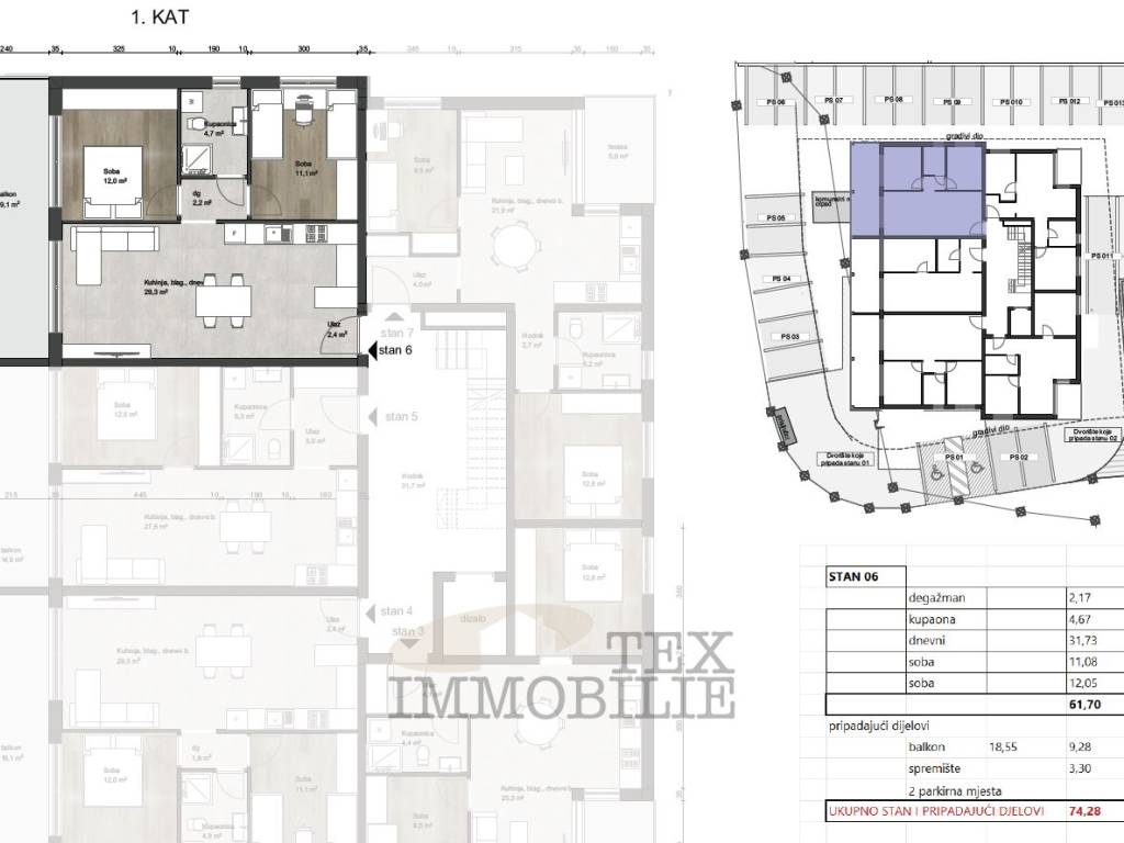 The apartment has 61.70 m2 + 3.30 m2 storage room + 9.28 m2 terrace (50%). Total: 74.28 m2