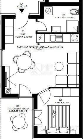 GROUND FLOOR APARTMENT MARKED "A1" (41.80 m2) includes: entrance hall, living room + kitchen + dining room with access to a covered terrace, bedroom and bathroom.