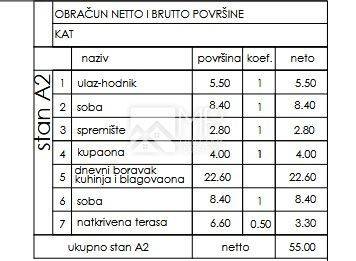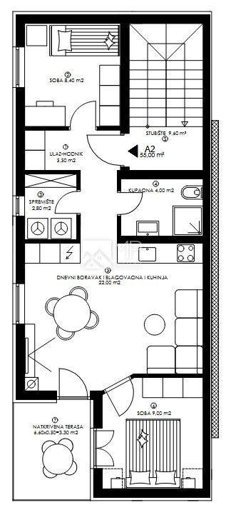 APARTMENT ON THE FIRST FLOOR MARKED "A2" (55 m2) includes: entrance hall, living room + kitchen + dining room with access to a covered terrace, two bedrooms, storage room and bathroom.