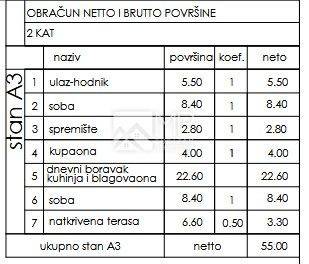 APARTMENT ON THE 2ND FLOOR MARKED "A3" (55 m2) includes: entrance hall, living room + kitchen + dining room with access to a covered terrace, two bedrooms, storage room and bathroom.