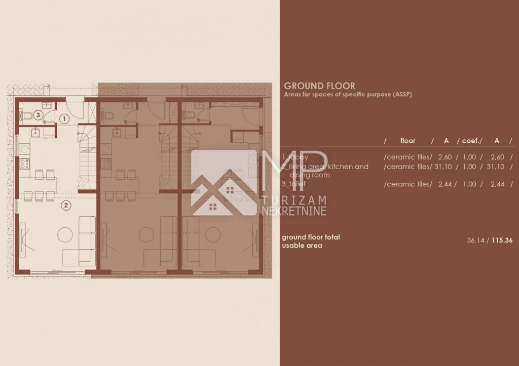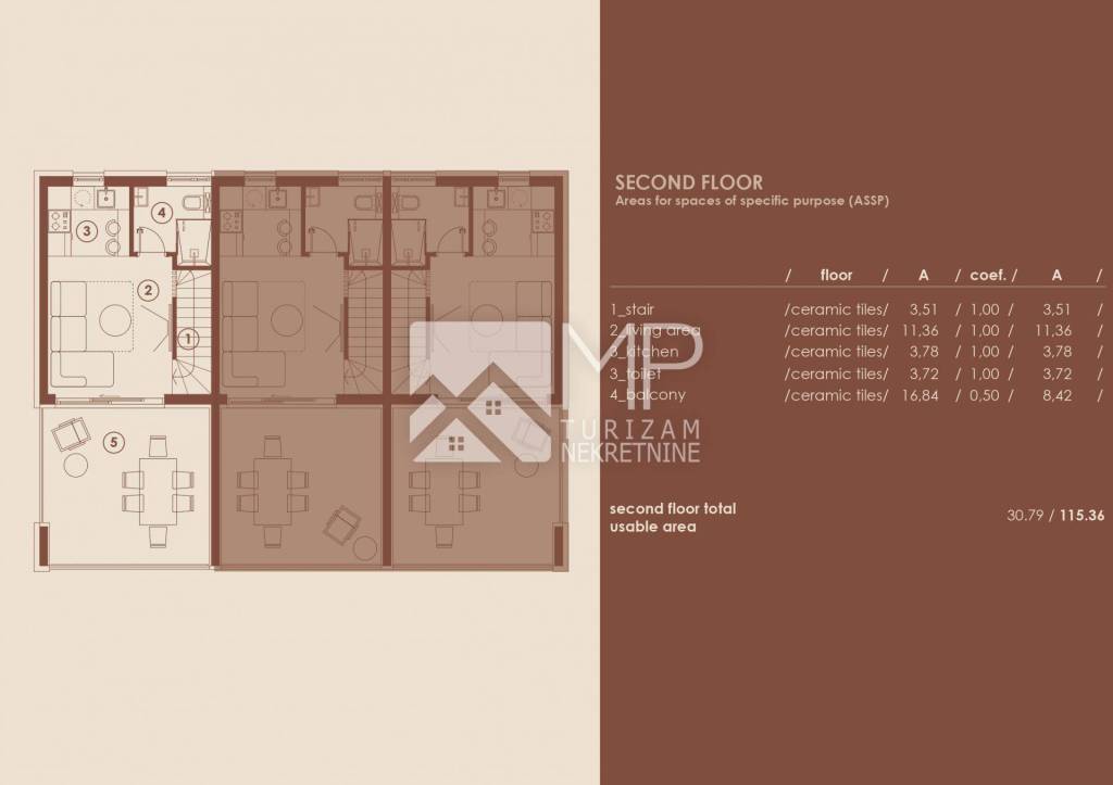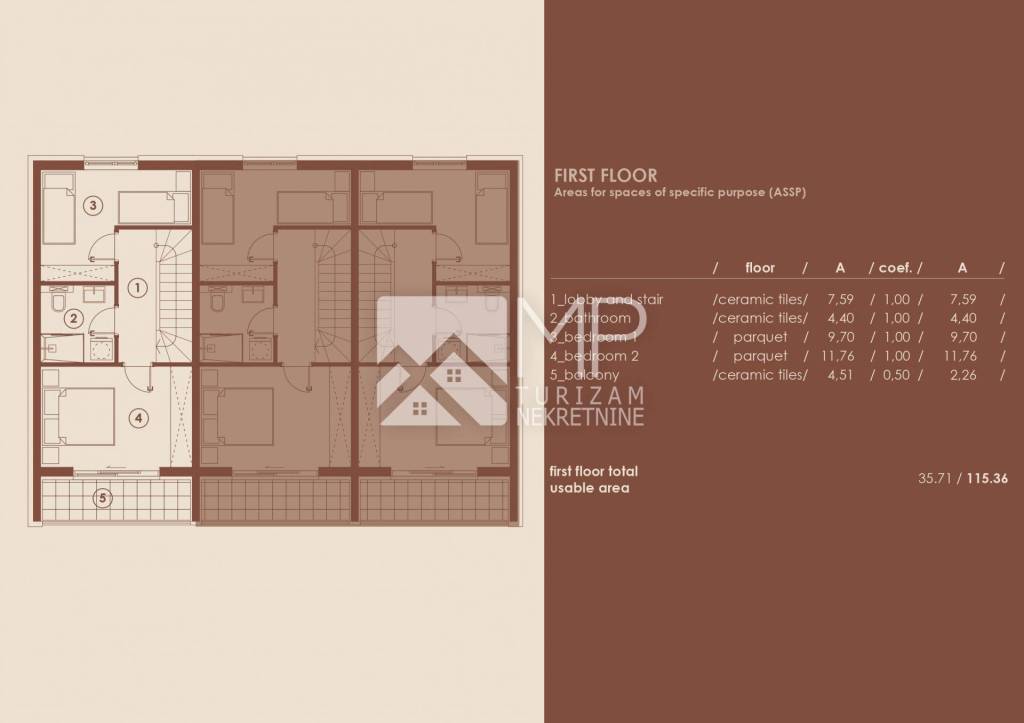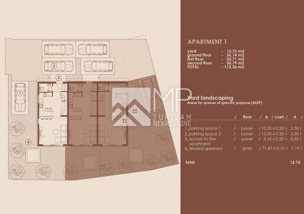 Located in the very south of Istria, in the heart of beautiful Medulin, this three-story apartment offers the perfect blend of Mediterranean charm, modern luxury and privacy. Once a small fishing village, Medulin is today known for its beautiful beaches, superb gastronomy and numerous outdoor activities. For sale is an apartment marked "1" with an area of ​​115.36 m², consisting of: