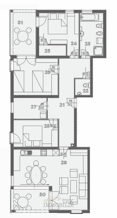 The apartment has a area of 119 m² and consists of a spacious entrance hallway, a bright living room with dining area and terrace, a modern fully equipped kitchen with high-end appliances, 3 bedrooms, two of which have access to a terrace, an fourth smaller work room. Additionally, the apartment features an elegant bathroom with a shower and bathtub and a separate guest toilet.