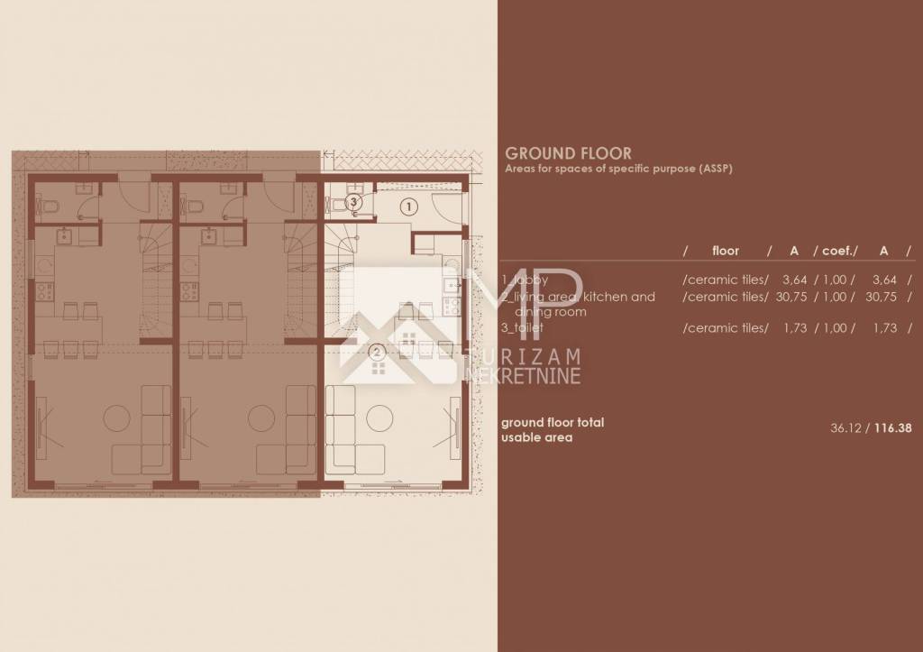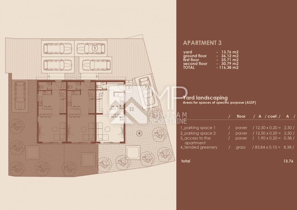 Located in the very south of Istria, in the heart of beautiful Medulin, this three-story apartment offers the perfect blend of Mediterranean charm, modern luxury and privacy. Once a small fishing village, Medulin is today known for its beautiful beaches, superb gastronomy and numerous outdoor activities. For sale is an apartment marked "3" with an area of 116.38 m², consisting of:
