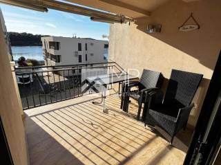 The apartment with a view of the blue sea consists of a living room with a kitchen and dining room that has access to a covered terrace, then a hallway, bathroom and two bedrooms.