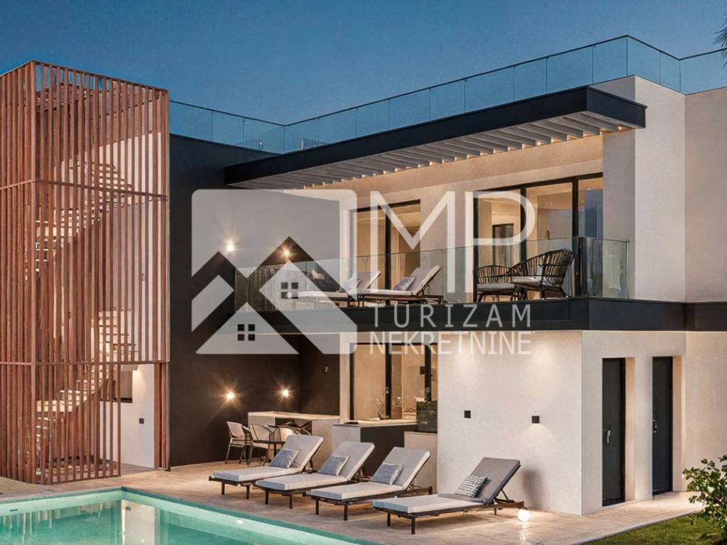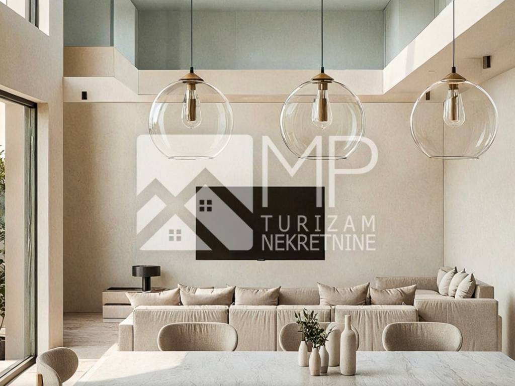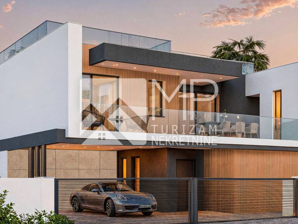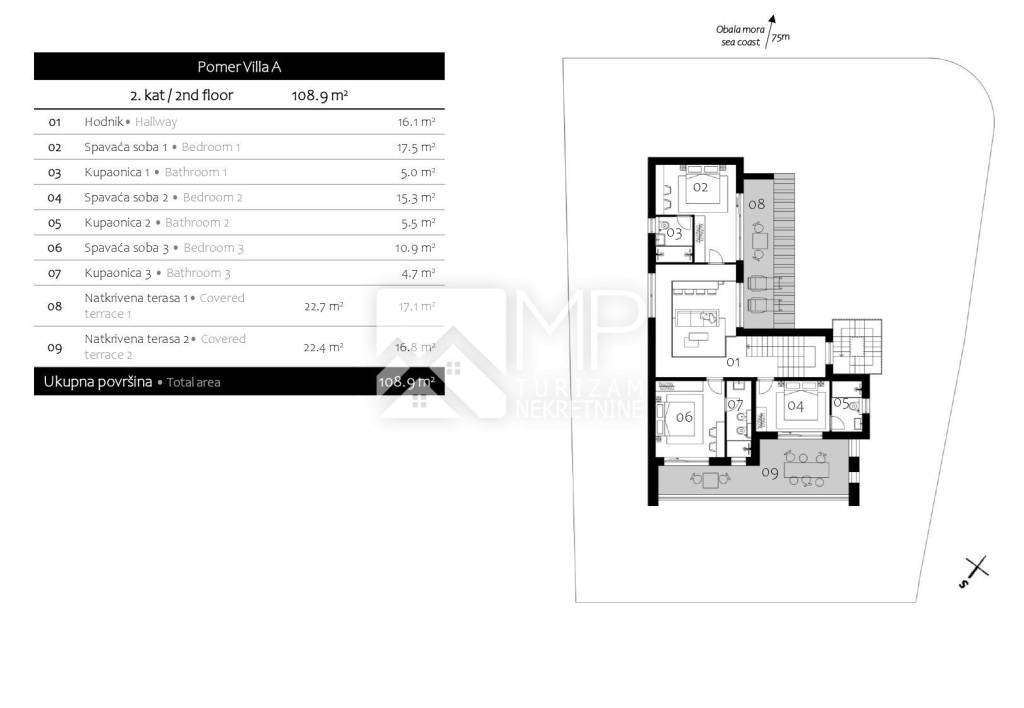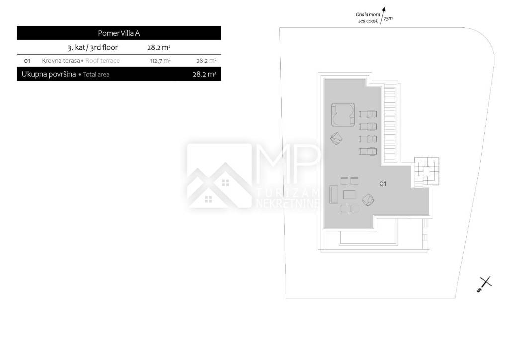 In an exceptional location in Pomer, just 75 meters from the sea, a modern and architecturally impressive detached villa with a total area of 332 m2 is for sale, situated on a spacious plot of 723 m2. The villa is spread over three floors and offers a high level of privacy, comfort and luxury with an open view of the sea.