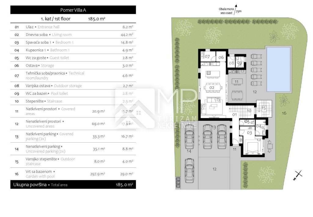 Ground floor – 185 m² - Entrance hall, spacious living room (44.2 m²), bedroom with bathroom, guest toilet, storage room + technical room, pool toilet, covered and uncovered terraces, swimming pool and landscaped garden (297.9 m²), covered and uncovered parking spaces
