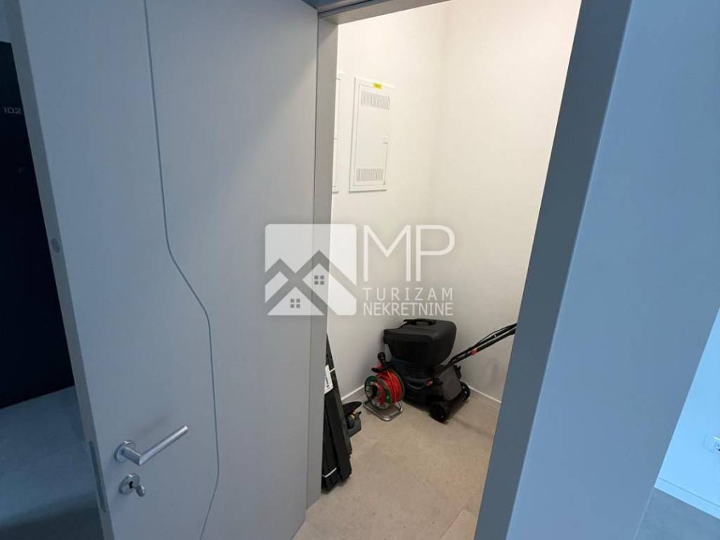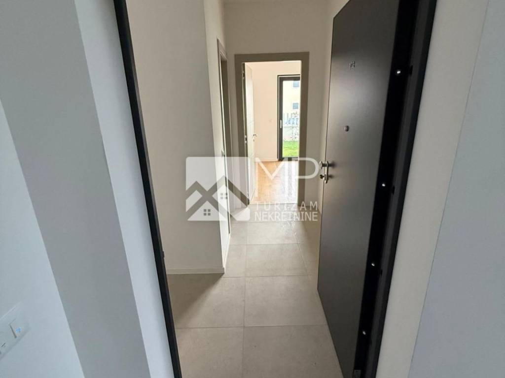 The apartment in question marked "101" – 55.90 m2 is located on the ground floor of the building, and consists of: entrance hall, living room + kitchen + dining room, two bedrooms and bathroom, and a spacious garden of about 200 m2, where the swimming pool is located.