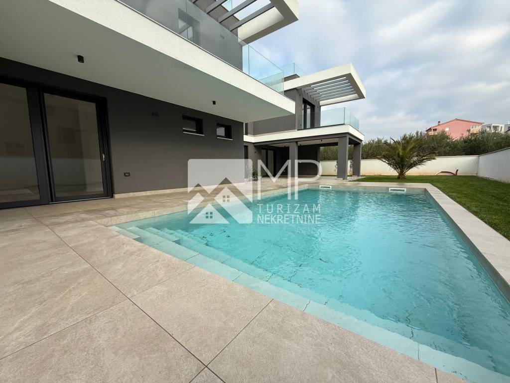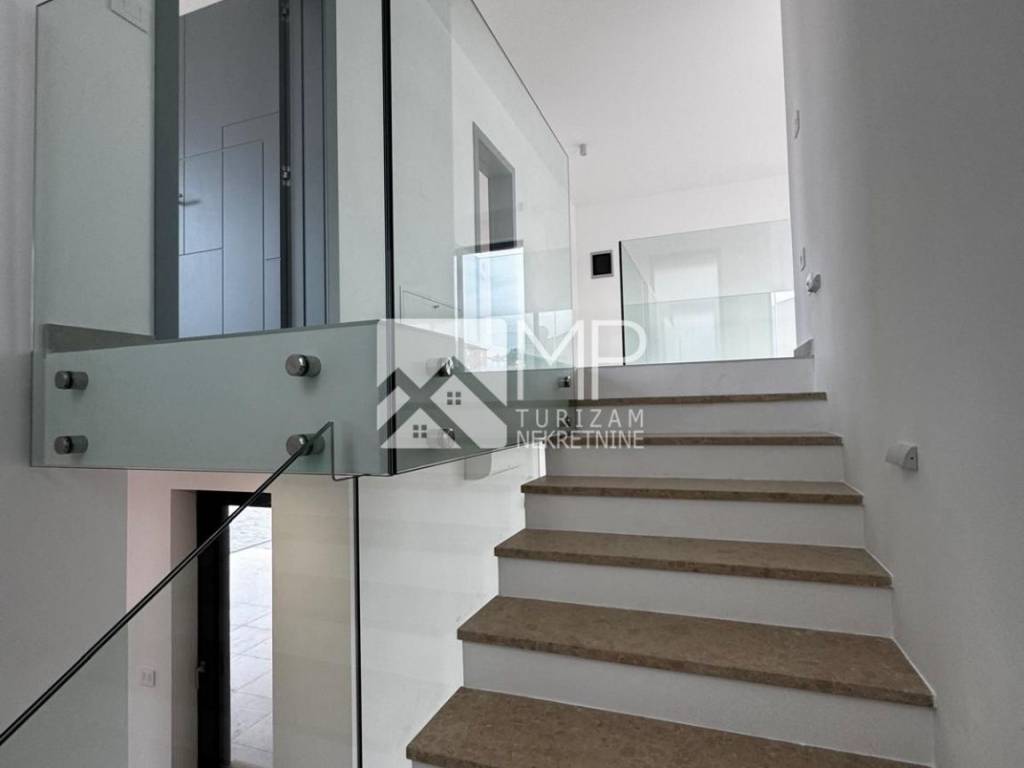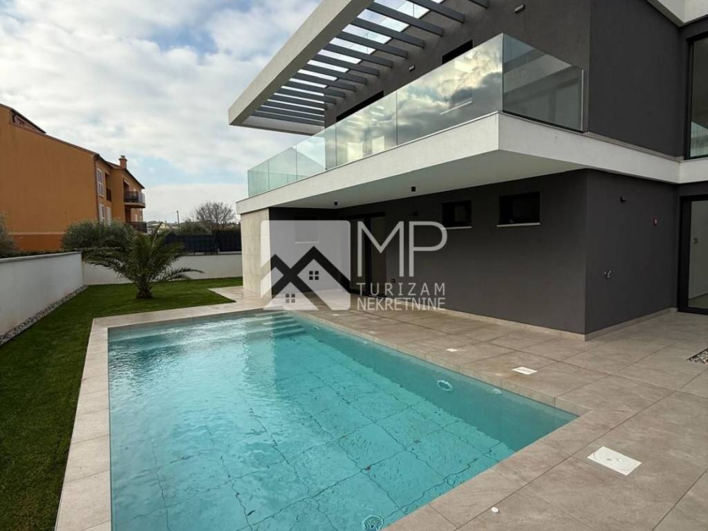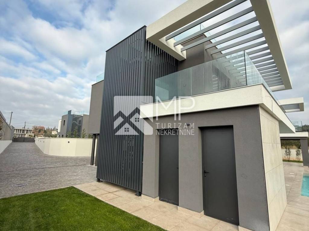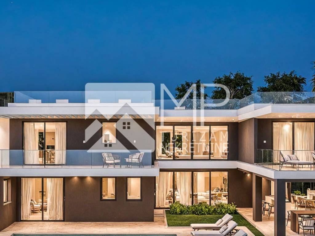 In an exceptional location in Pomer, just 50 meters from the sea, a modern and architecturally impressive detached villa with four spacious bedrooms, each with its own bathroom, plus two additional guest toilets, is for sale.