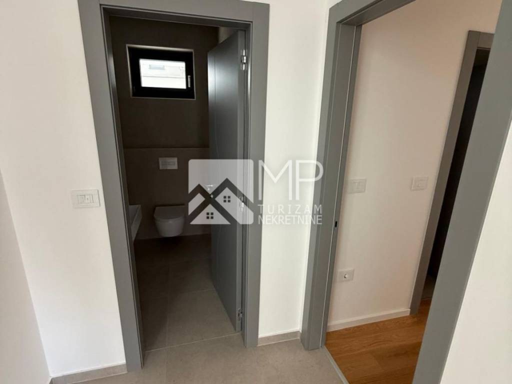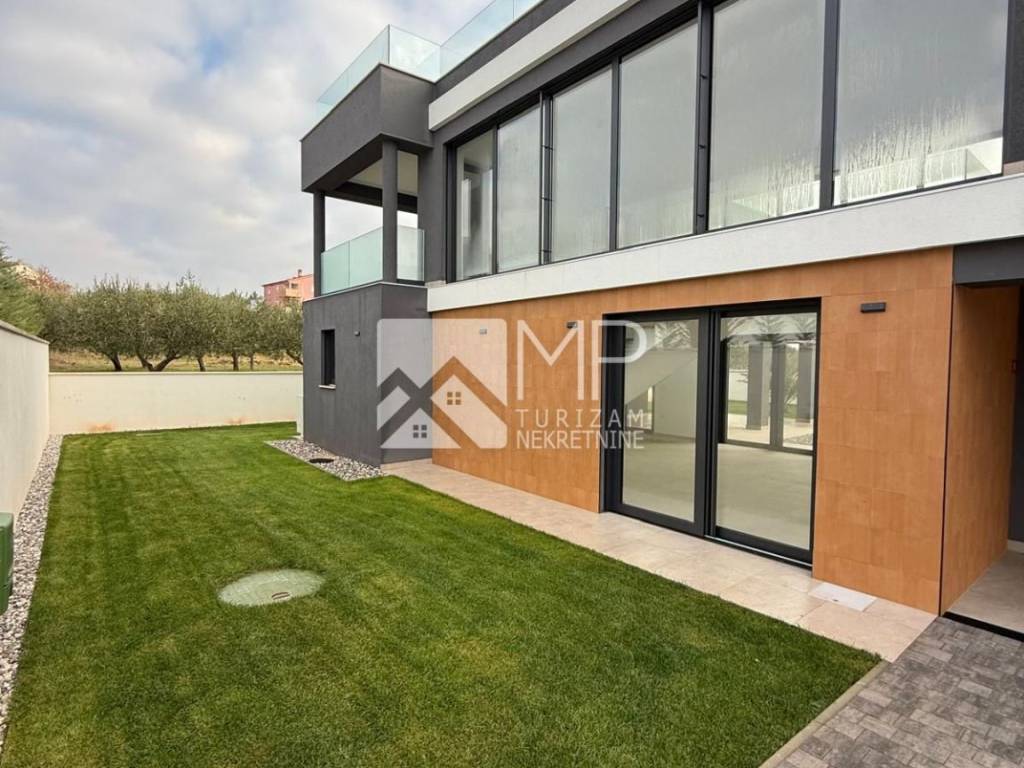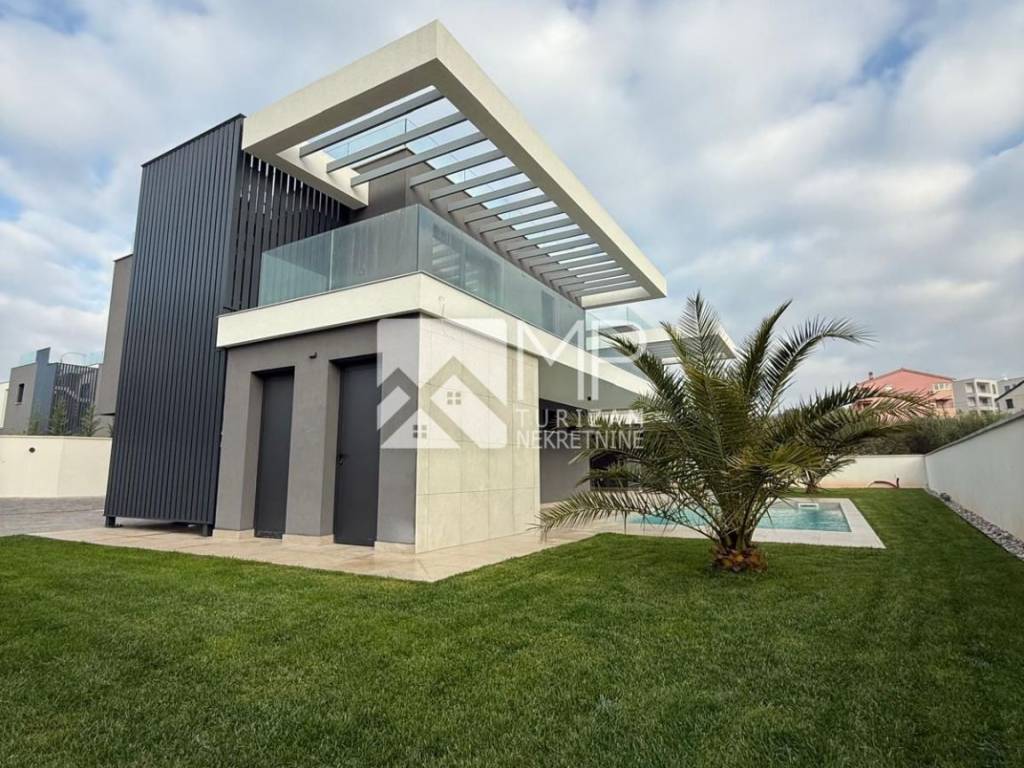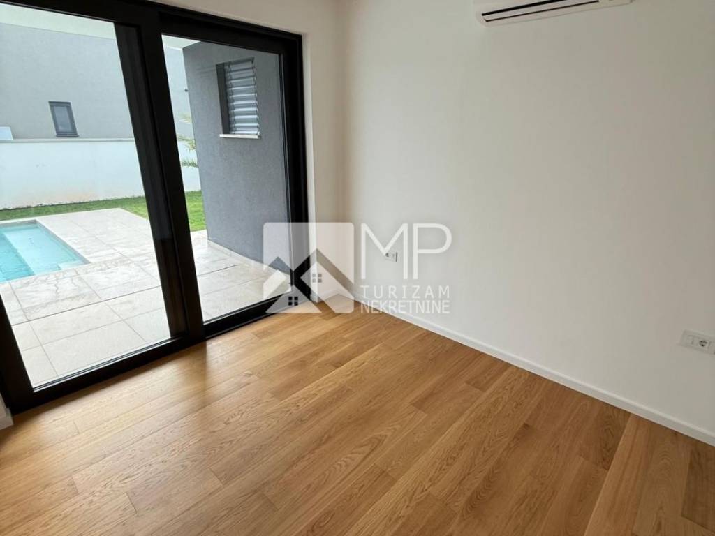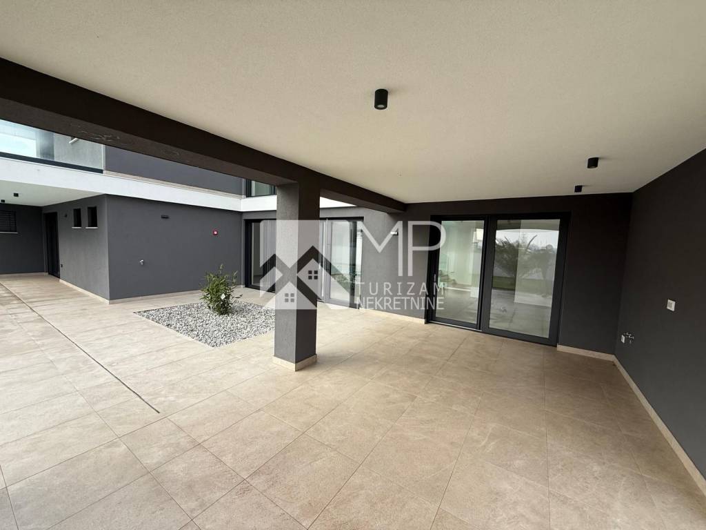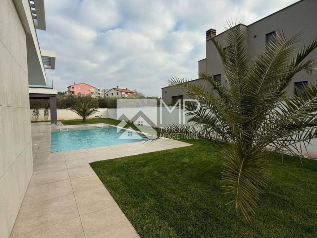 In an exceptional location in Pomer, just 50 meters from the sea, a modern and architecturally impressive detached villa with four spacious bedrooms, each with its own bathroom, plus two additional guest toilets, is for sale.