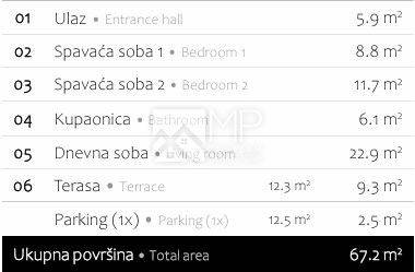 The apartment in question marked "201" – 55.40 m2 is located on the first floor of the building, and consists of: entrance hall, living room + kitchen + dining room, two bedrooms and bathrooms.