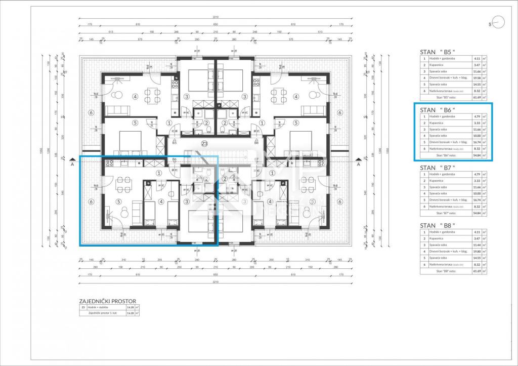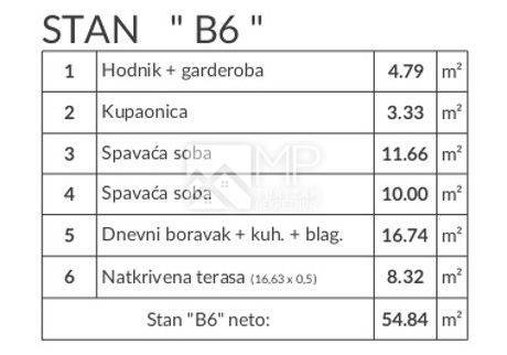 For sale is a functionally arranged two-bedroom apartment in a new building (designation: B6), with a total net area of 54.84 m², with an associated parking space PM3 (3.12 m²), which makes a total calculation area of 57.96 m².