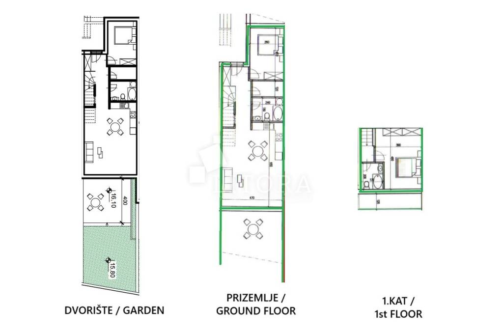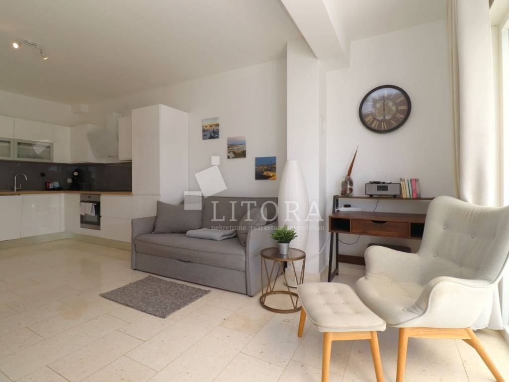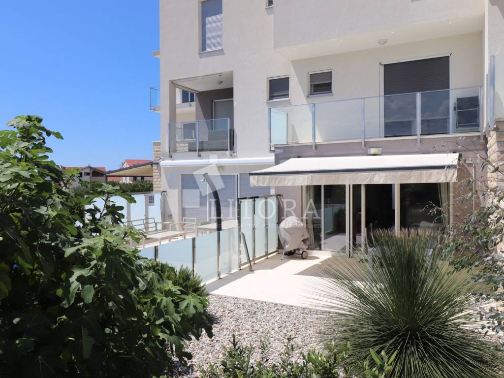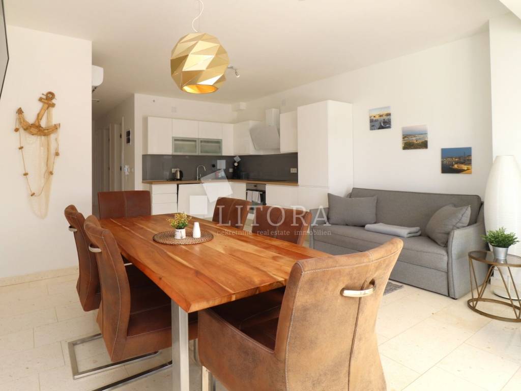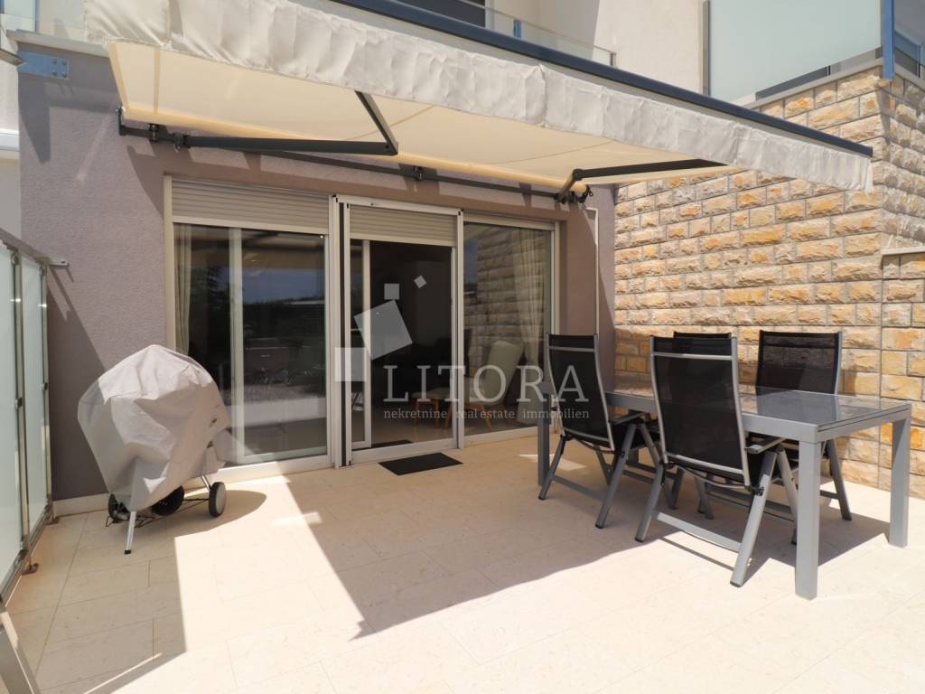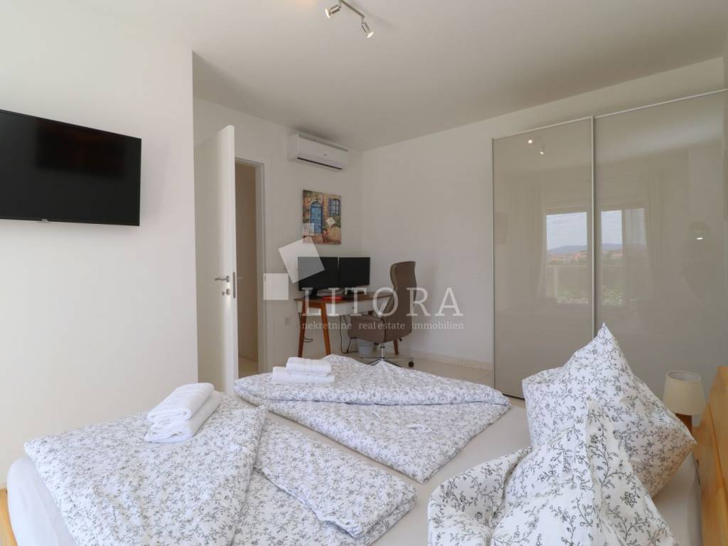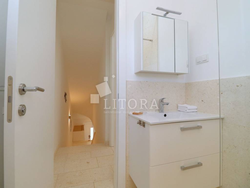 The apartment has a total usable area of 108.6 m², spread over two floors – ground floor and first floor – in a residential building. It is southeast-oriented and offers a sea view. The ground floor features an entrance hall, bathroom, bedroom, storage, kitchen with dining area, and living room with access to the paved terrace and garden. The terrace and garden together cover 50 m² and offer enough space for a small pool or jacuzzi. The first floor includes one bedroom, a hallway, second bathroom and terrace. Has one parking place. The apartment is fully furnished, and the furniture is included in the price. It is equipped with underfloor heating throughout, air conditioning for heating and cooling in all rooms, 10 cm thermal insulation, electric shutters, and natural stone flooring in all areas. The beach “Sinje More” is 550 m away, and the town center is 900 m away.