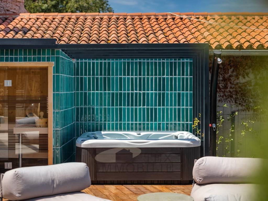 The centerpiece of the garden is a heated swimming pool with an automatic saltwater and pH regulation system. Next to the pool, there is a sauna, a covered whirlpool, and a technical room. A fully equipped summer kitchen with a gas grill is perfect for social gatherings, while below the pool level, an intimate lounge area with a fireplace/fire pit offers a cozy atmosphere for evening relaxation.
