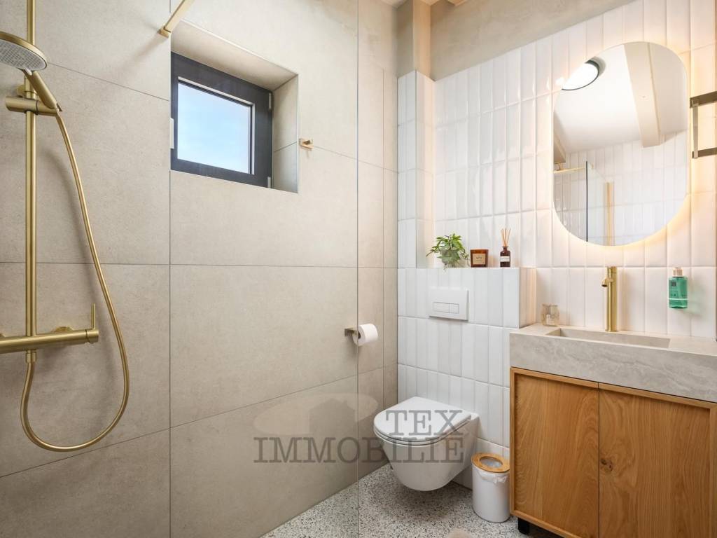 On the ground floor, there is a spacious and bright living room connected to the dining area, ideal for relaxation and socializing. A guest WC is also located on this level. From the living area, there is access to an enclosed summer room / winter veranda, separated by a modern metal-glass wall that can be fully opened, seamlessly connecting the interior with the terrace and outdoor area.