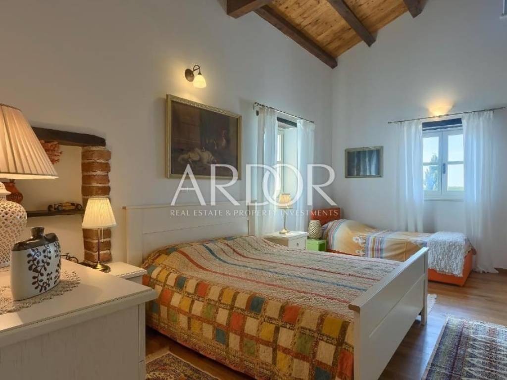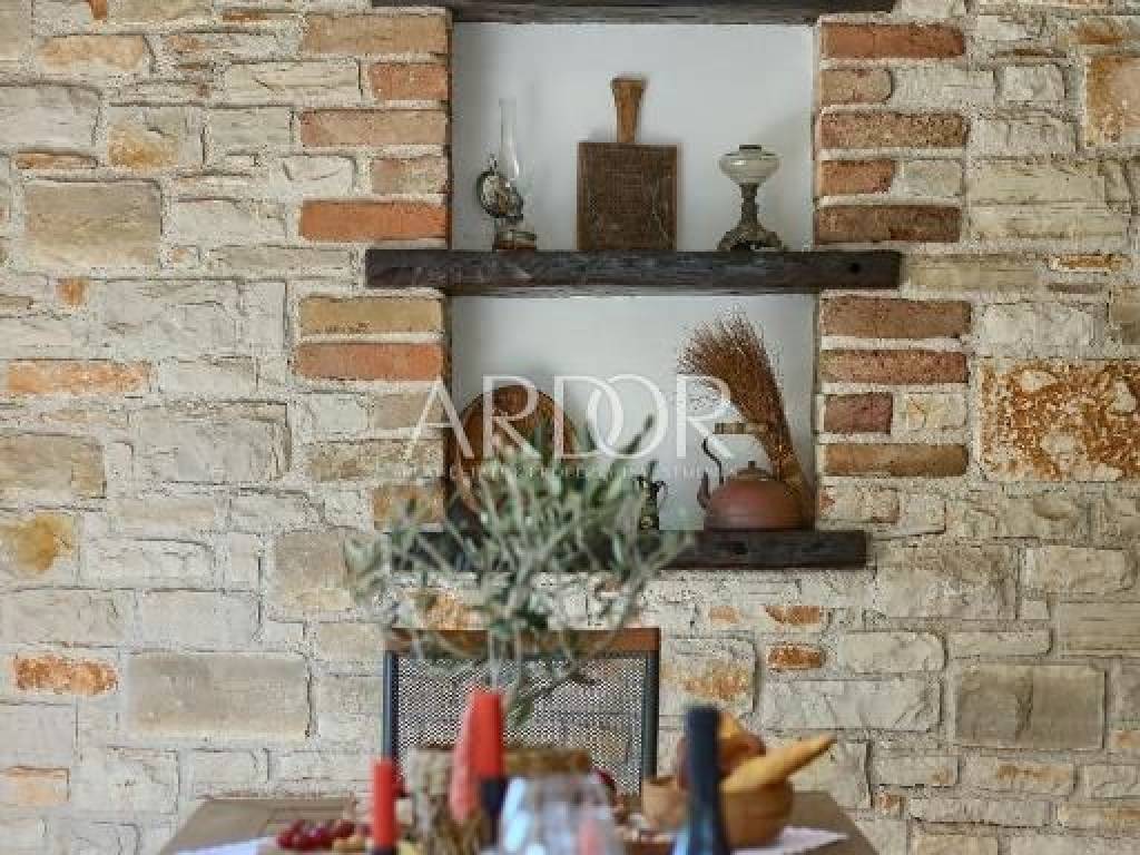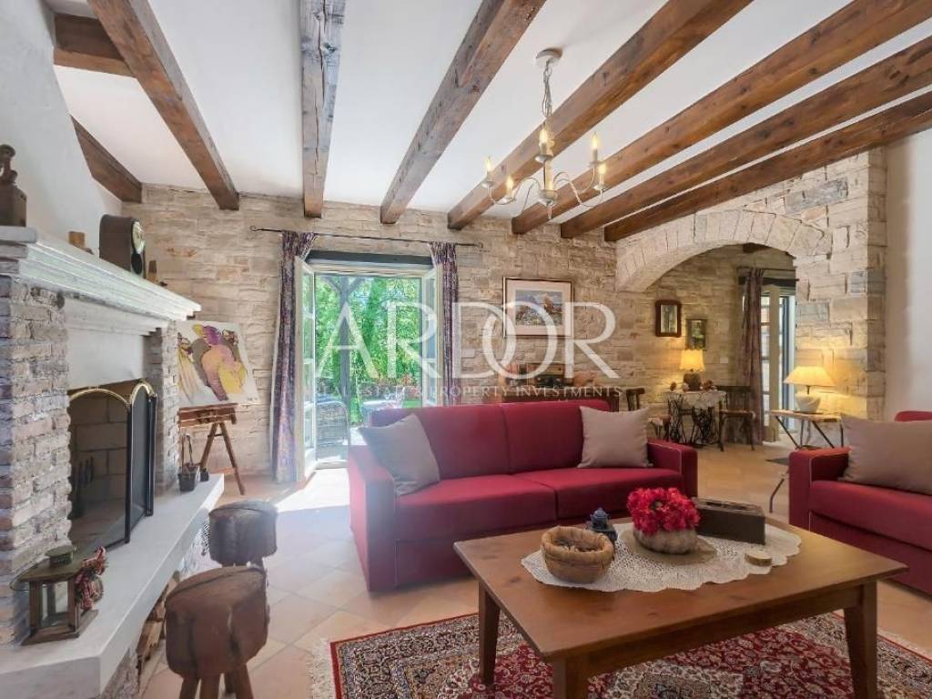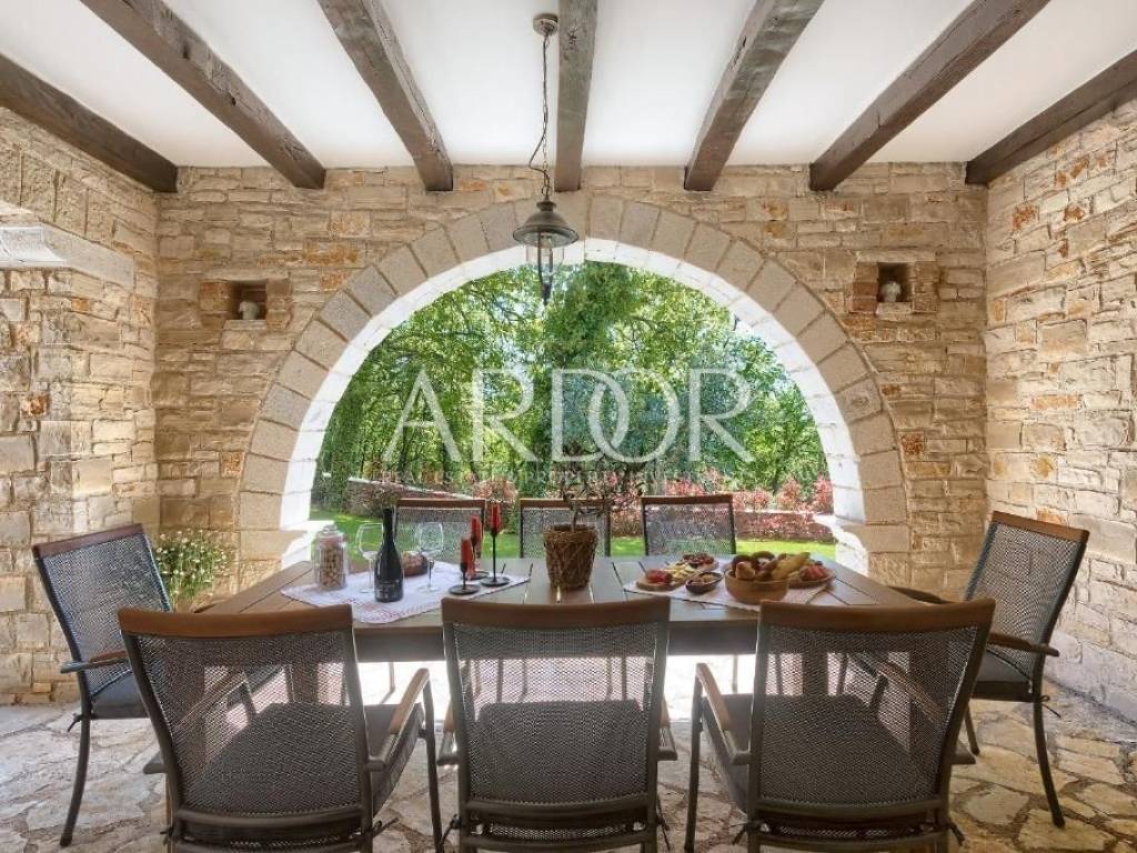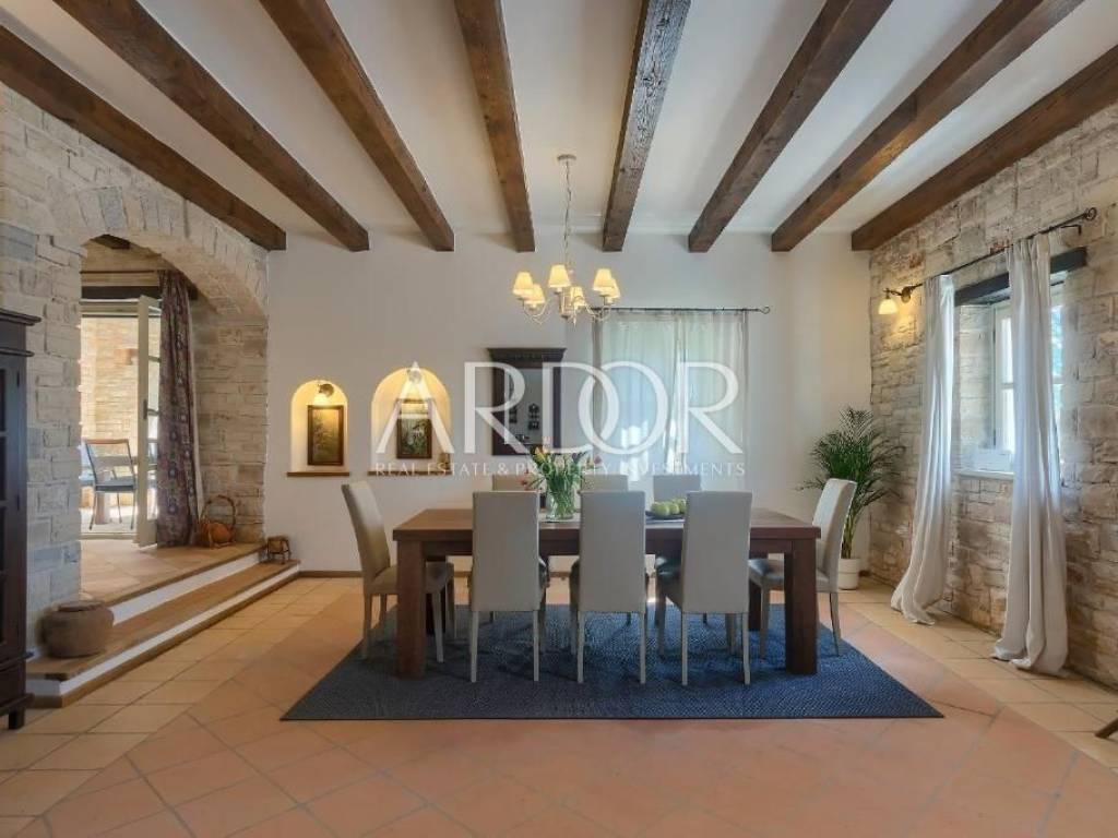 Istra, we are mediating the sale of an enchanting luxury stone villa located near Tinjan. This small and charming place is located just a few minutes from the main road, 15 minutes from Poreč and 25 minutes from Rovinj, which is one of the most beautiful and most visited Croatian cities. The stone villa consists of the ground floor and the first floor and has a total of 280 m2. The square footage of the entire land is 1112 m2. On the ground floor there is a spacious dining room, kitchen, toilet and a wonderful living room with a fireplace that contributes to a warm and pleasant atmosphere. On the first floor there is a spacious covered terrace with a beautiful view and three large bedrooms. Each room has its own bathroom with a shower, bathtub and two sinks. The yard is 878 m2 and consists of a beautiful lawn surrounding the entire house, two olive trees, a 37 m2 swimming pool, a terrace for spending time with family and friends, a summer kitchen and a toilet. The house also has an automatic gate, behind which there is a large parking lot with two covered parking spaces plus four more parking spaces that are not covered. The house is located in a very quiet location and is surrounded by a forest that gives you peace and privacy. An exclusive opportunity for a unique Istrian beauty.