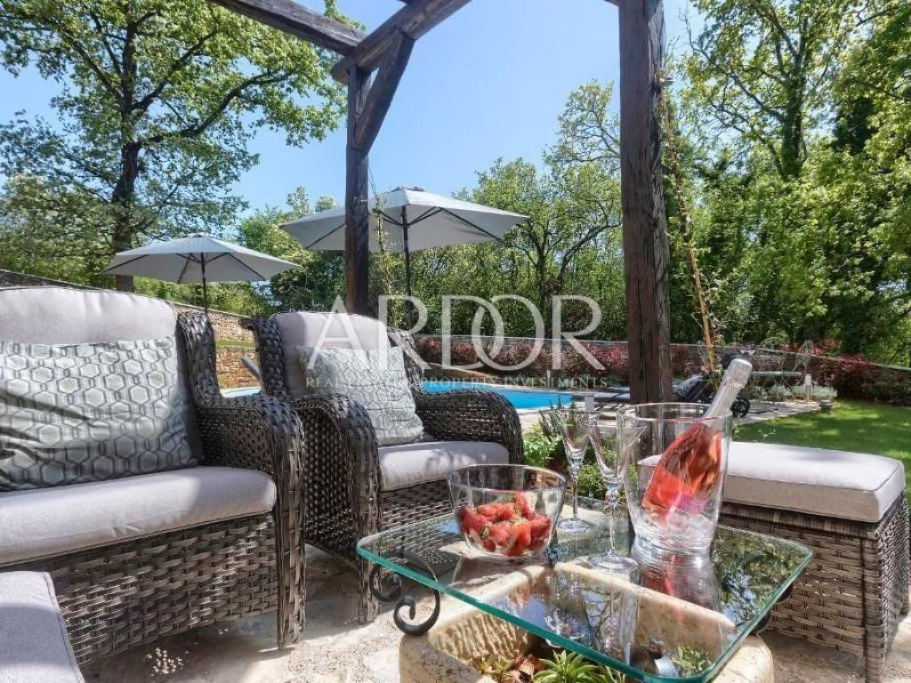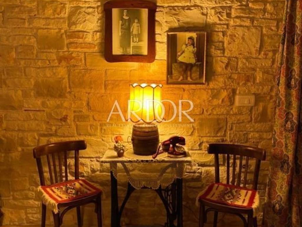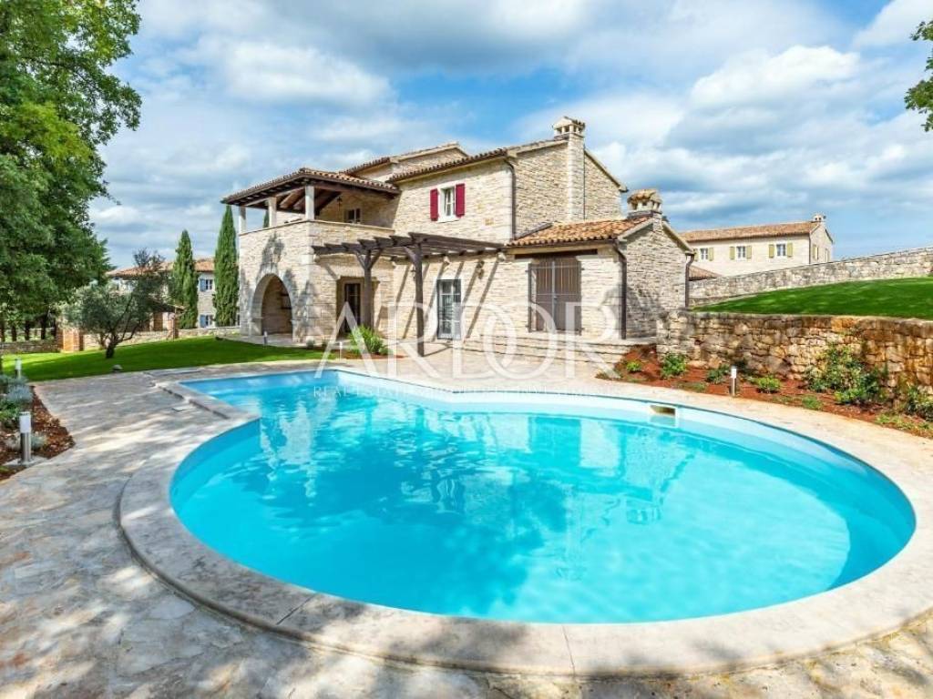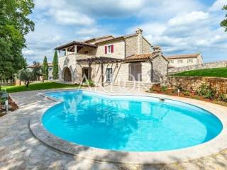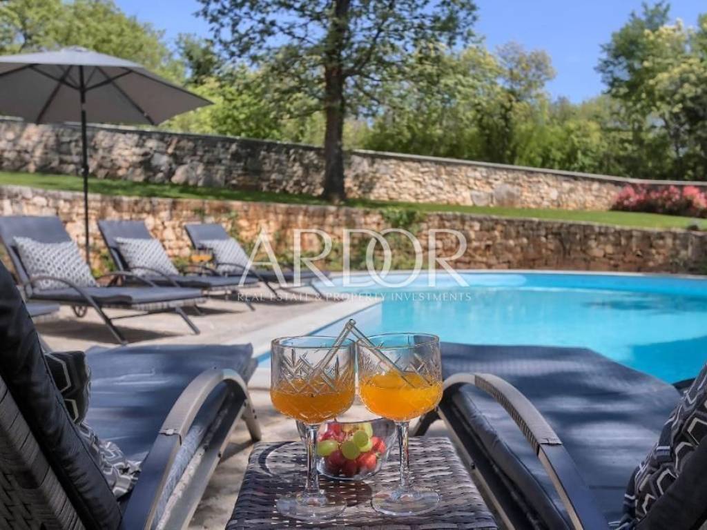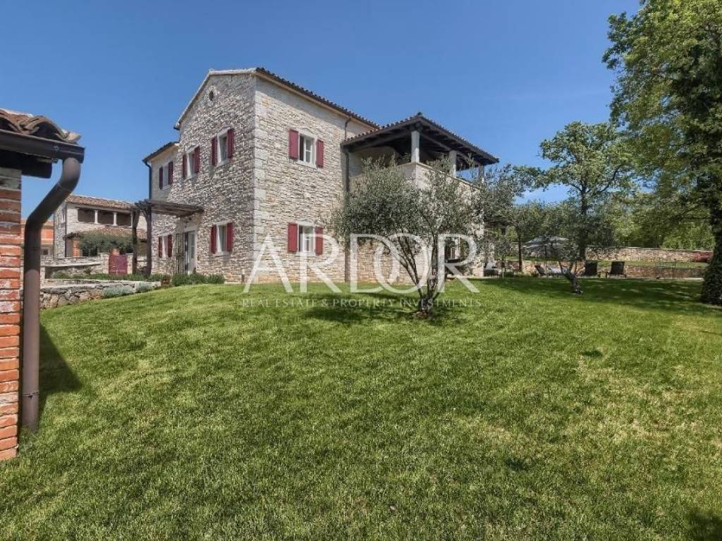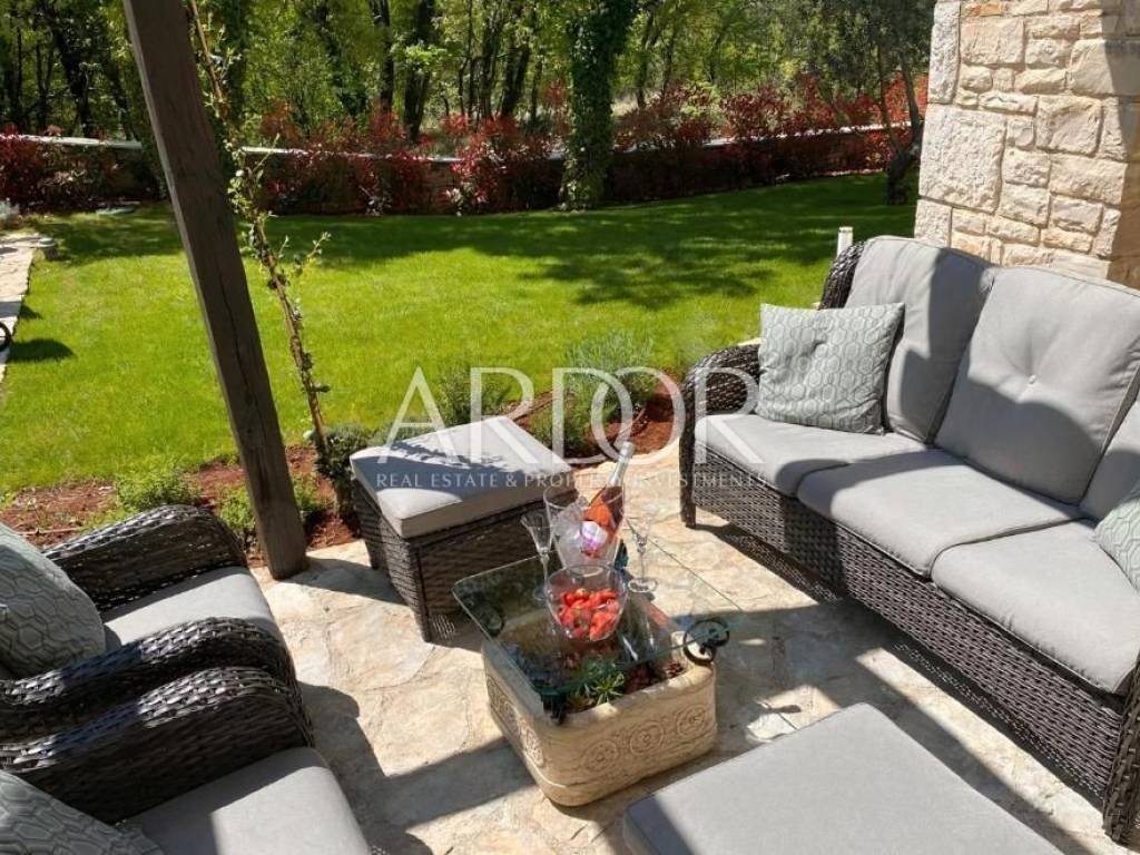 Istra, we are mediating the sale of an enchanting luxury stone villa located near Tinjan. This small and charming place is located just a few minutes from the main road, 15 minutes from Poreč and 25 minutes from Rovinj, which is one of the most beautiful and most visited Croatian cities. The stone villa consists of the ground floor and the first floor and has a total of 280 m2. The square footage of the entire land is 1112 m2. On the ground floor there is a spacious dining room, kitchen, toilet and a wonderful living room with a fireplace that contributes to a warm and pleasant atmosphere. On the first floor there is a spacious covered terrace with a beautiful view and three large bedrooms. Each room has its own bathroom with a shower, bathtub and two sinks. The yard is 878 m2 and consists of a beautiful lawn surrounding the entire house, two olive trees, a 37 m2 swimming pool, a terrace for spending time with family and friends, a summer kitchen and a toilet. The house also has an automatic gate, behind which there is a large parking lot with two covered parking spaces plus four more parking spaces that are not covered. The house is located in a very quiet location and is surrounded by a forest that gives you peace and privacy. An exclusive opportunity for a unique Istrian beauty.