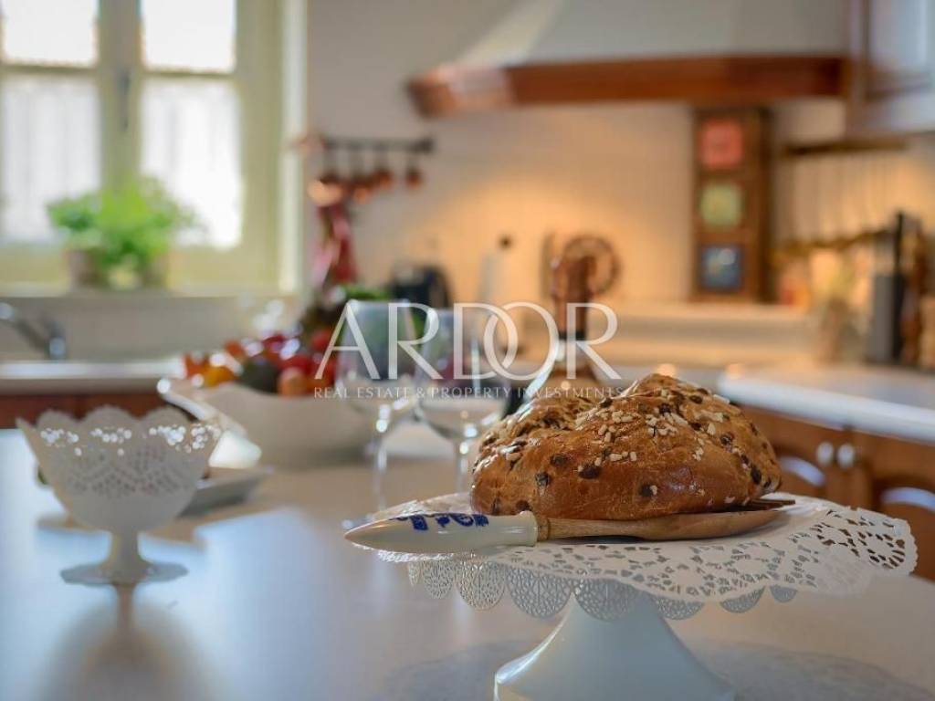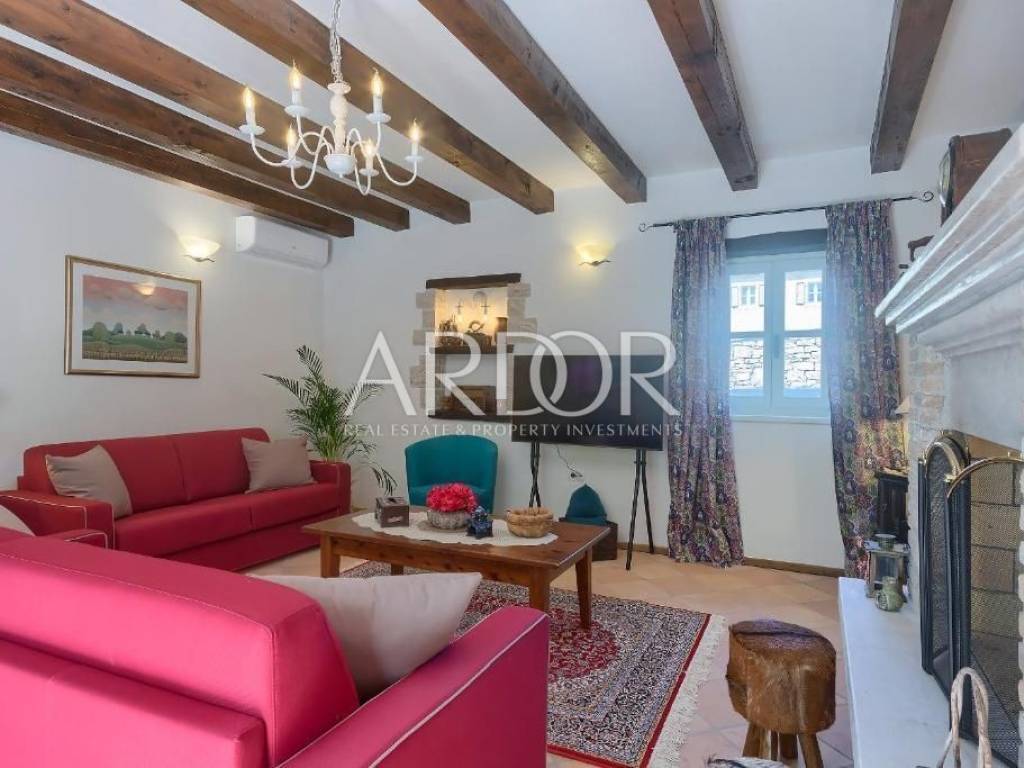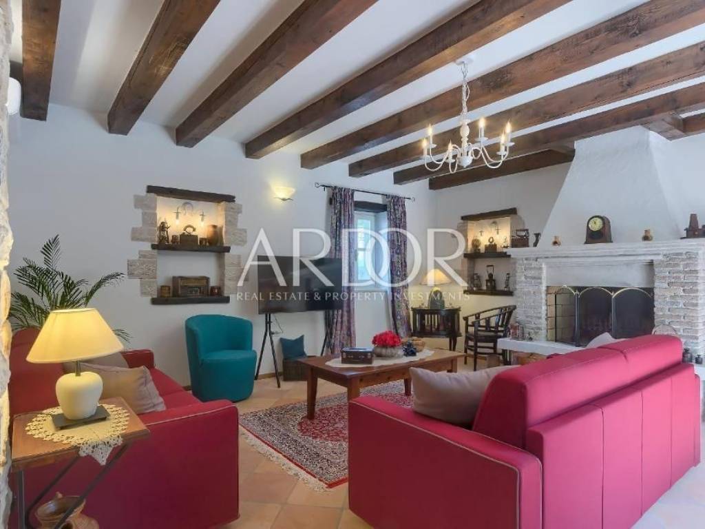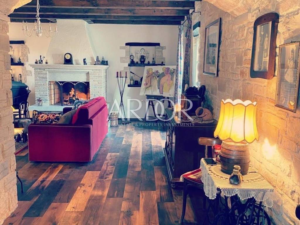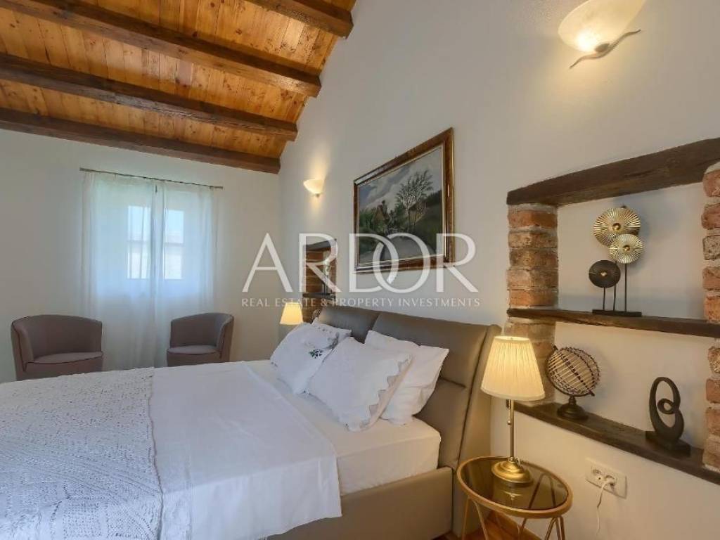 Istra, we are mediating the sale of an enchanting luxury stone villa located near Tinjan. This small and charming place is located just a few minutes from the main road, 15 minutes from Poreč and 25 minutes from Rovinj, which is one of the most beautiful and most visited Croatian cities. The stone villa consists of the ground floor and the first floor and has a total of 280 m2. The square footage of the entire land is 1112 m2. On the ground floor there is a spacious dining room, kitchen, toilet and a wonderful living room with a fireplace that contributes to a warm and pleasant atmosphere. On the first floor there is a spacious covered terrace with a beautiful view and three large bedrooms. Each room has its own bathroom with a shower, bathtub and two sinks. The yard is 878 m2 and consists of a beautiful lawn surrounding the entire house, two olive trees, a 37 m2 swimming pool, a terrace for spending time with family and friends, a summer kitchen and a toilet. The house also has an automatic gate, behind which there is a large parking lot with two covered parking spaces plus four more parking spaces that are not covered. The house is located in a very quiet location and is surrounded by a forest that gives you peace and privacy. An exclusive opportunity for a unique Istrian beauty.