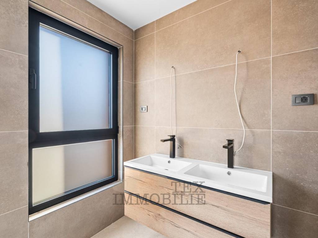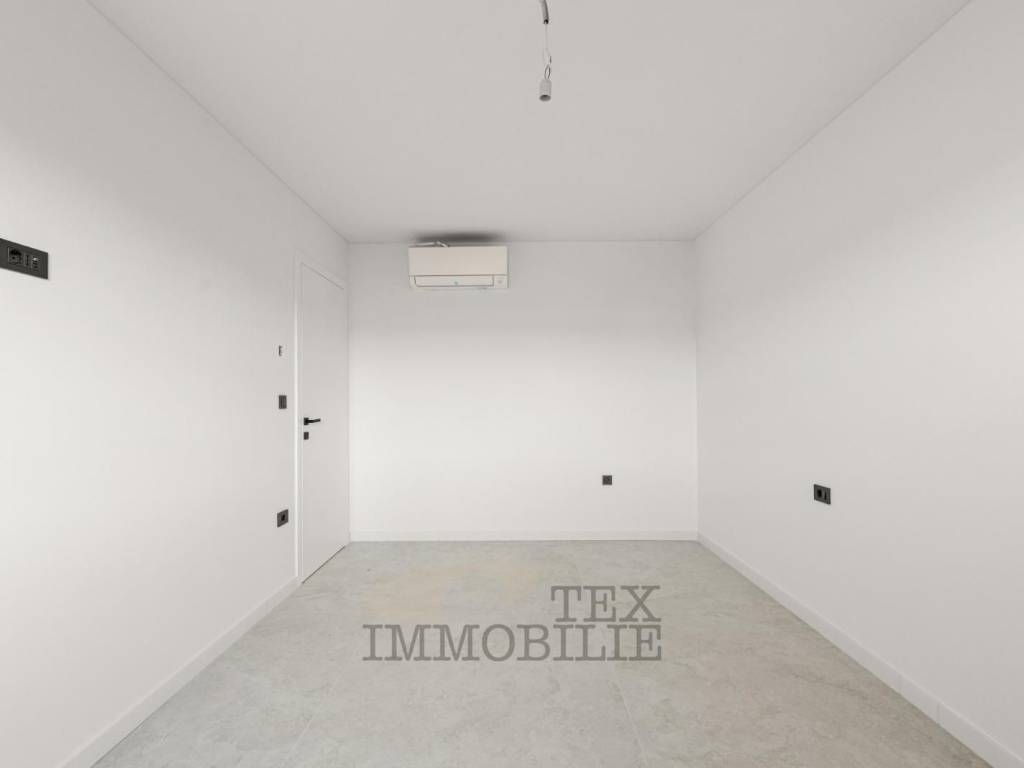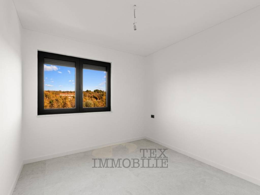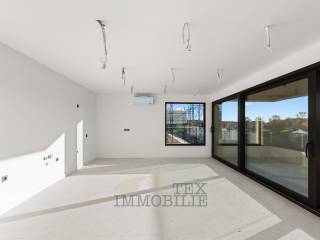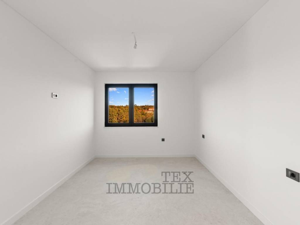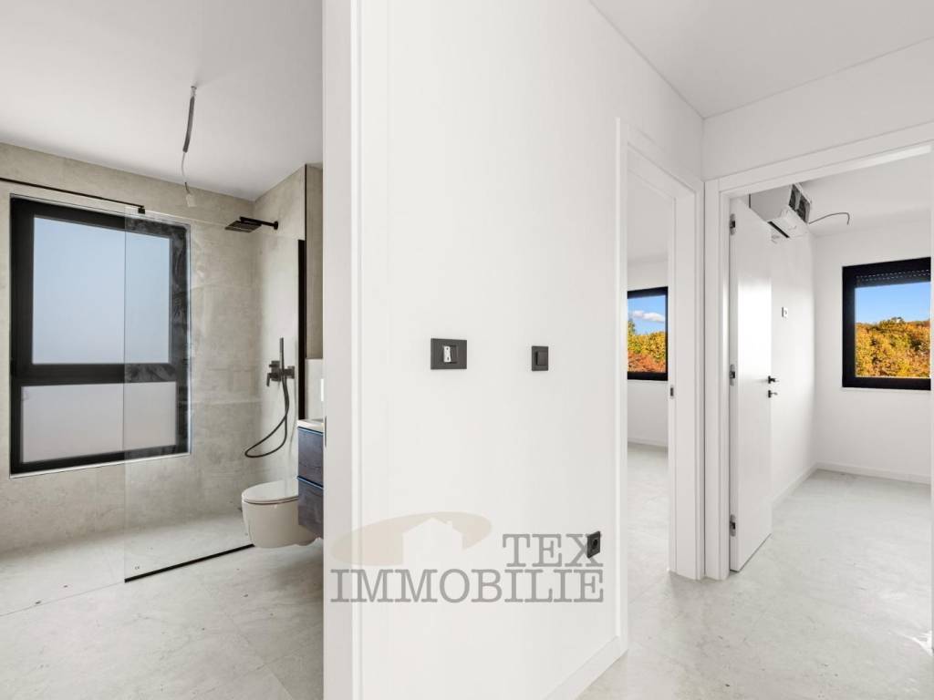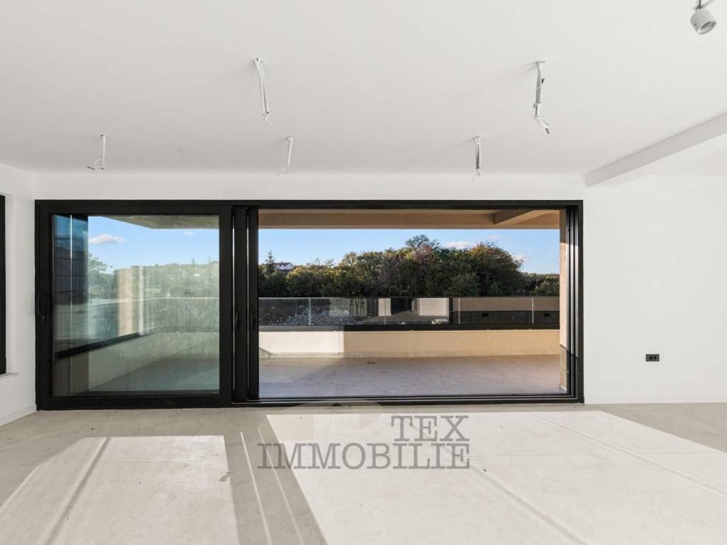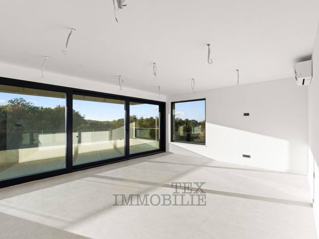 A luxurious penthouse located on the second floor of a modern residential building, comprising only five exceptionally designed residential units, is for sale. It is situated in a quiet and peaceful area, just 2500 meters away from the Adriatic Sea coast, while also being 2500 meters away from the town of Poreč.