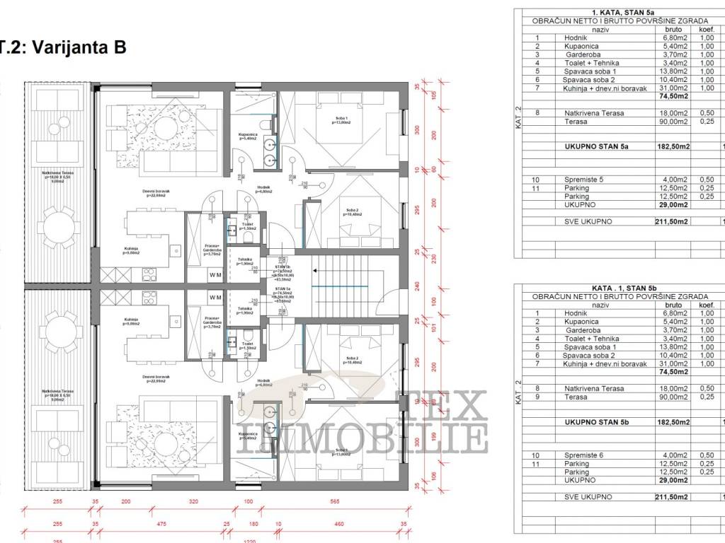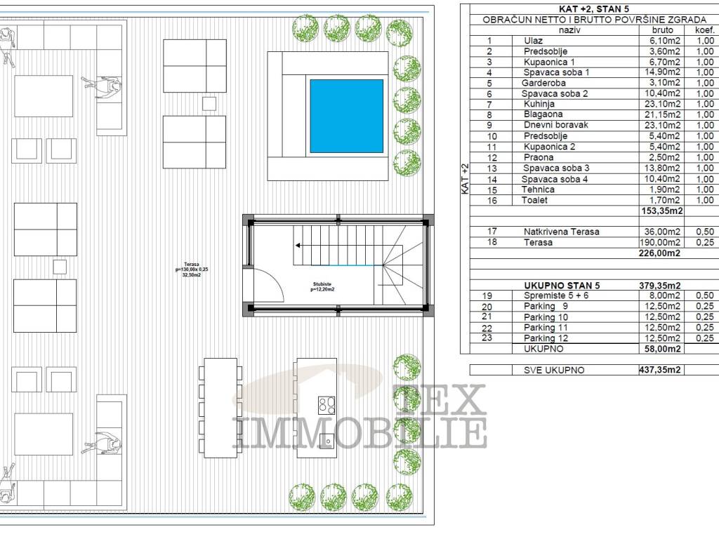 This spacious penthouse impresses with an exceptionally smart and functional layout. It consists of a spacious living room, a modernly equipped kitchen, and a roomy dining area, totaling 67.36 m2, a large terrace of 36 m2, four bedrooms, and practical additional spaces such as a laundry room, a boiler room/technical room with central heating, and additional toilet and two bathrooms.