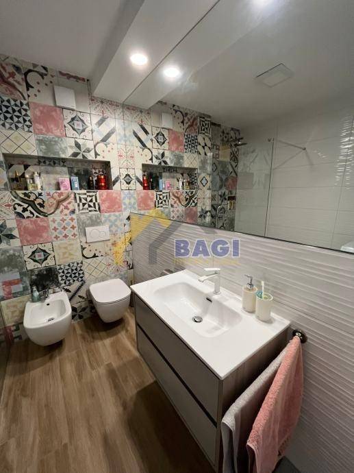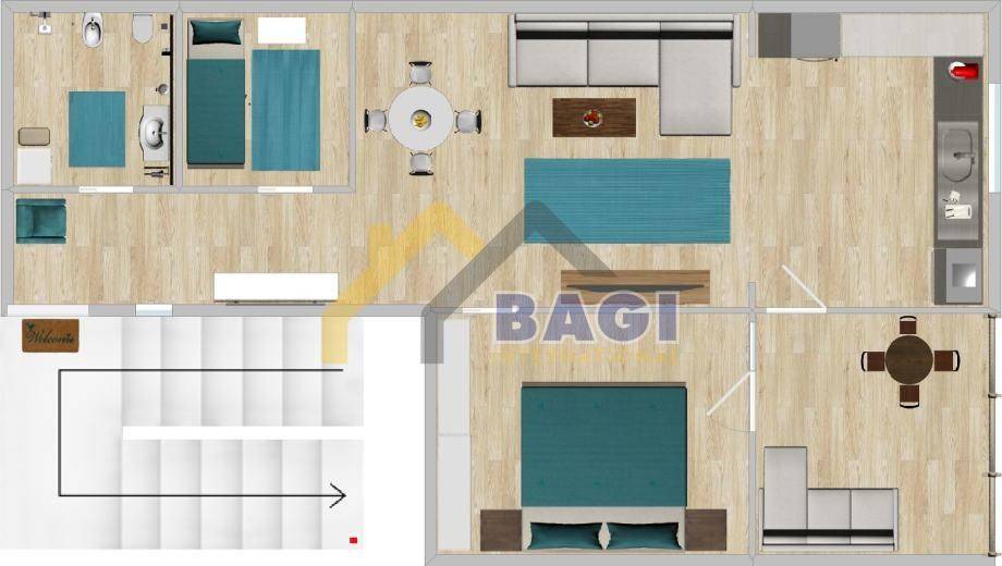 We are selling a richly furnished, newly renovated apartment on the first floor of a smaller building, in a quiet family neighborhood. The apartment consists of a bathroom, a hallway, 2 bedrooms, a large living room + kitchen, and a large terrace. The apartment has underfloor gas heating and air conditioning. The apartment has everything you need for everyday life and is therefore ready for immediate occupancy. The apartment comes with one parking space in the yard and a storage room in the basement. The apartment is sold fully furnished.