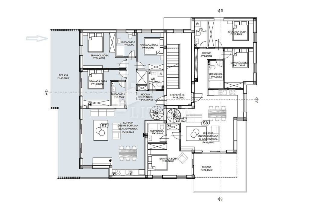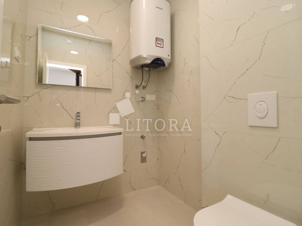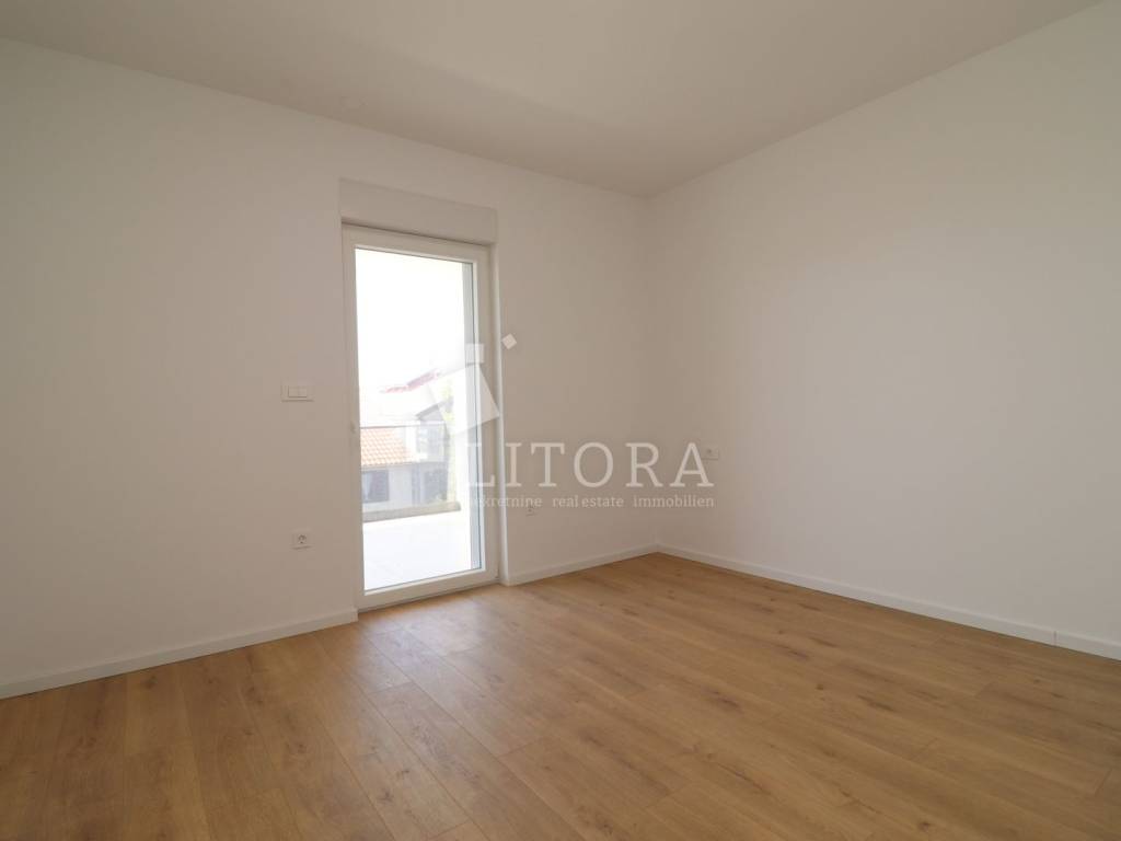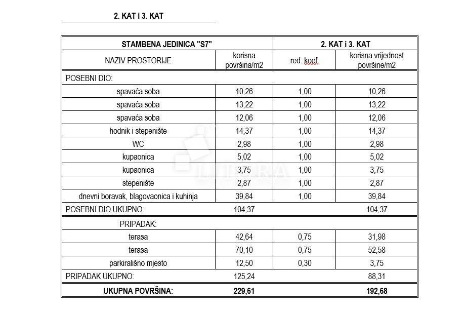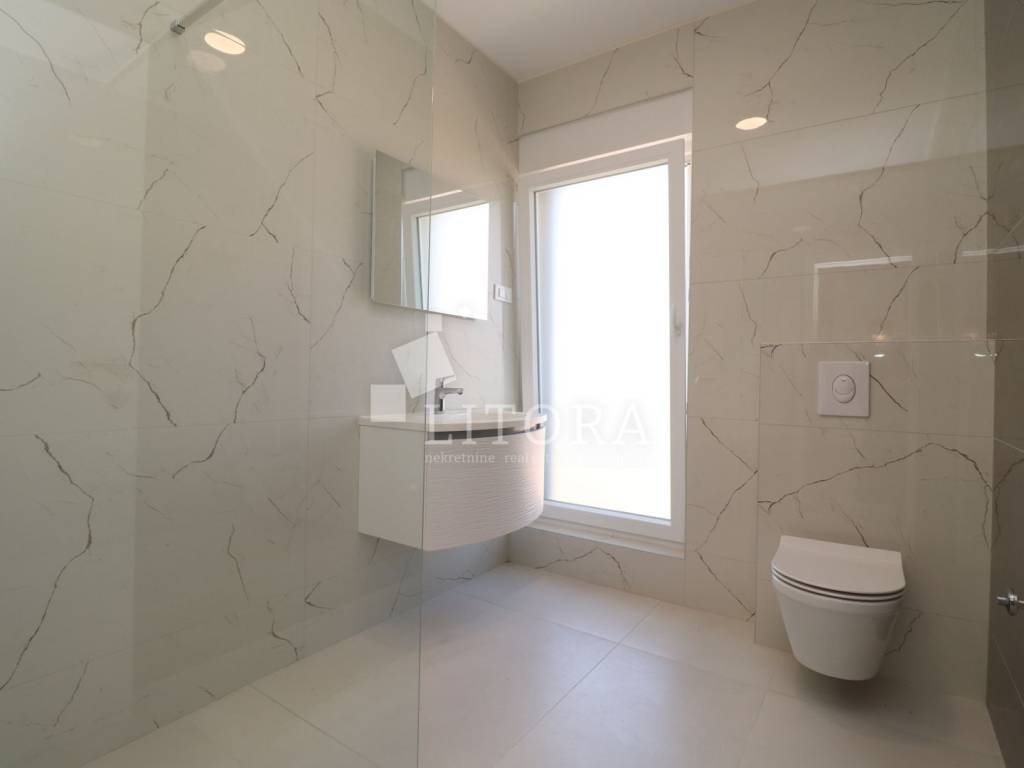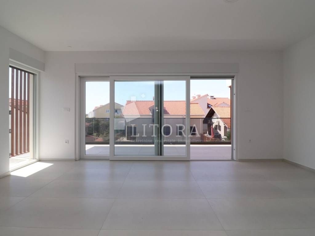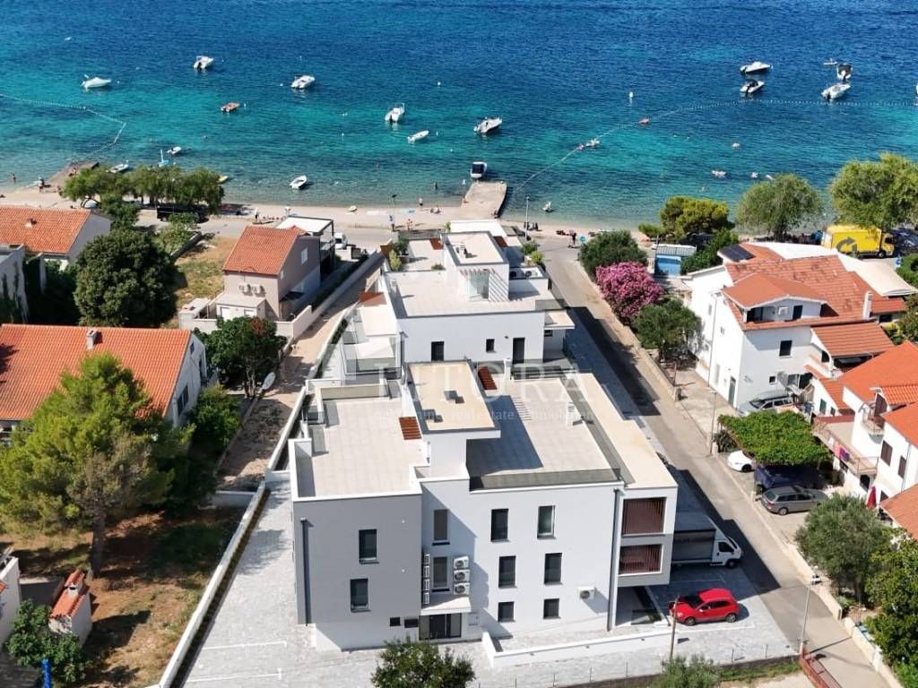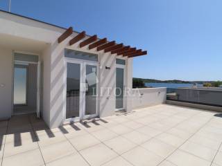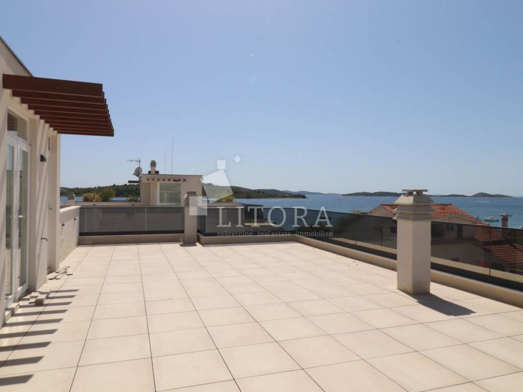 The apartment is located in a newly built residential building, positioned in the second row from the sea. The total usable area is 192.68 m² and it spans the second and third floors of the building. It is oriented toward the southwest. On the lower level (2nd floor), there is an entrance hall, guest WC, hallway, three bedrooms, two bathrooms, and a spacious kitchen with dining area and living room, with access to a covered terrace of 42.64 m² offering a sea view. From the living room, spiral stairs lead to the upper level (3rd floor), where you'll find a spacious rooftop terrace of 107,81m2 with infrastructure, an additional guest WC, and a stunning panoramic view of the sea, beach, and the island of Prvić. The apartment is ready to move into and is equipped with a chimney connection, underfloor heating in the bathroom, electric roller shutters, insect screens, and thermal façade insulation. One outdoor parking space is included with the apartment.